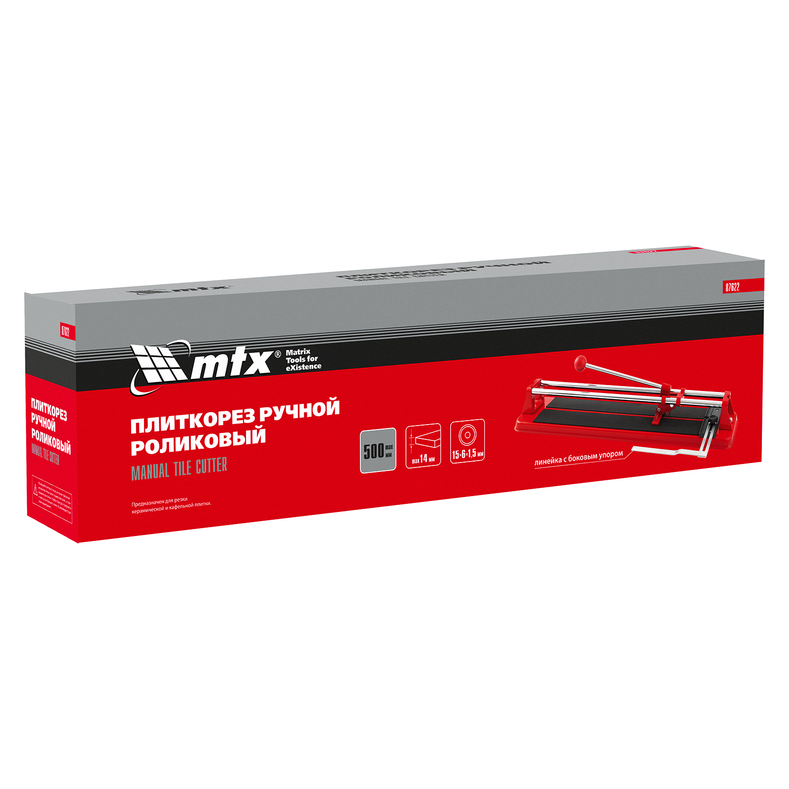 <p>Плиткорез MTX 87622 — инструмент для работы с керамической плиткой размером до 500 х 14 мм. Упрощает и ускоряет резку, позволяет получать ровный и аккуратный срез.</p><h2>Преимущества</h2><ul><li>Высокий ресурс — режущий ролик изготовлен из твердосплавного материала ВК-8.</li><li>Возможность фиксации на поверхности рабочего стола — в основании плиткореза имеются специальные отверстия.</li><li>Плавный ход — каретка свободно передвигается благодаря двум направляющим из высококачественной инструментальной стали с антикоррозийным покрытием.</li><li>Высокое качество работы — стальное основание обеспечивает устойчивость плиткореза, мягкие амортизирующие накладки предотвращают смещение плитки.</li><li>Комфортная работа — на рукоятке имеется специальный захват.</li></ul>