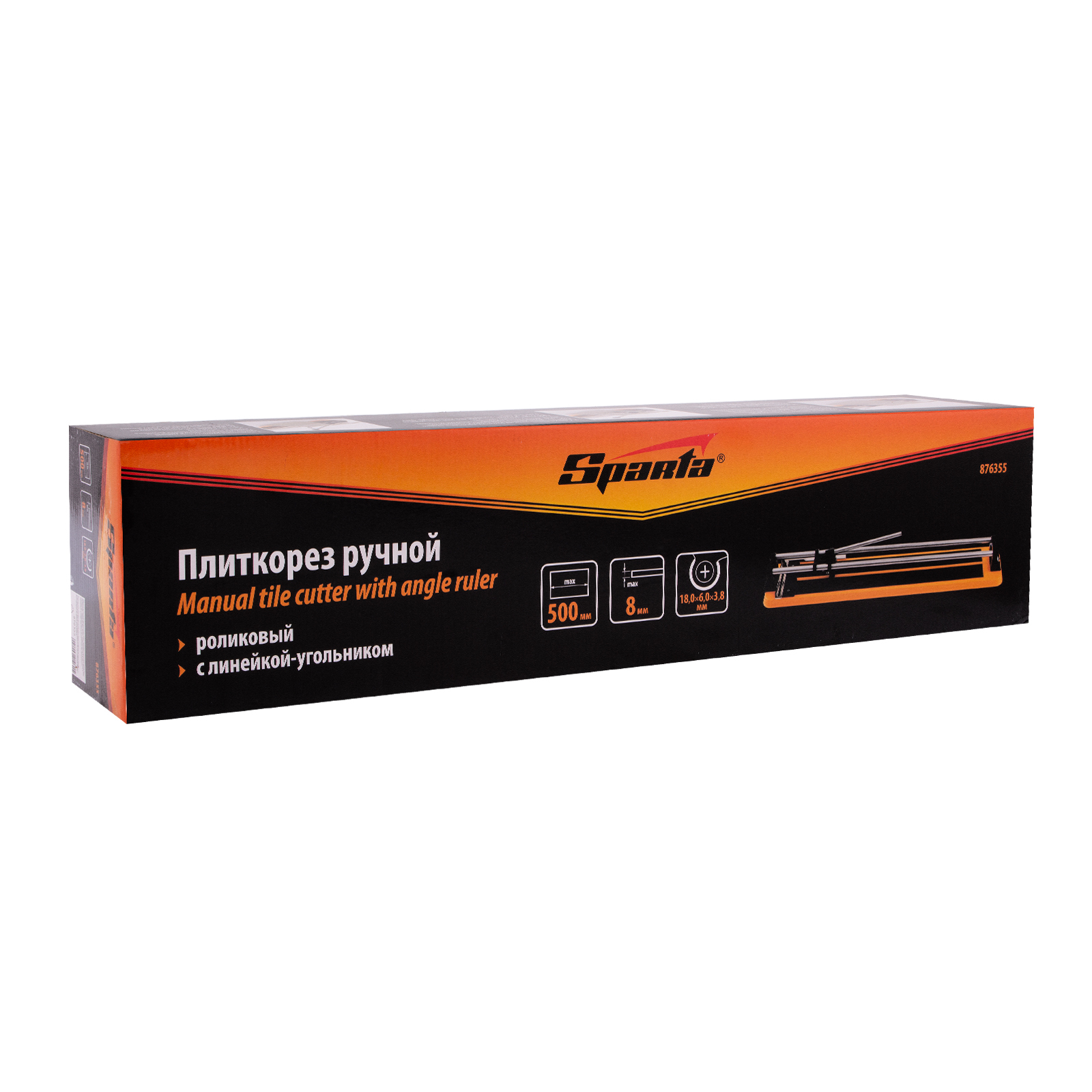<p>Роликовый плиткорез Sparta 876355 — ручной инструмент для резки керамической плитки длиной до 500 мм и толщиной до 8 мм. Используется во время проведения отделочных работ.</p><h2>Преимущества</h2><ul><li>Высокий ресурс — режущий ролик из карбида вольфрама отличается износостойкостью, цельностальные направляющие хромированы для защиты от коррозии.</li><li>Точность выполняемых работ — металлическая линейка-угольник облегчает позиционирование плитки на станине, твердосплавный режущий ролик обеспечивает аккуратный рез.</li><li>Комфортная эксплуатация — мягкие амортизирующие накладки препятствуют скольжению плитки.</li></ul>