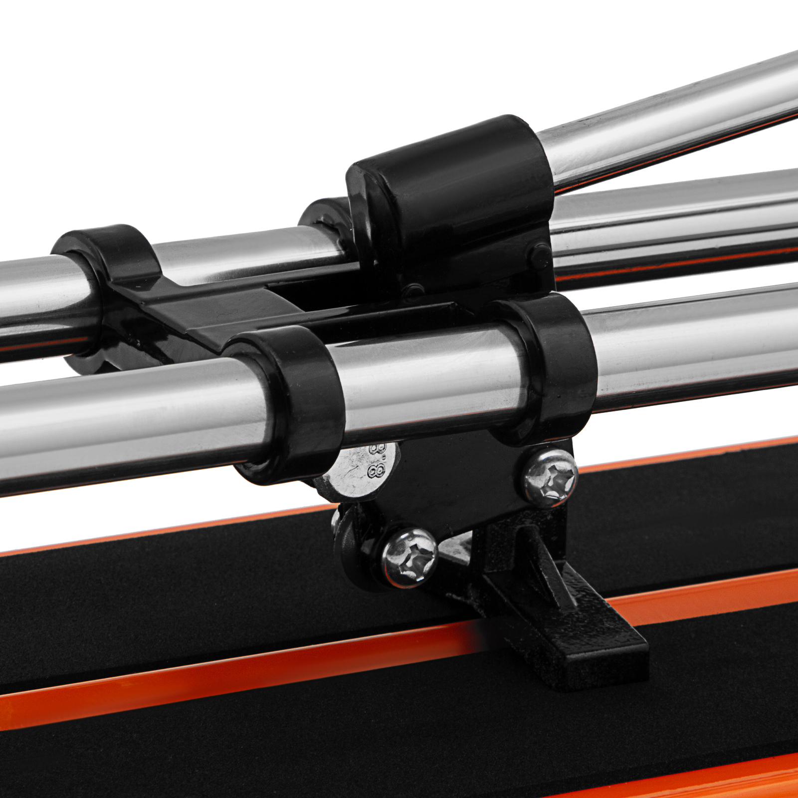 - Точность выполняемых работ — металлическая линейка-угольник облегчает позиционирование плитки на станине, твердосплавный режущий ролик обеспечивает аккуратный рез.