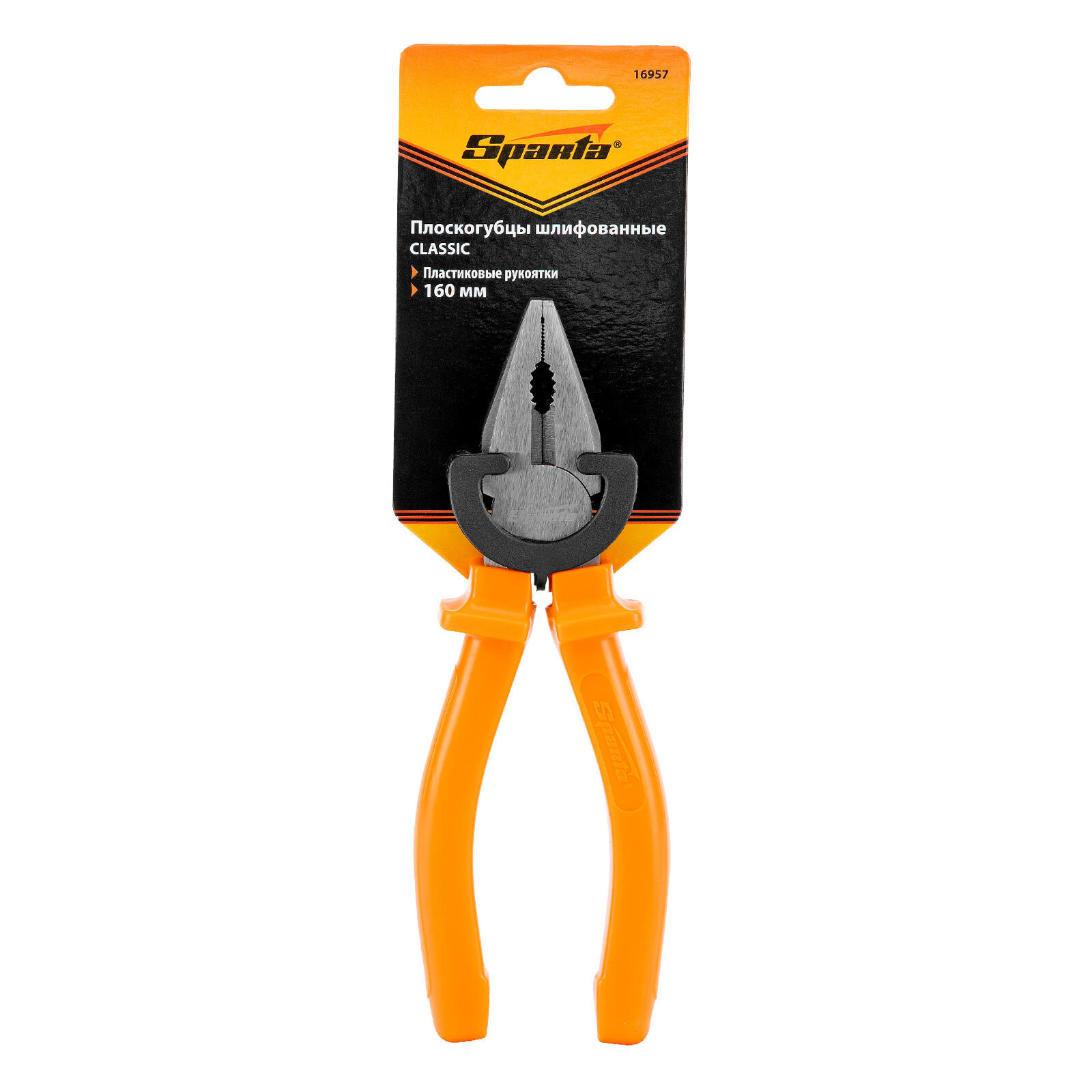 <p>Шлифованные плоскогубцы Sparta Classic 16957 длиной 160 мм, с пластмассовыми рукоятками, позволяют удерживать, сгибать или выравнивать различные предметы. Губки со специальными выемками позволяют захватывать круглые детали, а режущие кромки легко перекусывают проволоку и провода. Плоскогубцы используются для решения профессиональных и бытовых задач.</p><h2>Преимущества</h2><ul><li>Прочность и долговечность — рабочие части изготовлены из углеродистой стали 45 и отшлифованы.</li><li>Эффективная работа — режущие кромки, закаленные токами высокой частоты до 53 HRC, справляются с твердой проволокой без потери остроты.</li><li>Устойчивость к деформации при высоких нагрузках — твердость зажимных частей составляет 45,5 HRC.</li><li>Эргономичность — пластиковые рукоятки снабжены упорами для пальцев.</li></ul>