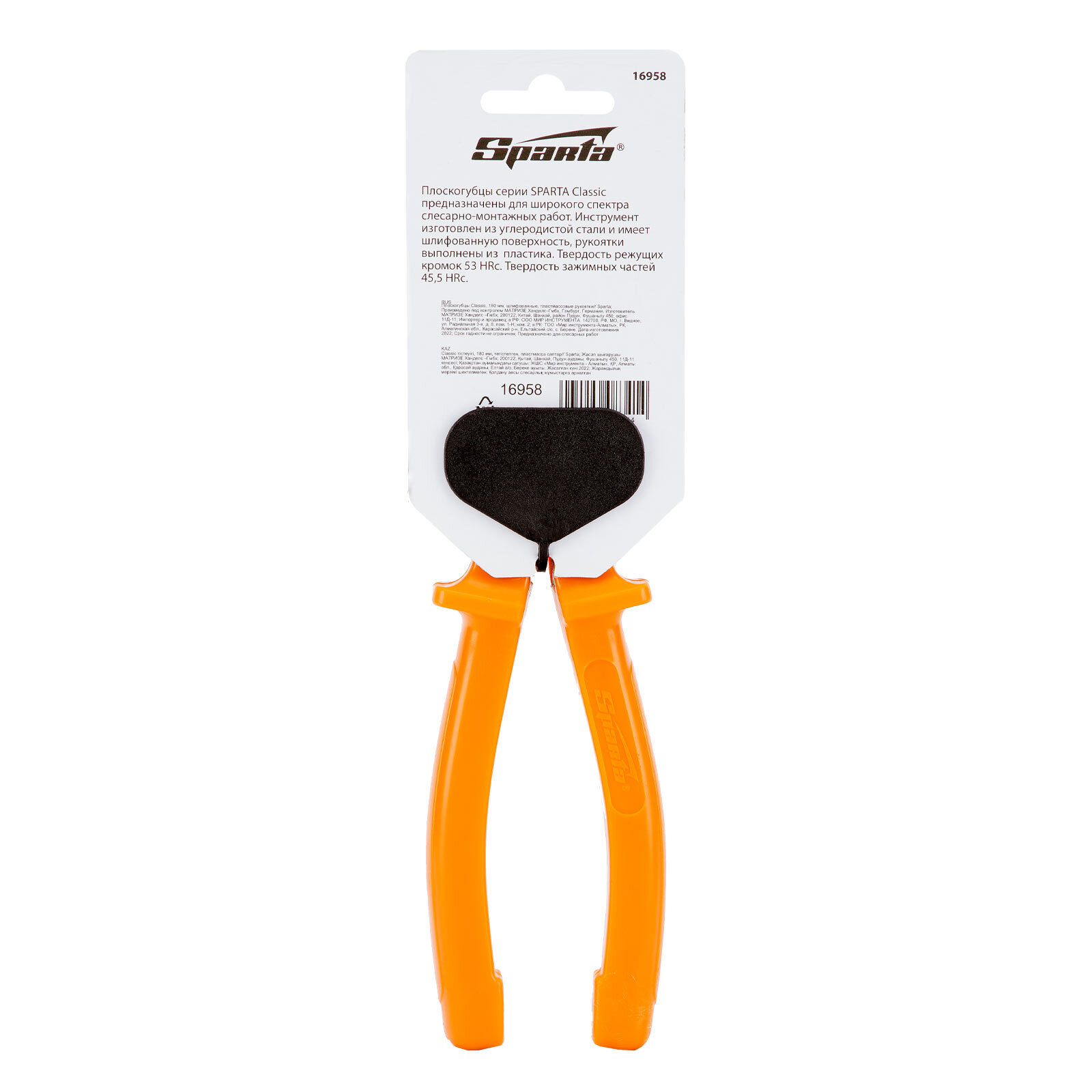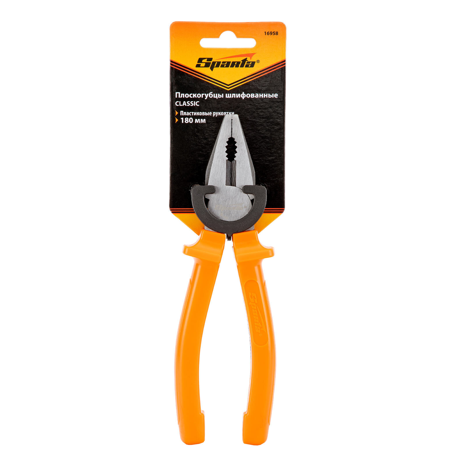 <p>Шлифованные плоскогубцы Sparta Classic 16958 длиной 180 мм, с пластмассовыми рукоятками, позволяют удерживать, сгибать или выравнивать различные предметы. Губки со специальными выемками позволяют захватывать круглые детали, а режущие кромки легко перекусывают проволоку и провода. Плоскогубцы используются для решения профессиональных и бытовых задач.</p><h2>Преимущества</h2><ul><li>Прочность и долговечность — рабочие части изготовлены из углеродистой стали 45 и отшлифованы.</li><li>Эффективная работа — режущие кромки, закаленные токами высокой частоты до 53 HRC, справляются с твердой проволокой без потери остроты.</li><li>Устойчивость к деформации при высоких нагрузках — твердость зажимных частей составляет 45,5 HRC.</li><li>Эргономичность — пластиковые рукоятки снабжены упорами для пальцев.</li></ul>