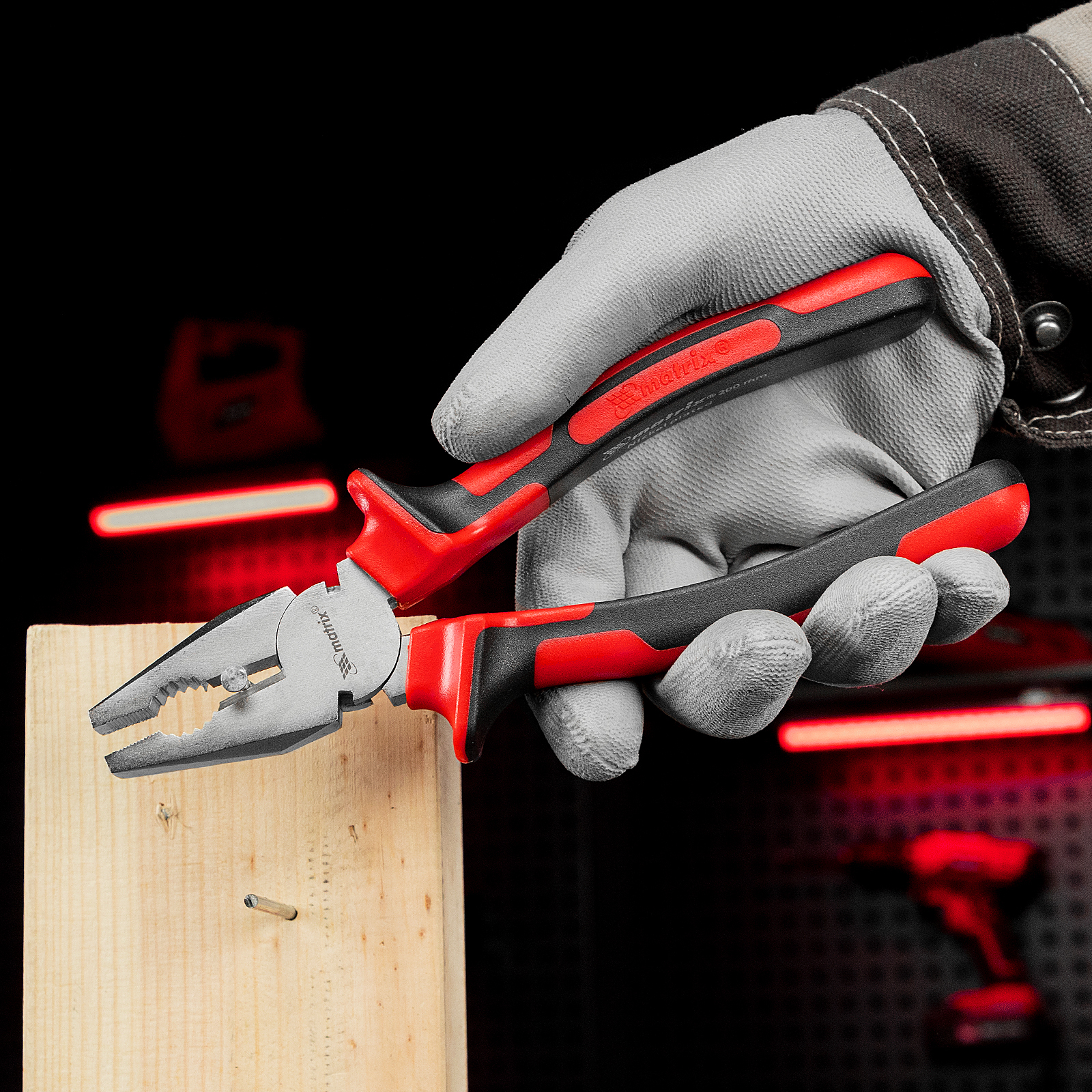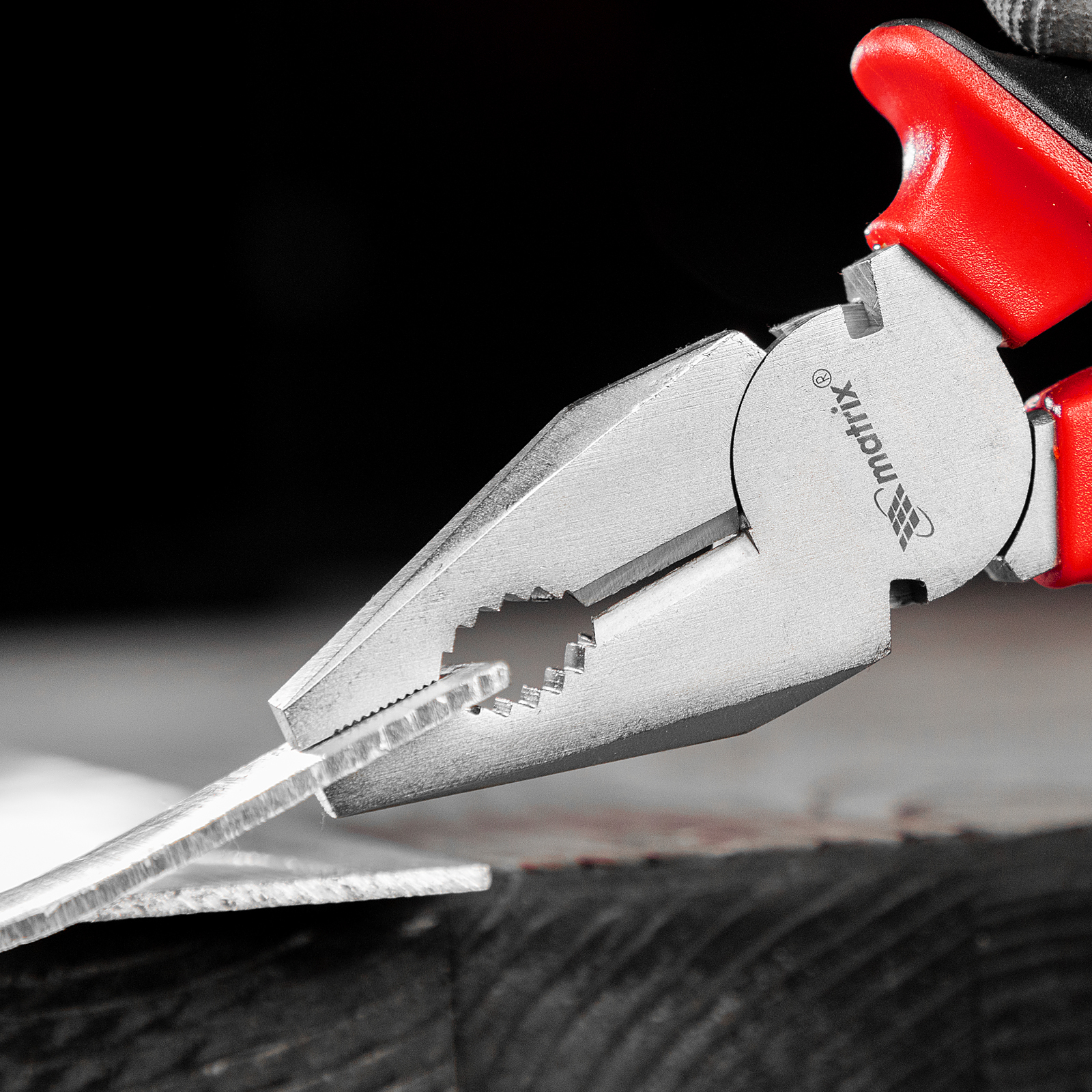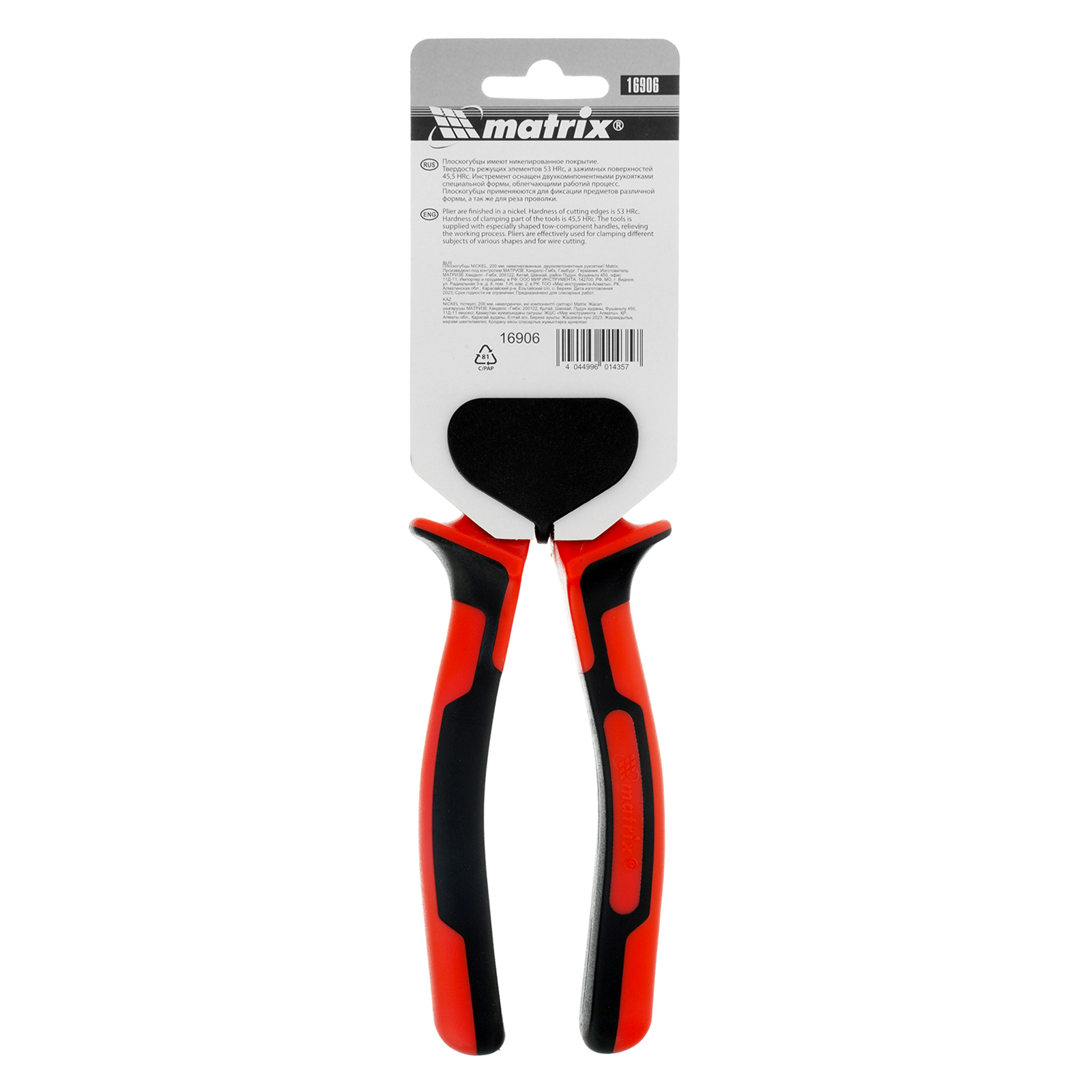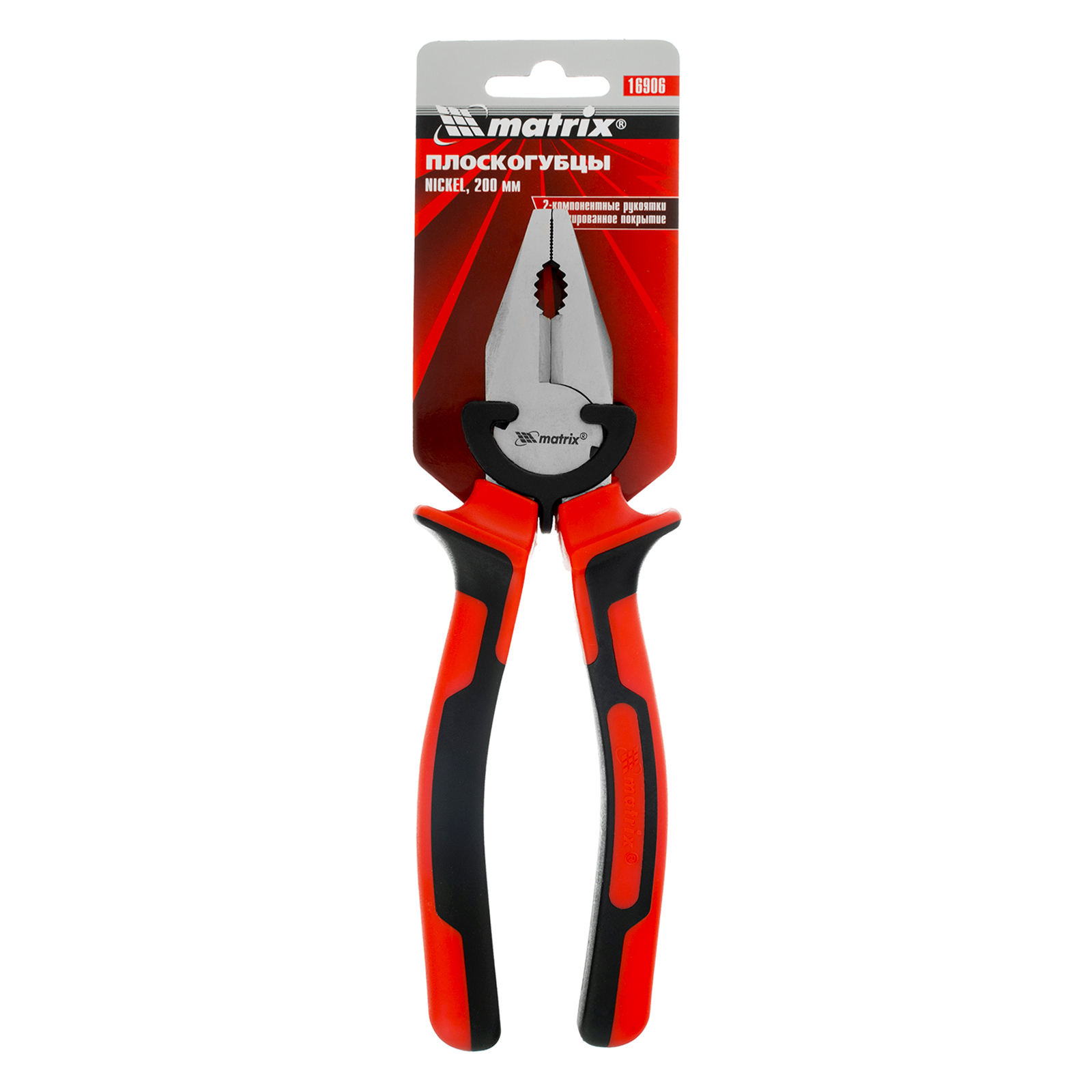 <p>Никелированные плоскогубцы Matrix NICKEL 16906 длиной 200 мм, с двухкомпонентными рукоятками, предназначены для выполнения ремонтных и монтажных работ. Губки с насечками крепко удерживают детали разной формы, крепеж, проволоку или провода. Режущие кромки позволяют перекусывать проволоку. Плоскогубцы используются в профессиональной и бытовой сфере.</p><h2>Преимущества</h2><ul><li>Прочность и износостойкость — инструмент изготовлен из стали 45.</li><li>Эффективность — рабочие кромки прошли закалку до 53 HRC, поэтому справляются с твердой проволокой без потери режущих свойств.</li><li>Возможность работать с плоскими и круглыми деталями — губки имеют 2 зоны захвата.</li><li>Долговечность — никелированные рабочие поверхности не подвержены коррозии.</li><li>Комфортная и безопасная работа — двухкомпонентные рукоятки не скользят в руке и имеют специальные упоры для пальцев.</li></ul>