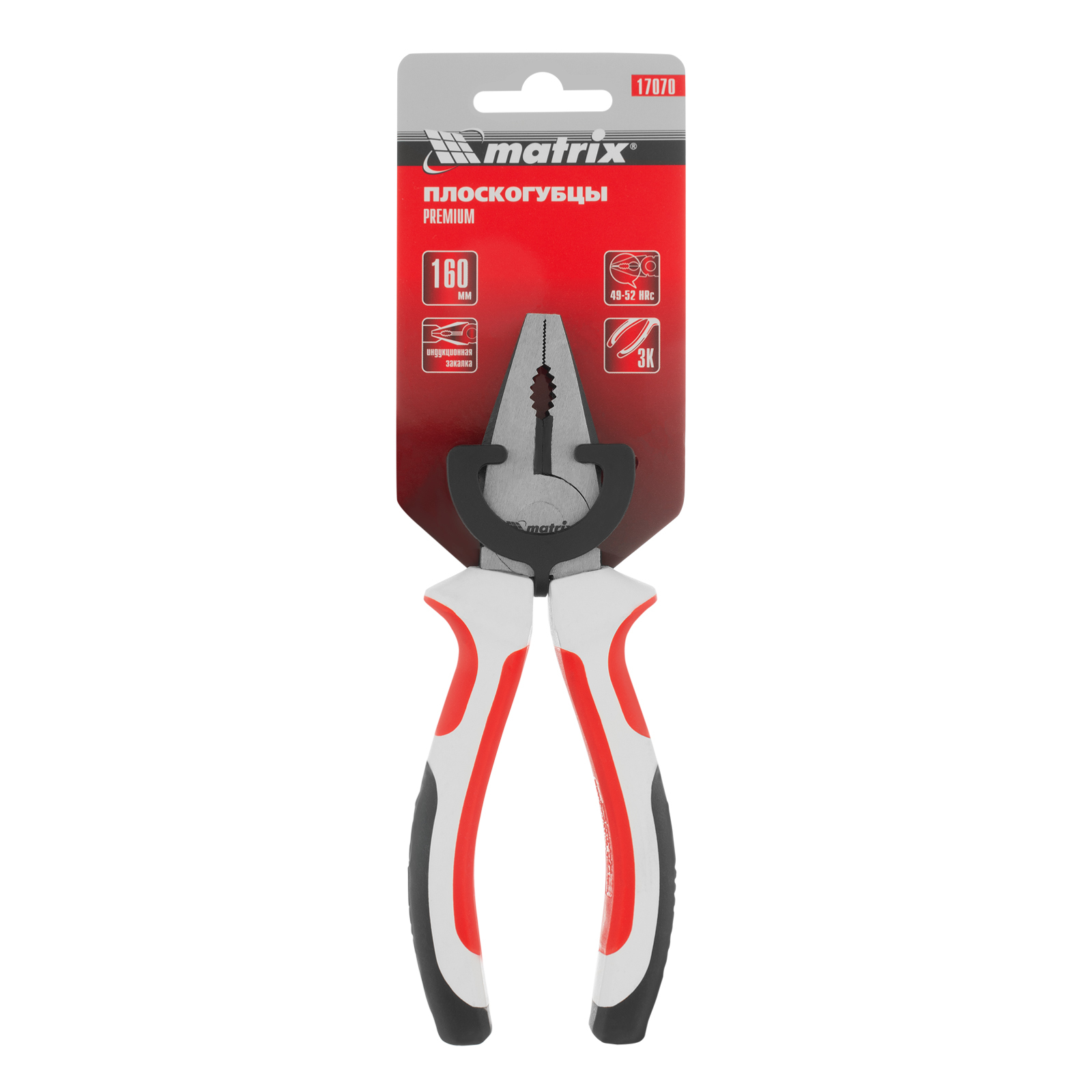 <p>Плоскогубцы Matrix Premium 17070 длиной 160 мм, с трехкомпонентными рукоятками, удобны для фиксации и удерживания небольших деталей, а также для перекусывания проволоки и проводов. Губки с острыми насечками не соскальзывают с поверхности, а специальные выемки позволяют захватывать круглые предметы. Инструмент будет полезен на строительной площадке, в слесарной и столярной мастерской, автосервисе, а также пригодится в домашнем хозяйстве.</p><h2>Преимущества</h2><ul><li>Высокий показатель прочности — плоскогубцы изготовлены из углеродистой стали 45.</li><li>Устойчивость к деформациям — рабочие части прошли индукционную закалку, имеют твердость около 46 HRC и выдерживают сильное сжатие.</li><li>Защита от коррозии — стальные части обработаны методом чернения.</li><li>Комфорт во время работы — трехкомпонентные рукоятки с широкими упорами не выскальзывают из рук.</li></ul>