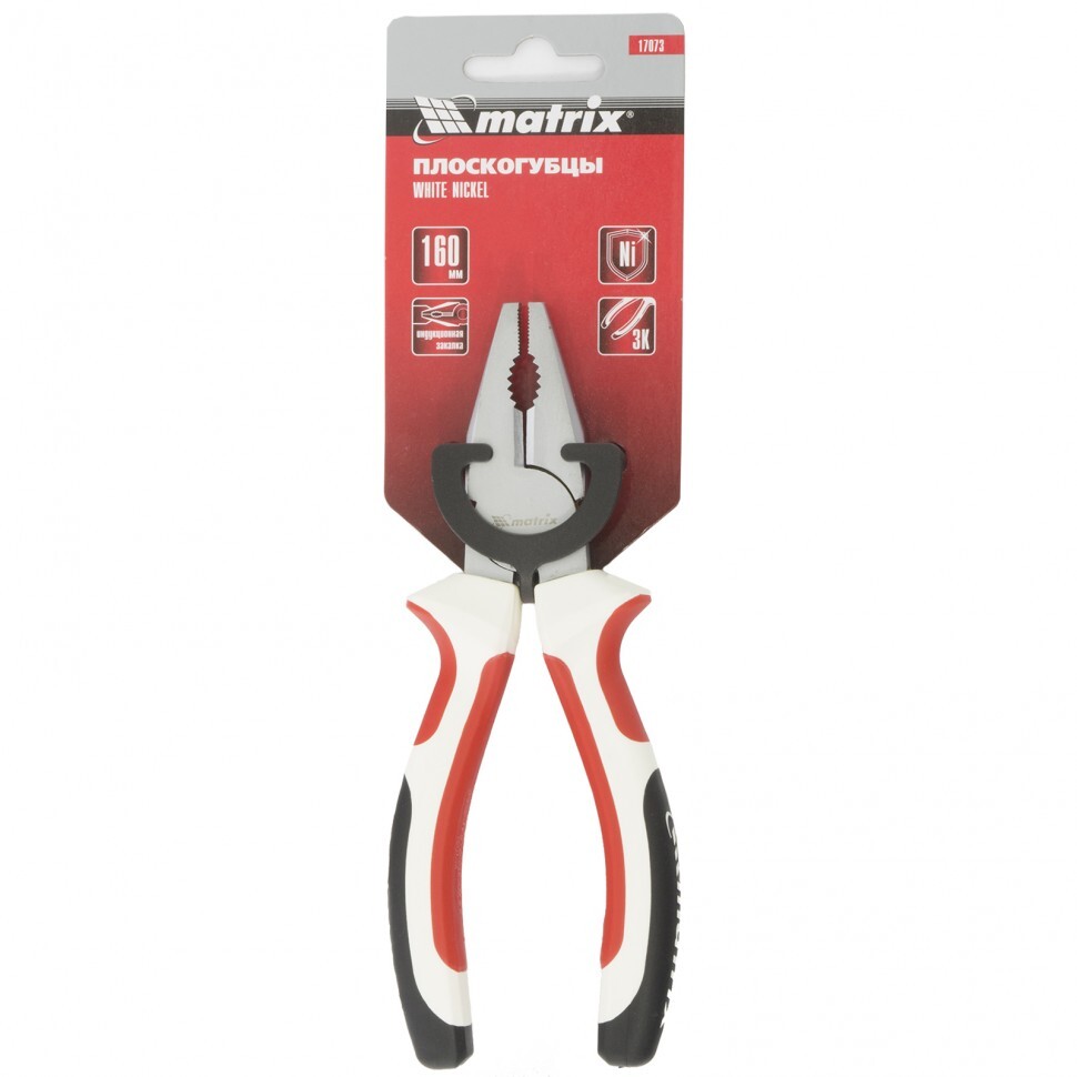 <p>Никелированные плоскогубцы Matrix White Nickel 17073 длиной 160 мм, с трехкомпонентными рукоятками, надежно удерживают плоские и круглые детали благодаря губкам специальной формы с зазубренной поверхностью. Острые режущие кромки легко перекусывают проволоку и провода. Плоскогубцы применяются во время проведения строительных, ремонтных, монтажных работ, будут полезны и в быту.</p><h2>Преимущества</h2><ul><li>Прочность — плоскогубцы изготовлены из углеродистой стали 45, рабочие части, прошедшие индукционную закалку, выдерживают интенсивное использование.</li><li>Долговечность — никелированные рабочие поверхности защищены от коррозии.</li><li>Комфортная работа — многокомпонентные рукоятки с рифленой поверхностью не выскальзывают из ладони.</li></ul>