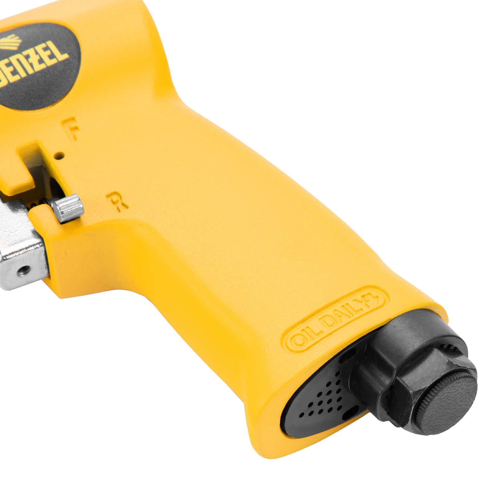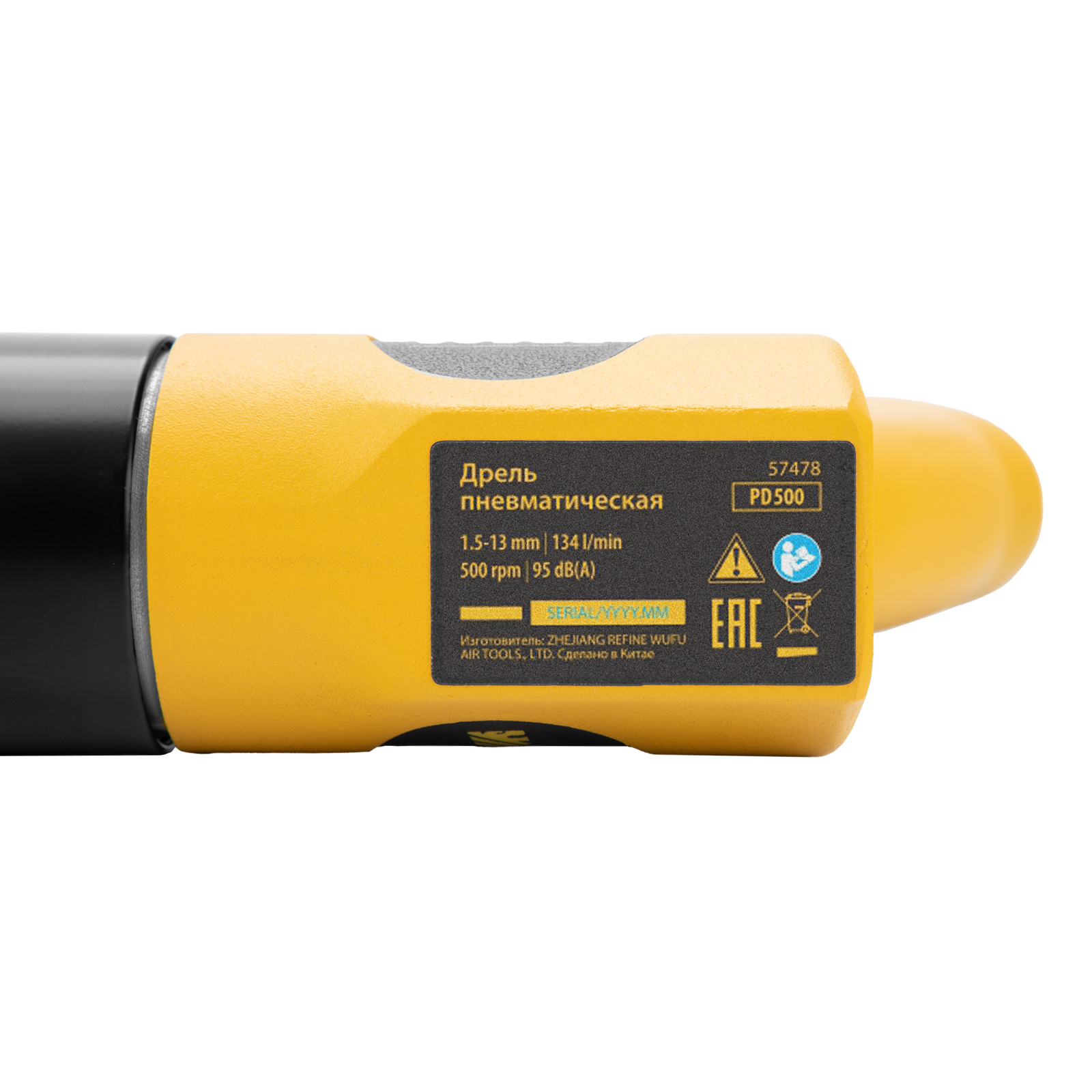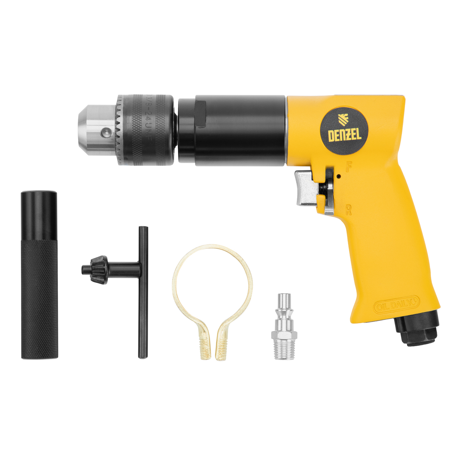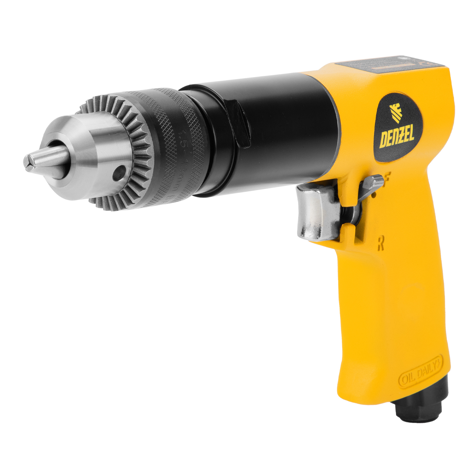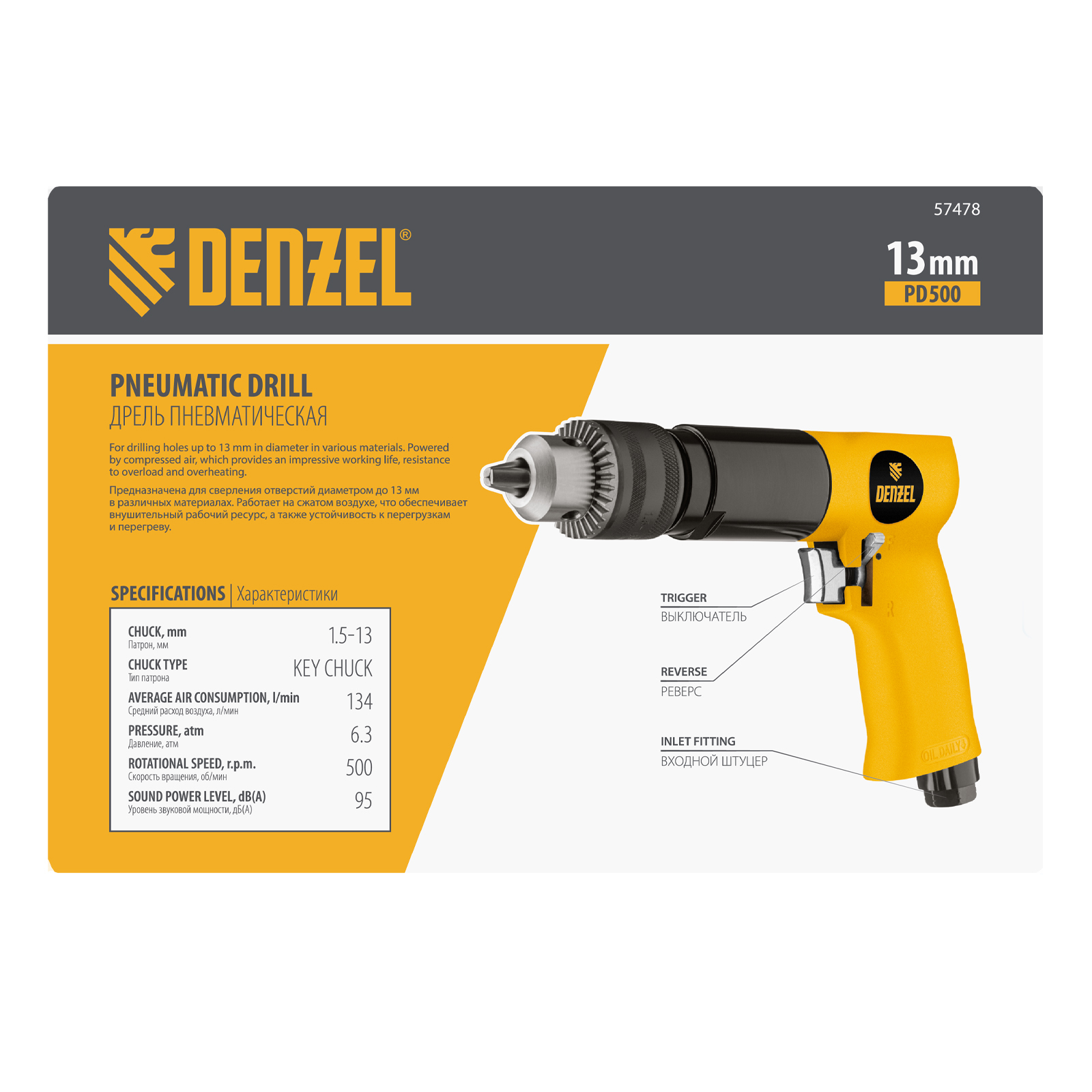 Пневматическая дрель Denzel PD500 57478 с ключевым патроном 1,5-13 мм работает со скоростью 500 об/мин при среднем расходе сжатого воздуха 114 л/мин. Используется для сверления отверстий в древесине, металле и пластике, закручивания и откручивания резьбовых крепёжных элементов. Дрель может применяться в строительстве, монтажных работах, ремонте и обслуживании автомобилей, на малых производствах и в домашних мастерских.,Инструмент предназначен для работы под давлением 6,3 бар, расход воздуха не превышает 200 л/мин, поэтому в качестве источника сжатого воздуха подойдет компрессор средней мощности. Во время работы не забывайте использовать специальное масло ISO 46, которое можно добавлять как напрямую в инструмент, так и с помощью блока подготовки воздуха Denzel 57469, включающего в себя лубрикатор для автоматической подачи масла.