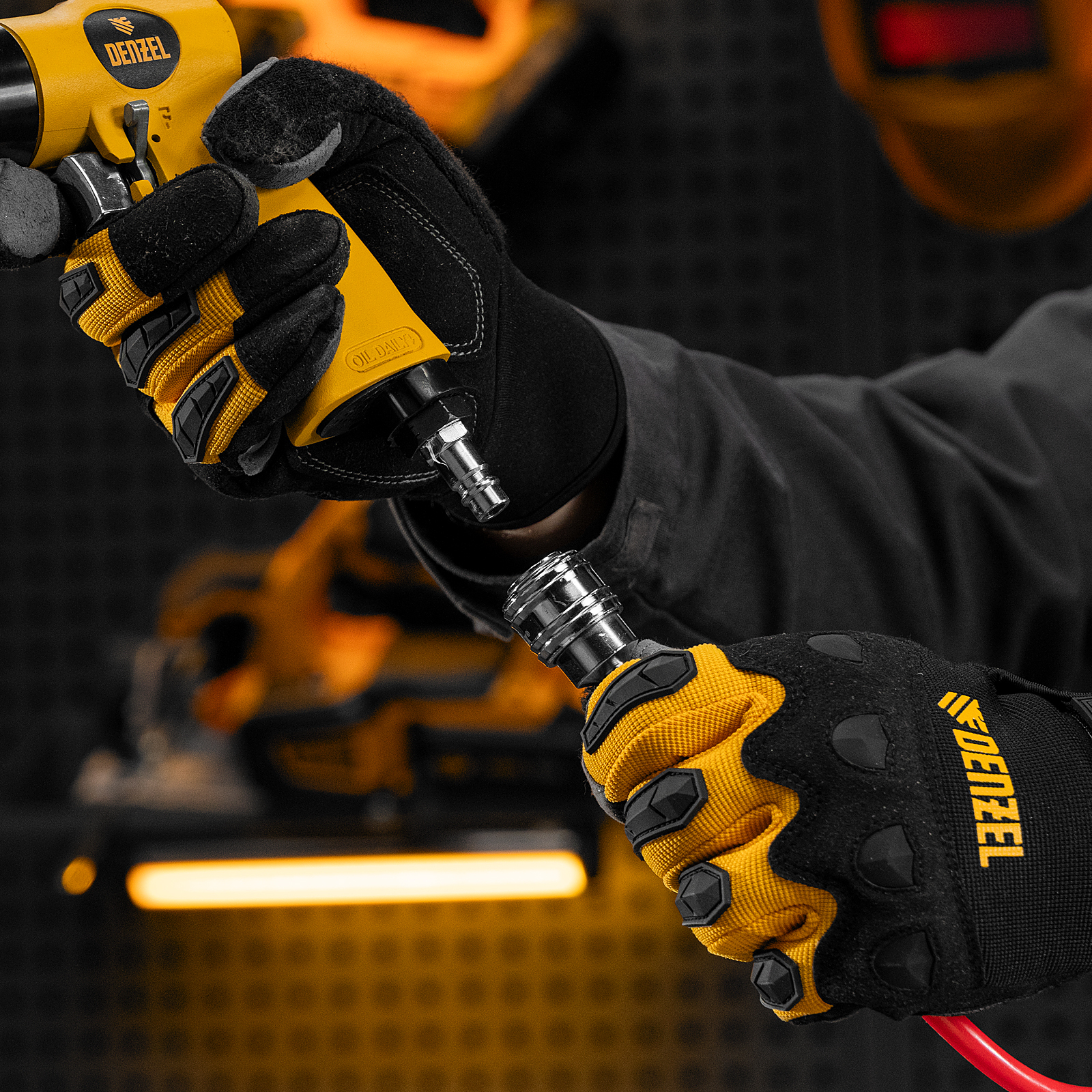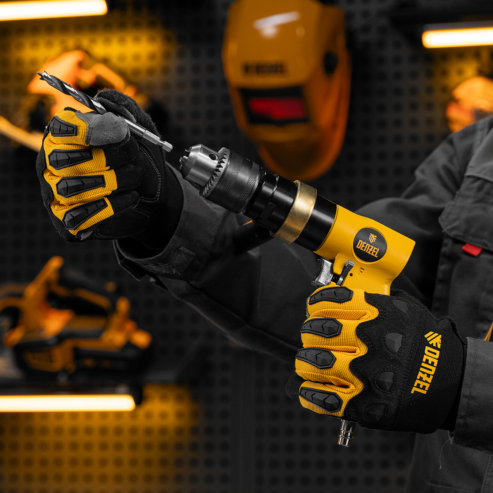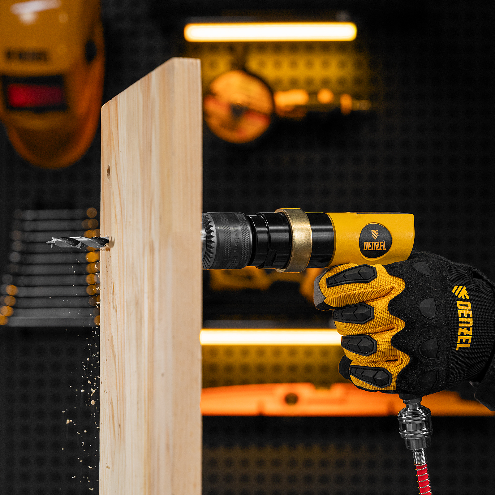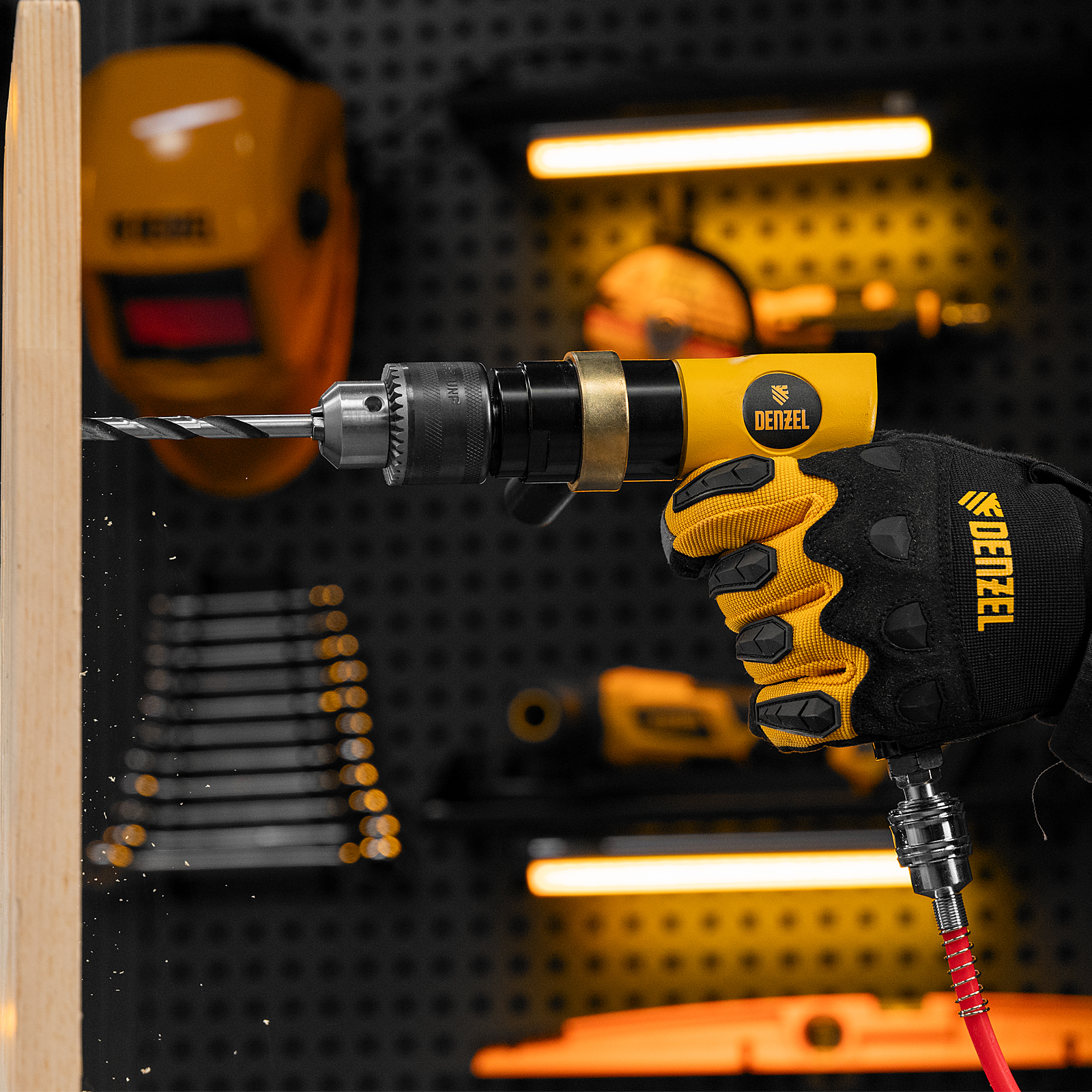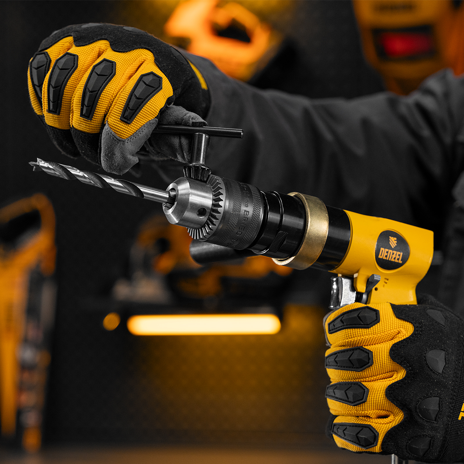 Пневматическая дрель Denzel PD500 57478 с ключевым патроном 1,5-13 мм работает со скоростью 500 об/мин при среднем расходе сжатого воздуха 114 л/мин. Используется для сверления отверстий в древесине, металле и пластике, закручивания и откручивания резьбовых крепёжных элементов. Дрель может применяться в строительстве, монтажных работах, ремонте и обслуживании автомобилей, на малых производствах и в домашних мастерских.,Инструмент предназначен для работы под давлением 6,3 бар, расход воздуха не превышает 200 л/мин, поэтому в качестве источника сжатого воздуха подойдет компрессор средней мощности. Во время работы не забывайте использовать специальное масло ISO 46, которое можно добавлять как напрямую в инструмент, так и с помощью блока подготовки воздуха Denzel 57469, включающего в себя лубрикатор для автоматической подачи масла.