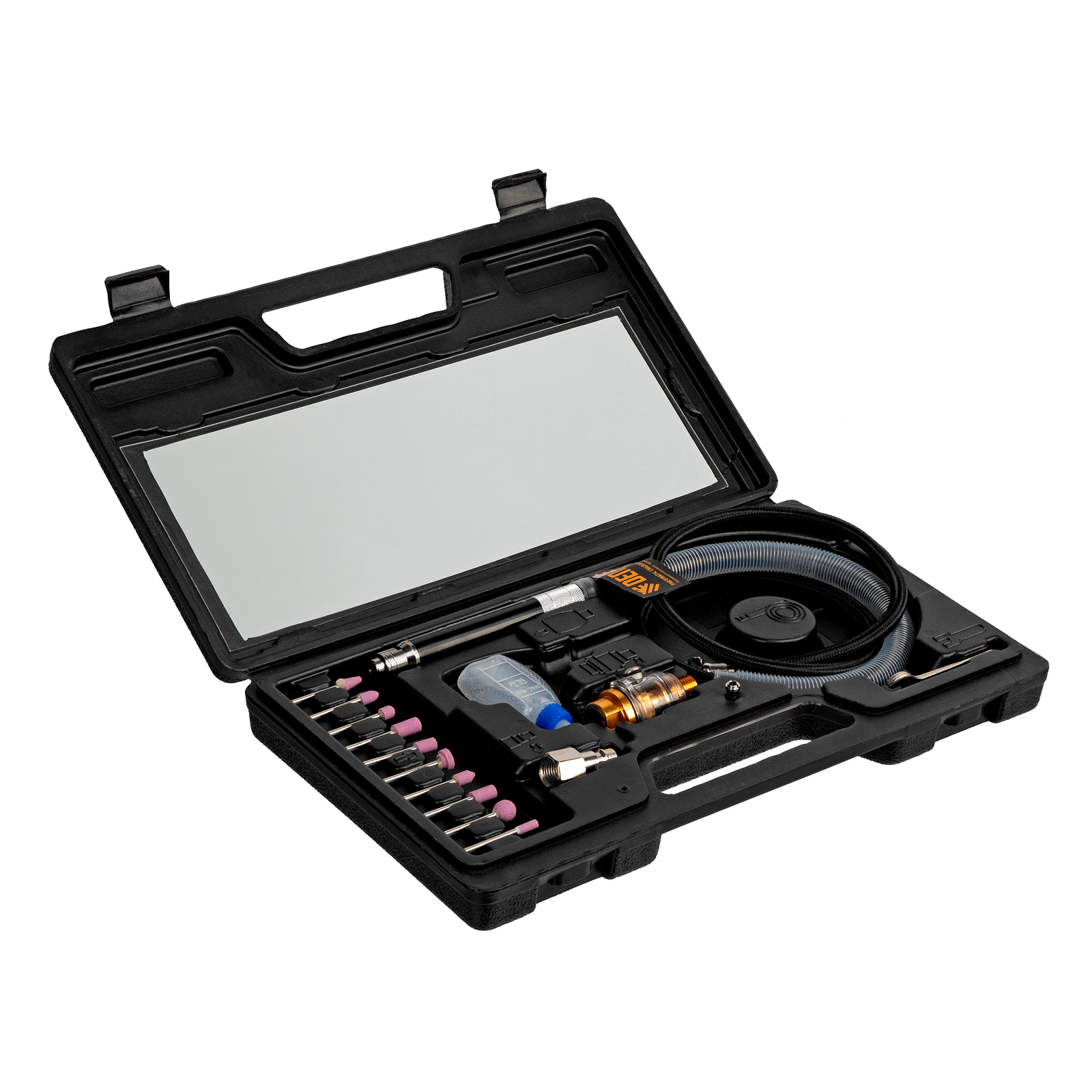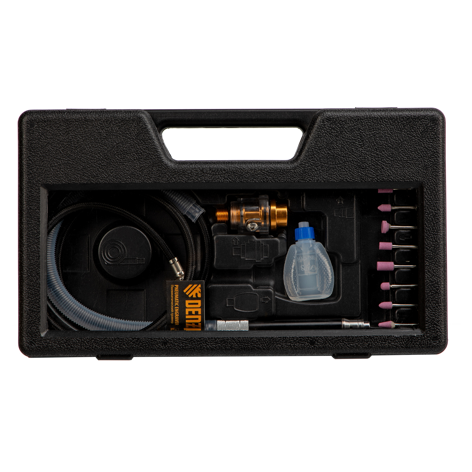 Пневмогравер - 1 штШтуцер 1/4" - 1 штШлифовальные камни-10 штВлагоотделитель - 1 штМасленка - 1 штГаечный ключ - 2 штКейс - 1 штРуководство по эксплуатации и гарантийный талон - 1 шт