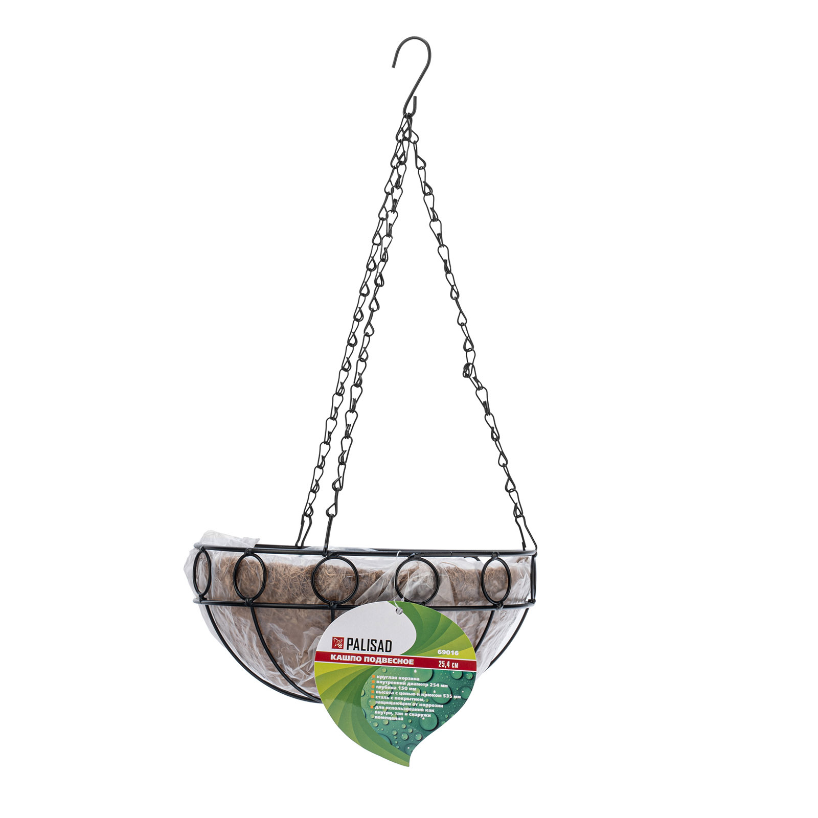 <p>Подвесное кашпо Palisad 69016 высотой с цепью и крюком 53,5 см и диаметром 25,4 см предназначено для размещения цветочных горшков. Позволяет создать яркий акцент в интерьере и на загородном участке. Подвесная конструкция не занимает много места.</p><h2>Преимущества</h2><ul><li>Прочность и долговечность — стальное кашпо устойчиво к механическим повреждениям.</li><li>Коррозионная стойкость — лакокрасочное покрытие защищает изделие от воздействия влаги.</li><li>Простая и надежная конструкция — кашпо легко подвешивается и снимается благодаря удобному крюку, соединяющему 3 гибкие цепочки.</li></ul>