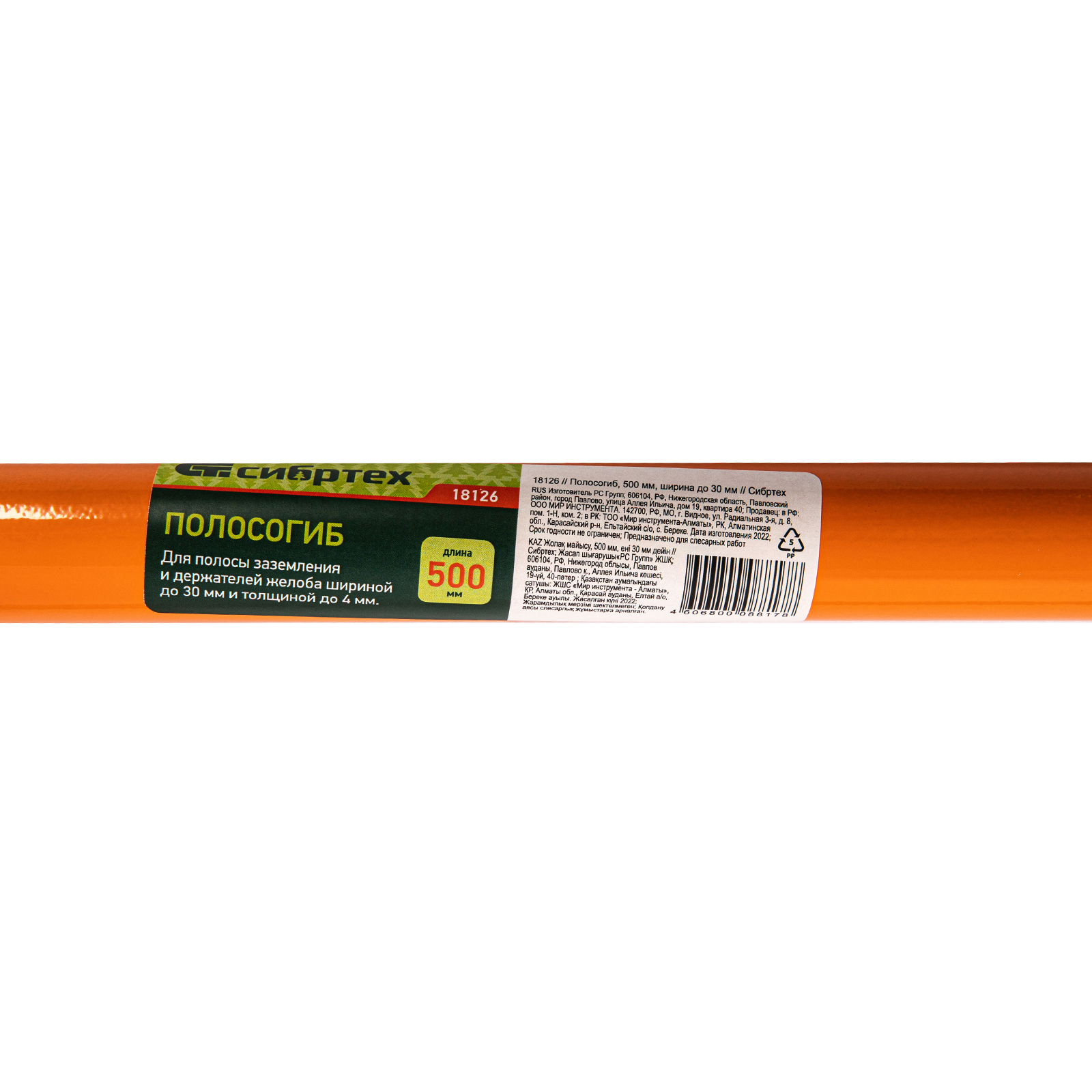 <p>Полосогиб Сибртех 18126 с ручками длиной 500 мм используется для сгибания стальных и медных полос шириной до 30 мм и толщиной до 4 мм. Применяется для формирования контуров заземления, создания держателей водосточных желобов, крюков и кронштейнов. Пригодится для выполнения монтажных работ на строительной площадке.</p><h2>Преимущества</h2><ul><li>Прочность — усиленная стальная конструкция выдерживает многократное применение.</li><li>Надежность — твердость упора составляет 54-56 HRC, поэтому он устойчив к повышенным нагрузкам.</li><li>Плавная настройка — угол изгиба меняется в диапазоне 0-270 градусов при помощи регулировочного винта.</li><li>Долговечность — полосогиб покрыт эмалью, а регулировочный винт оцинкован для защиты от коррозии.</li></ul>