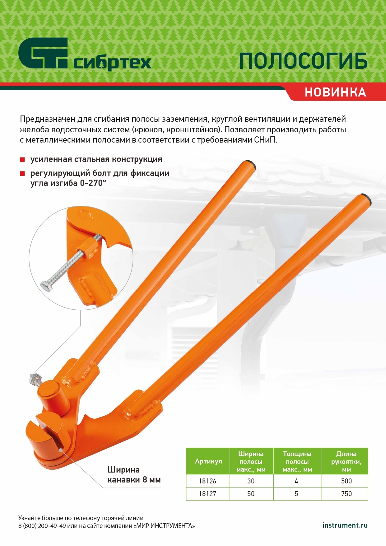 <p>Полосогиб Сибртех 18127 с ручками длиной 750 мм используется для сгибания стальных и медных полос шириной до 50 мм и толщиной до 5 мм. Применяется для формирования контуров заземления, создания держателей водосточных желобов, крюков и кронштейнов. Пригодится для выполнения монтажных работ на строительной площадке.</p><h2>Преимущества</h2><ul><li>Прочность — усиленная стальная конструкция выдерживает многократное применение.</li><li>Надежность — твердость упора составляет 54-56 HRC, поэтому он устойчив к повышенным нагрузкам.</li><li>Плавная настройка — угол изгиба меняется в диапазоне 0-270 градусов при помощи регулировочного винта.</li><li>Долговечность — полосогиб покрыт эмалью, а регулировочный винт оцинкован для защиты от коррозии.</li></ul>