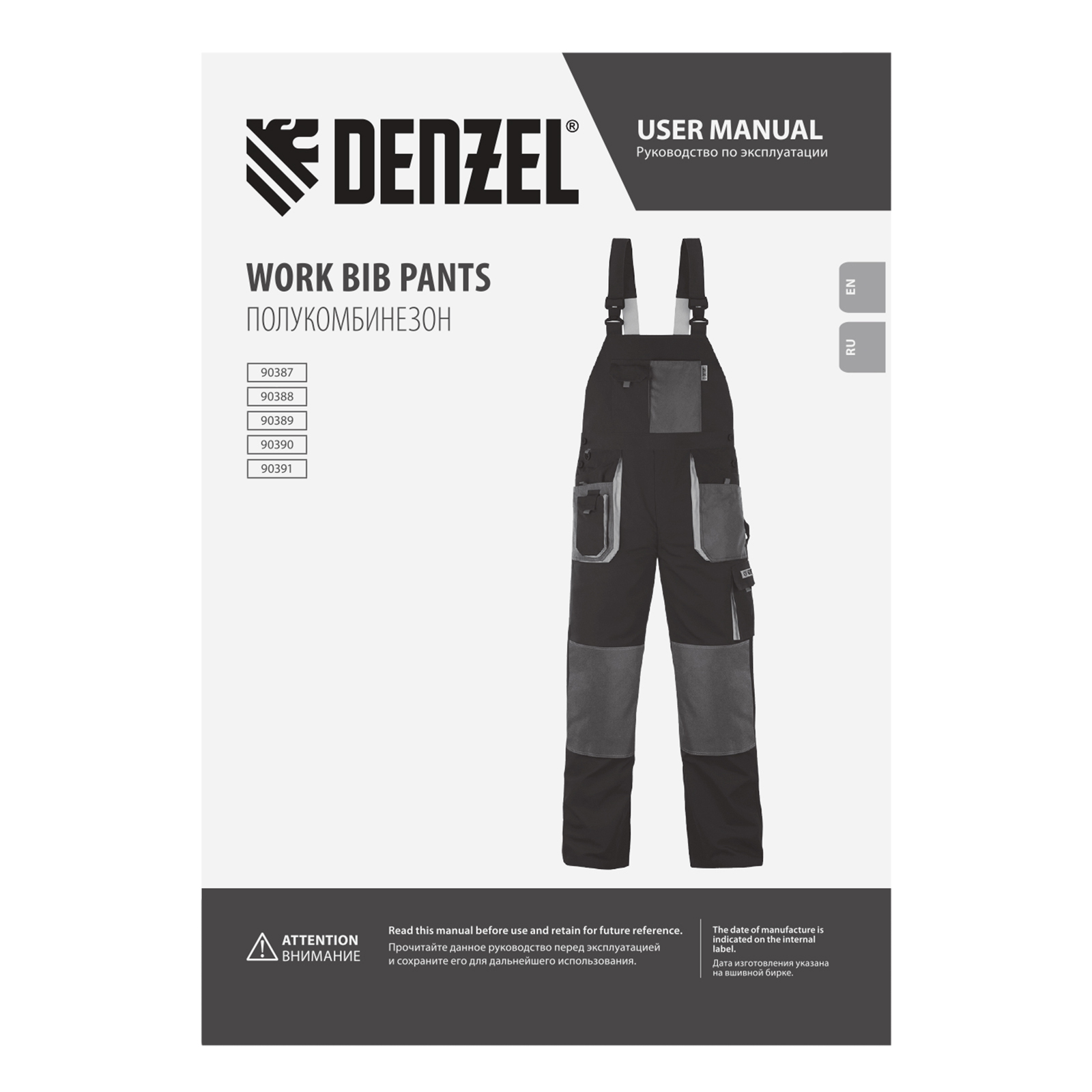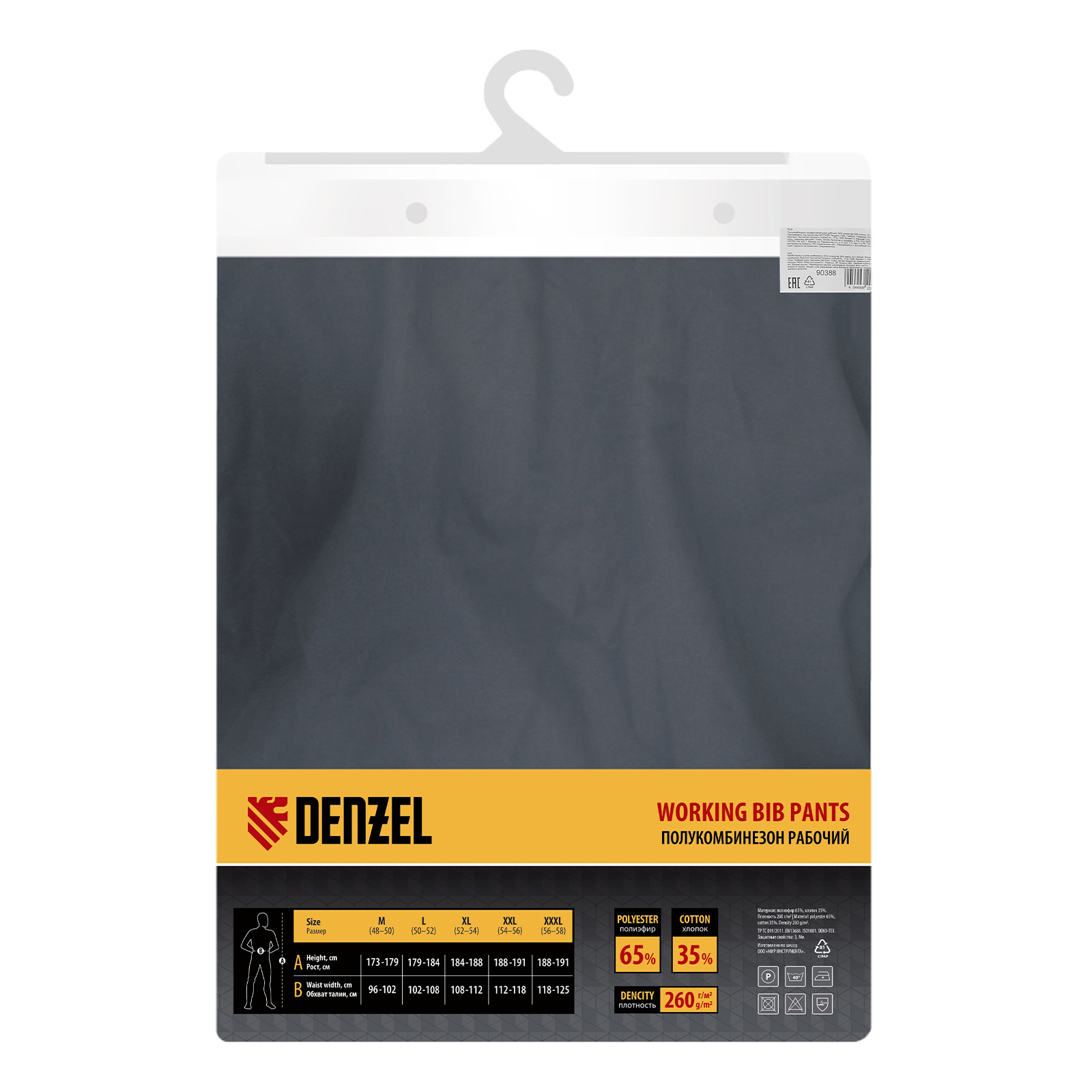 Рабочий полукомбинезон Denzel 90388 размера L рассчитан на рост 179-184 см и используется для выполнения профессиональных строительных, ремонтных и производственных работ в теплое время года или в отапливаемом помещении. Защищает пользователя от общих производственных загрязнений, нетоксичной пыли, ветра и незначительных механических воздействий. Изготовлен из ткани плотностью 260 г/м² (65% полиэстер, 35% хлопок). За счет наличия хлопковых волокон в составе ткань хорошо пропускает воздух и приятна на теле, полиэстер обеспечивает устойчивость к истиранию. Полукомбинезон выполнен в практичном темно-сером цвете.
