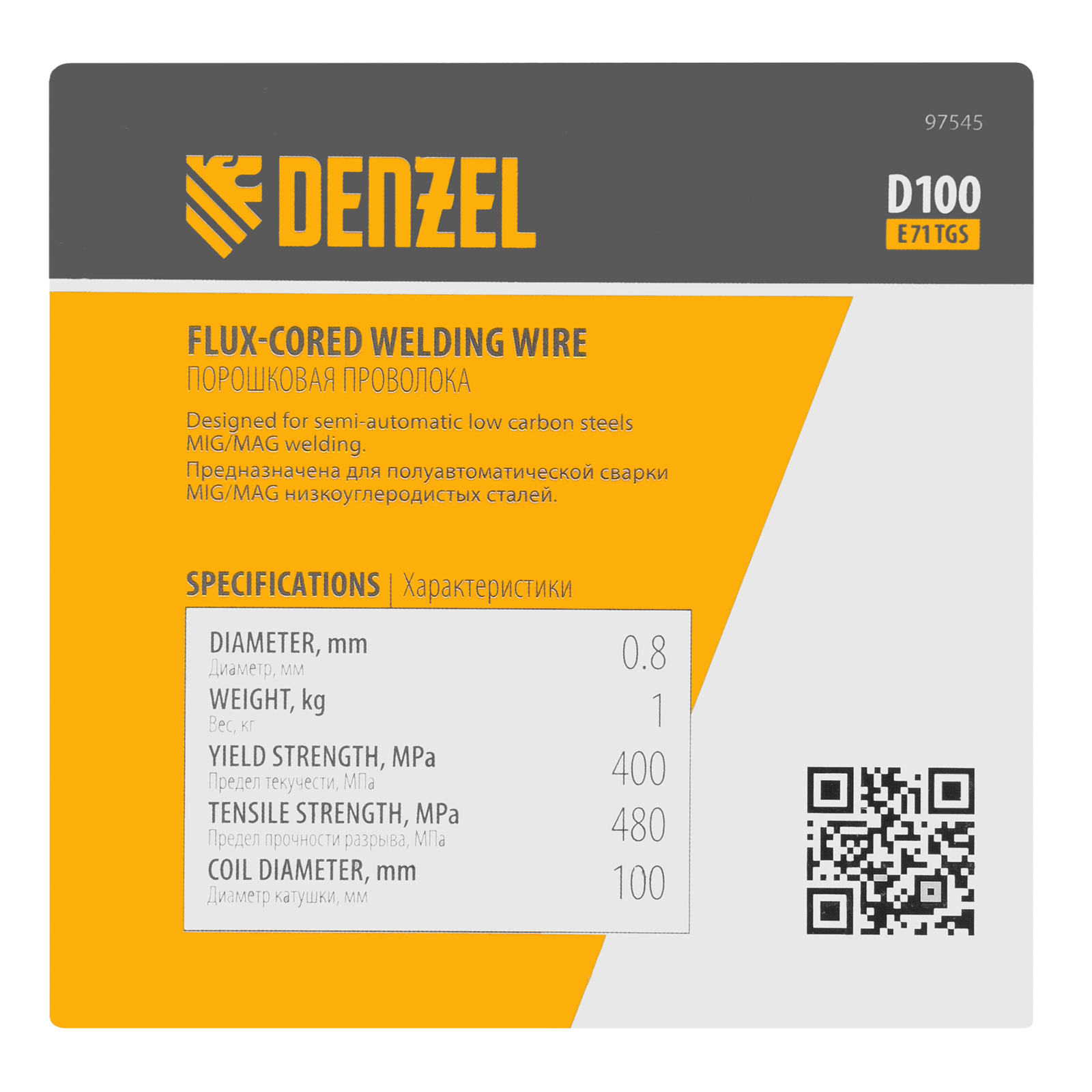 Порошковая проволока Denzel E71TGS 97545 диаметром 0,8 мм и весом 1 кг, на катушке типа D100, предназначена для полуавтоматической сварки MIG/MAG углеродистых и низколегированных сталей без среды защитных газов. Необходима профессиональным сварщикам, пригодится также частному мастеру.
