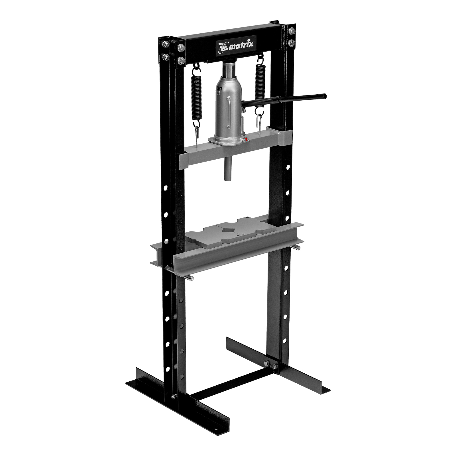Гидравлический пресс Matrix 523105 размером 1360 х 500 х 510 мм, воздействующий на детали с усилием 12 т, поставляется комплектом из 2 частей. Используется для запрессовки и выпрессовки различных деталей, необходимых для ремонта автомобилей. Изготовлен из толстого прочного металла и имеет простую разборную конструкцию из верхней и нижней балок, стоек, станин и гидравлического бутылочного домкрата. Пресс подойдет для самостоятельного использования в гараже.