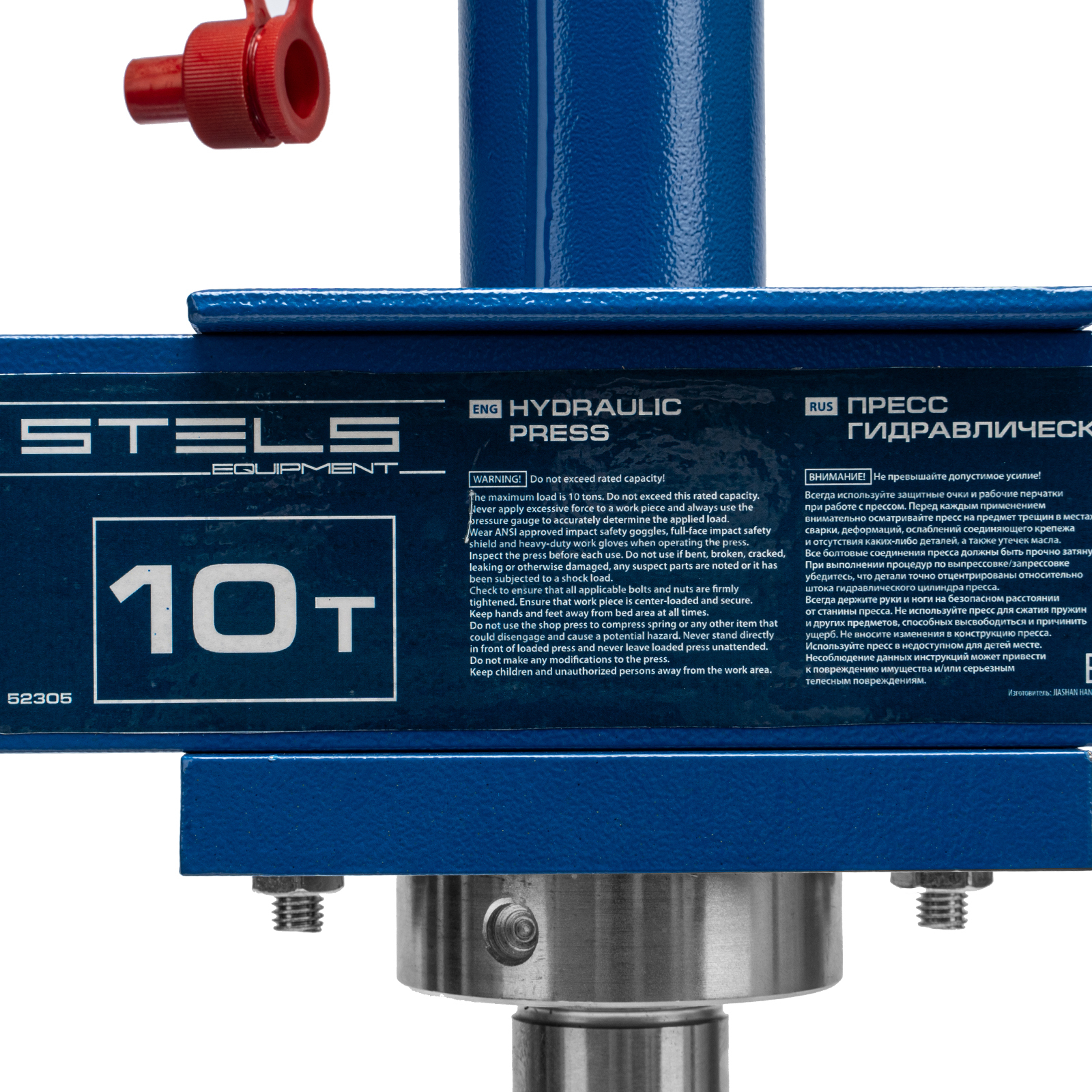 Гидравлический настольный пресс Stels 52305 с манометром, развивающий усилие до 10 тонн, — оборудование для запрессовки и выпрессовки деталей, например, подшипников, втулок, сайлентблоков, рычагов, штифтов. Фиксируется на столе — в опорах имеются отверстия для крепежа. Отличается плавным ходом штока благодаря высокому качеству исполнения гидронасоса и самого штока. Величину прилагаемого усилия можно контролировать при помощи глицеринозаполненного манометра. Пресс пригодится в автомастерской или личном гараже.