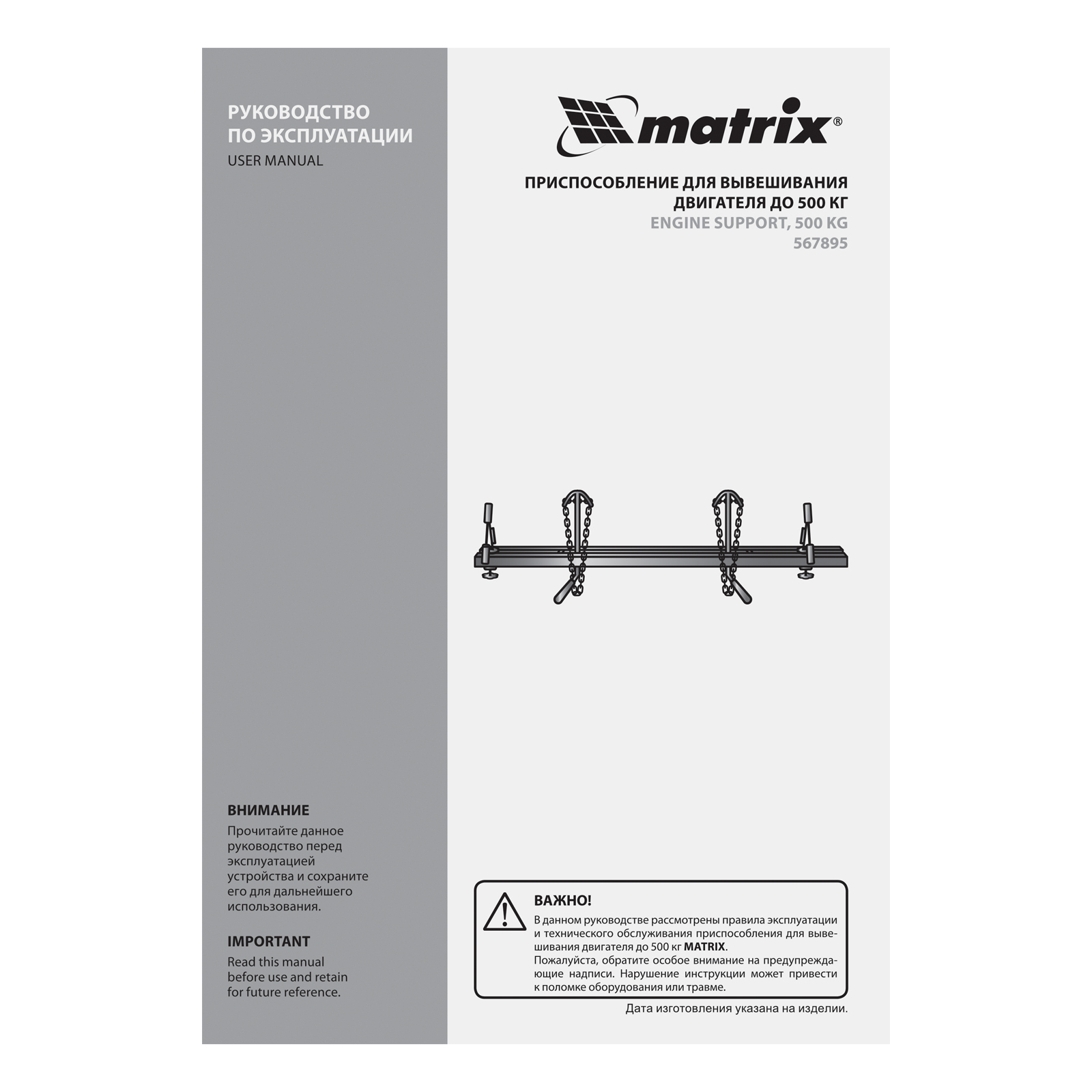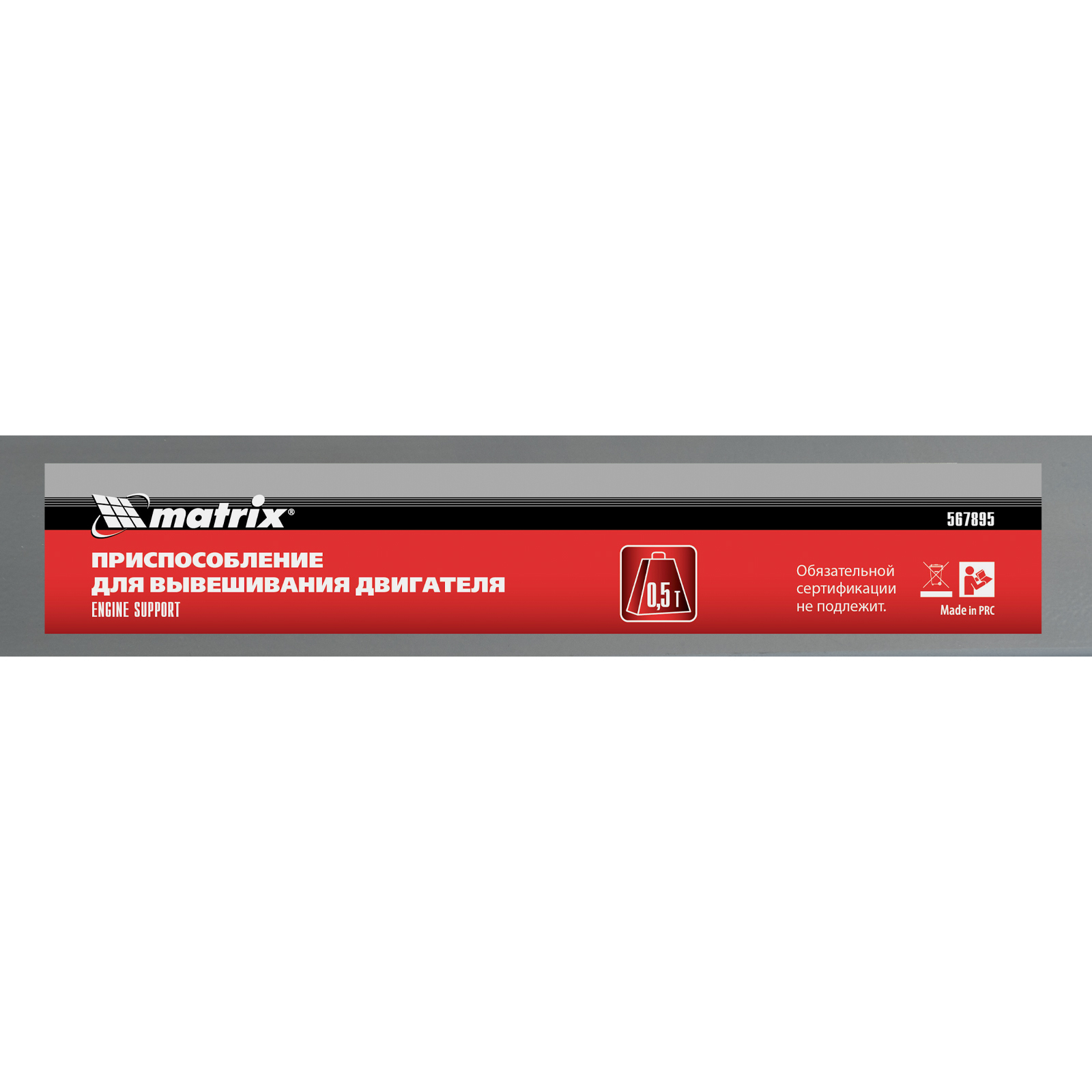 <p>Приспособление для вывешивания двигателя Matrix 567895 используется в автосервисах и предназначено для ремонта двигателя в моторном отсеке автомобиля. Грузоподъемность 500 кг позволяет работать практически с любыми двигателями.</p><h2>Преимущества</h2><ul><li>Универсальность — благодаря регулировке ширины установки опор устройство подходит для большинства автомобилей.</li><li>Прочность — металлические цепи устойчивы к разрыву и выдерживают многократные нагрузки.</li><li>Надежность — на цепях имеются фиксаторы, удерживающие двигатель.</li><li>Долговечность — стальная конструкция устойчива к образованию коррозии.</li></ul>