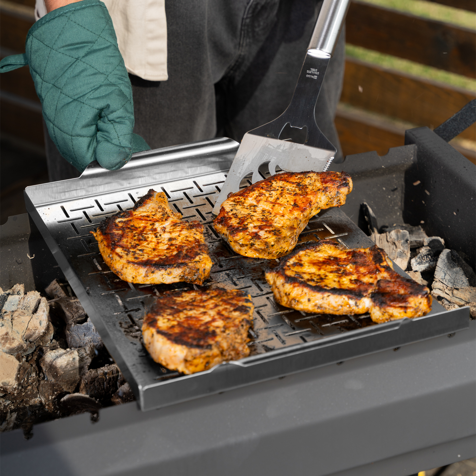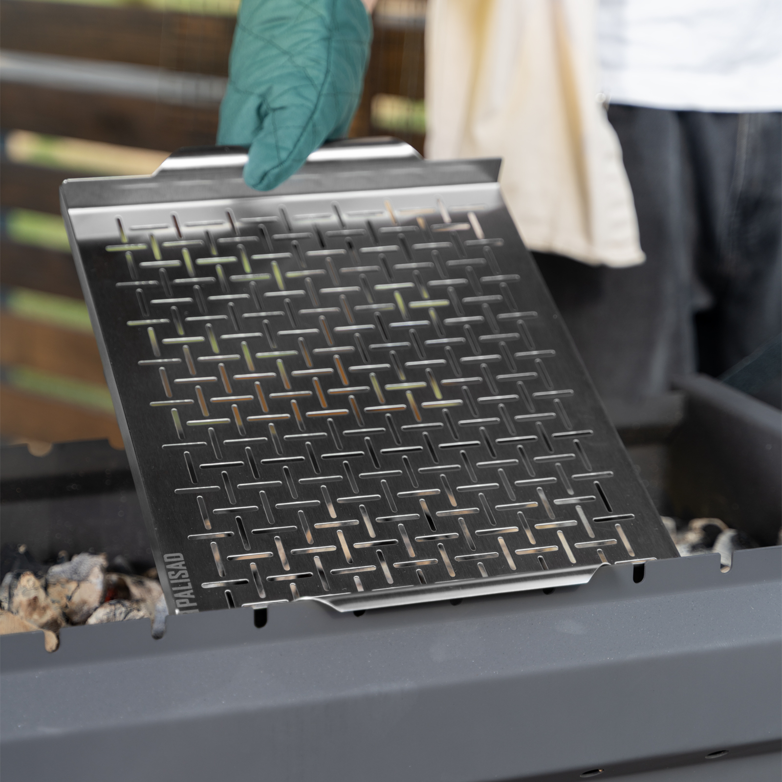 - Универсальность — противень подходит для всех типов грилей и барбекю, что позволяет использовать его на открытом воздухе и в домашних условиях.
