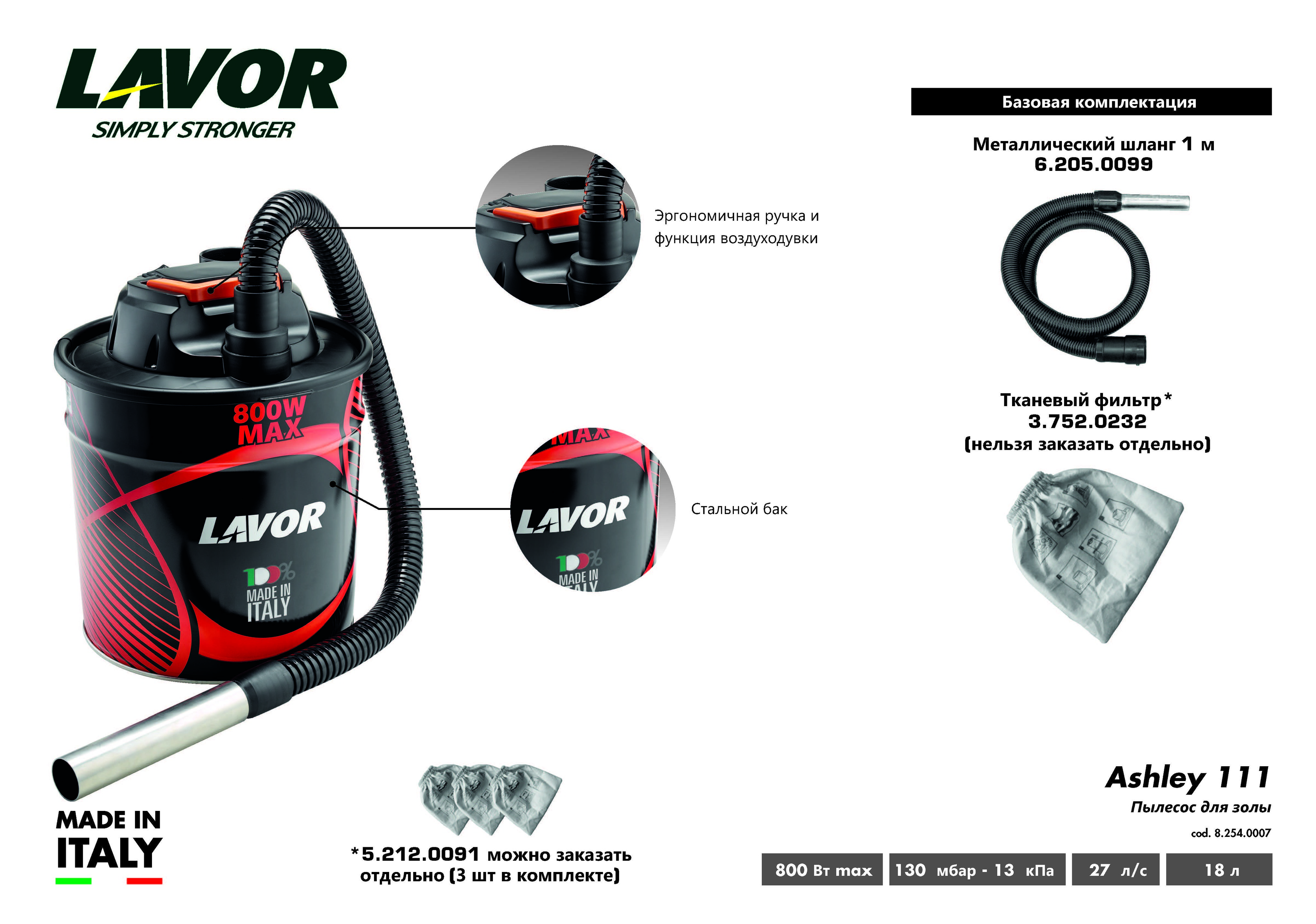 Пылесос для золы Lavor ASHLEY 111 в стальном корпусе имеет максимальную мощность 800 Вт. Емкость контейнера для мусора составляет 12 литров. Пылесос для золы Lavor ASHLEY 111 прекрасно подходит для очистки каминов.