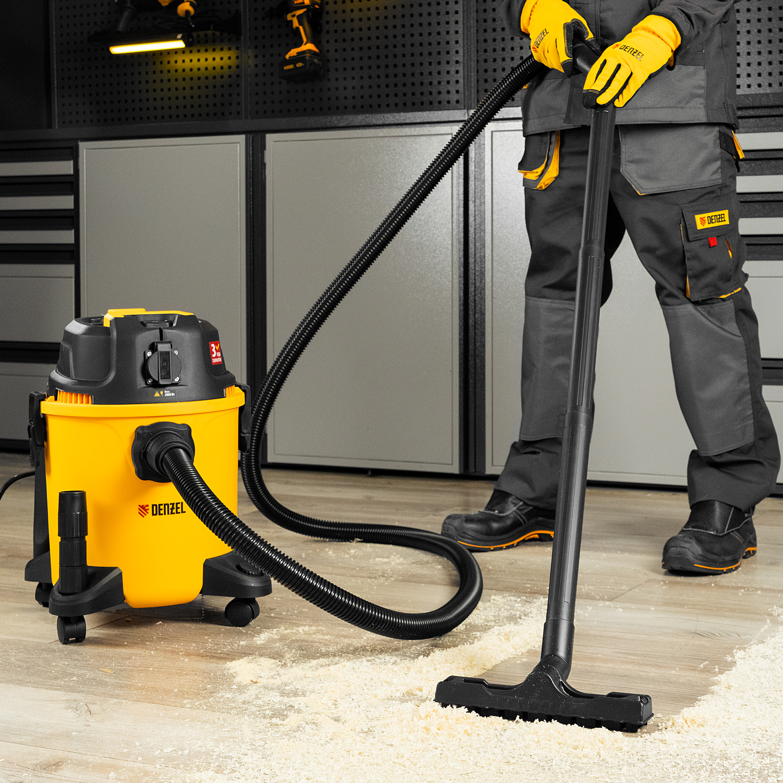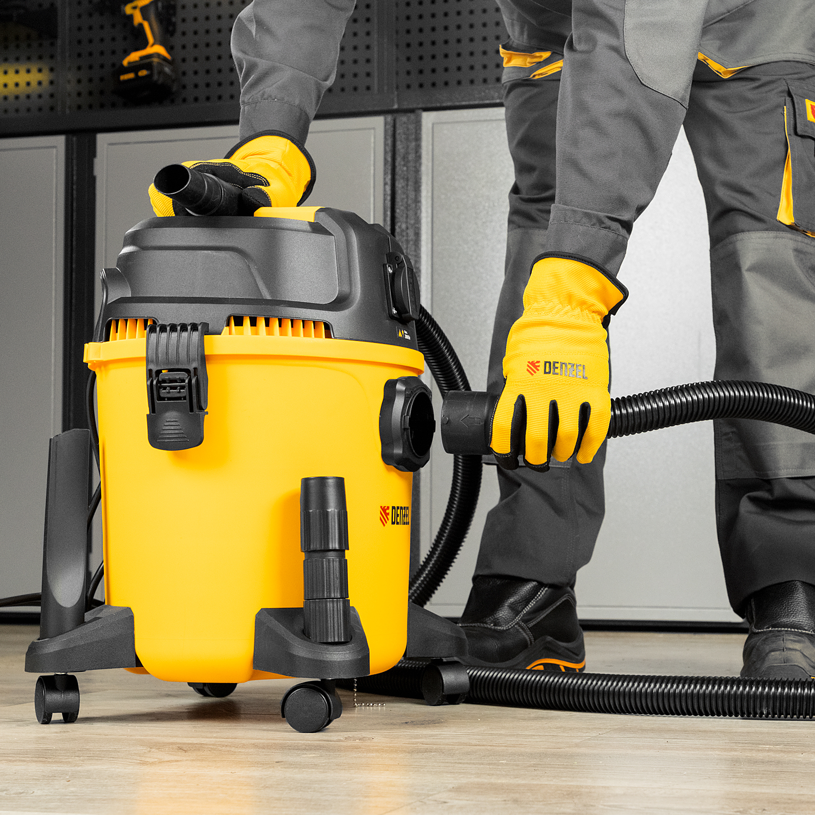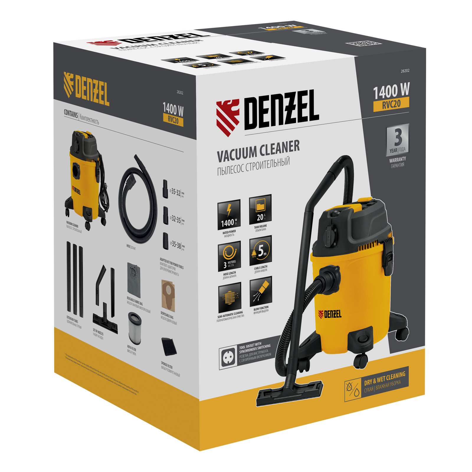 Пылесос строительный RVC20, 1400 Вт, бак 20 л, шланг 3 м, розетка с автосинхр. Denzel