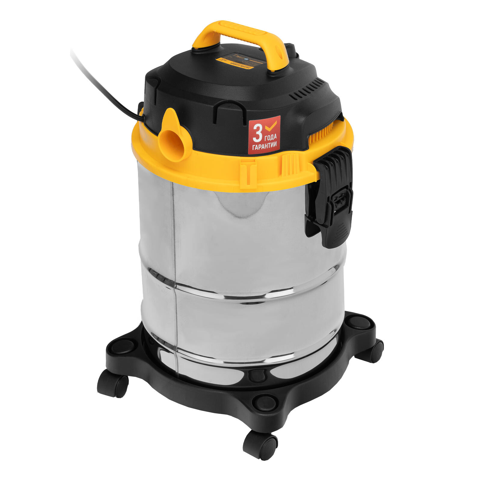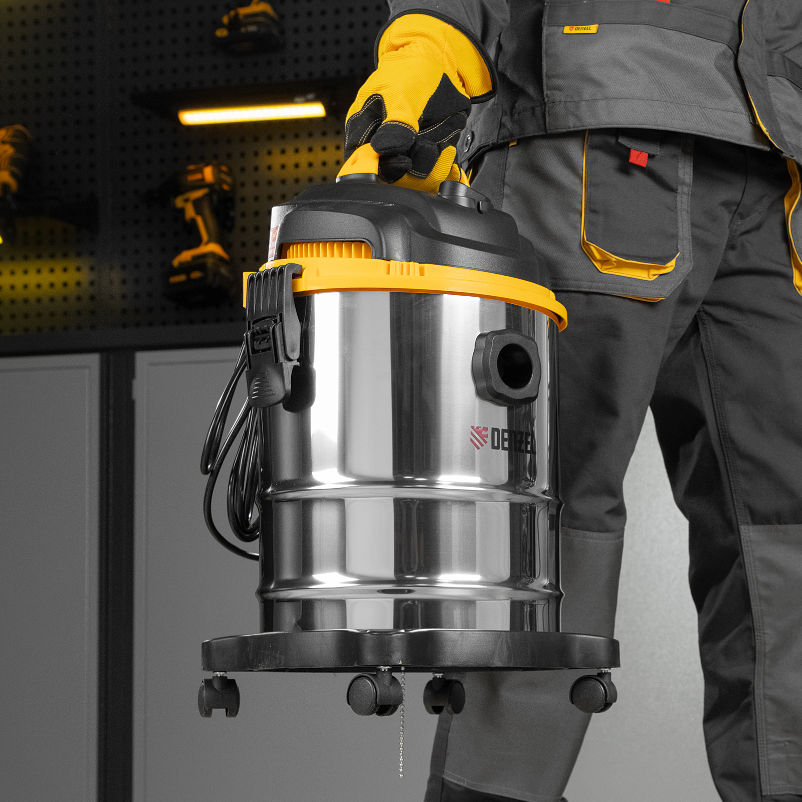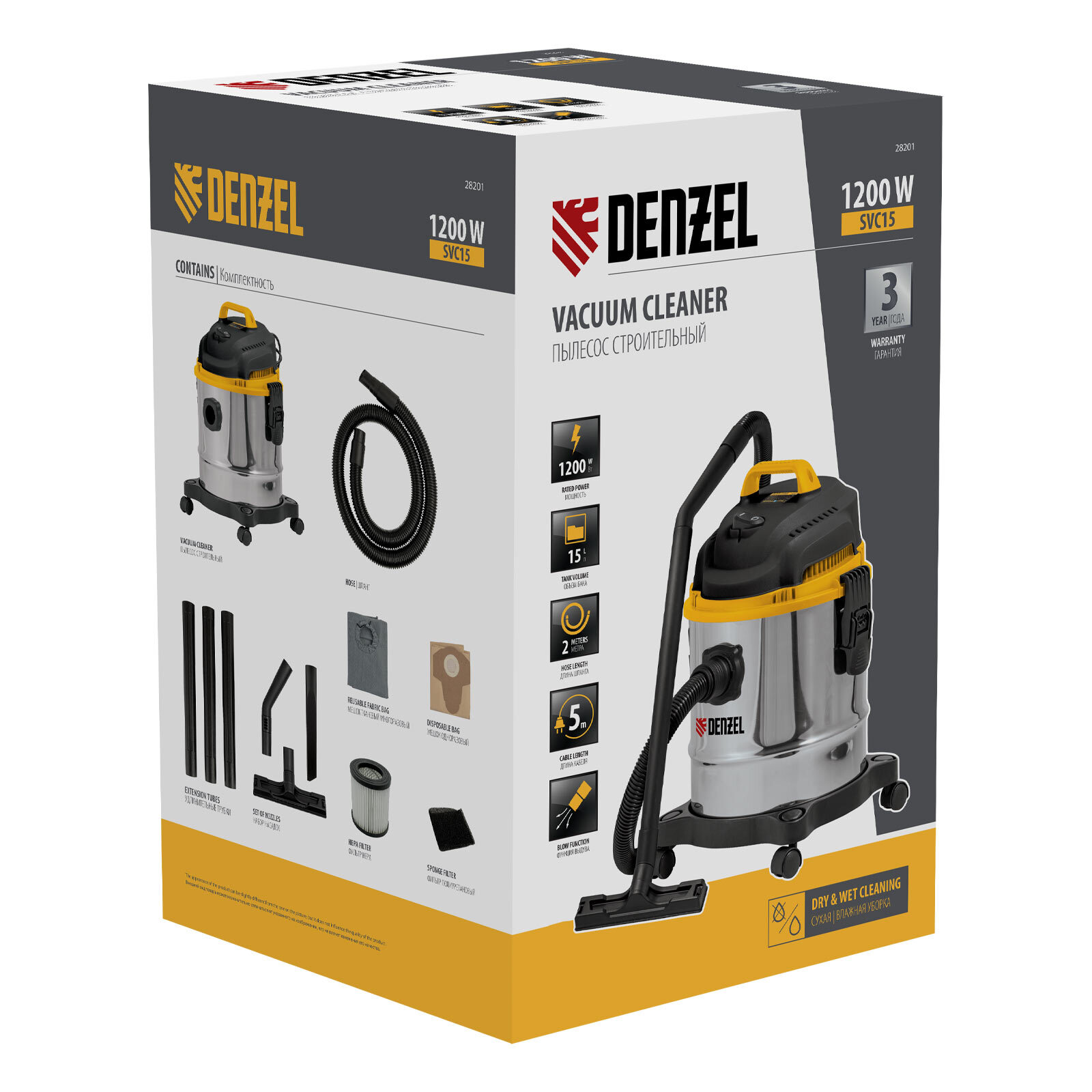 Пылесос строительный Denzel SVC15 28201 мощностью 1200 Вт, с баком объемом 15 л и шлангом длиной 2 м, предназначен для уборки бетонной, кирпичной пыли, опилок, стружки, также предусмотрена функция сбора воды. Пылесос используется во время проведения строительных и ремонтных работ, будет полезен для поддержания чистоты в мастерской, гараже, производственном помещении.