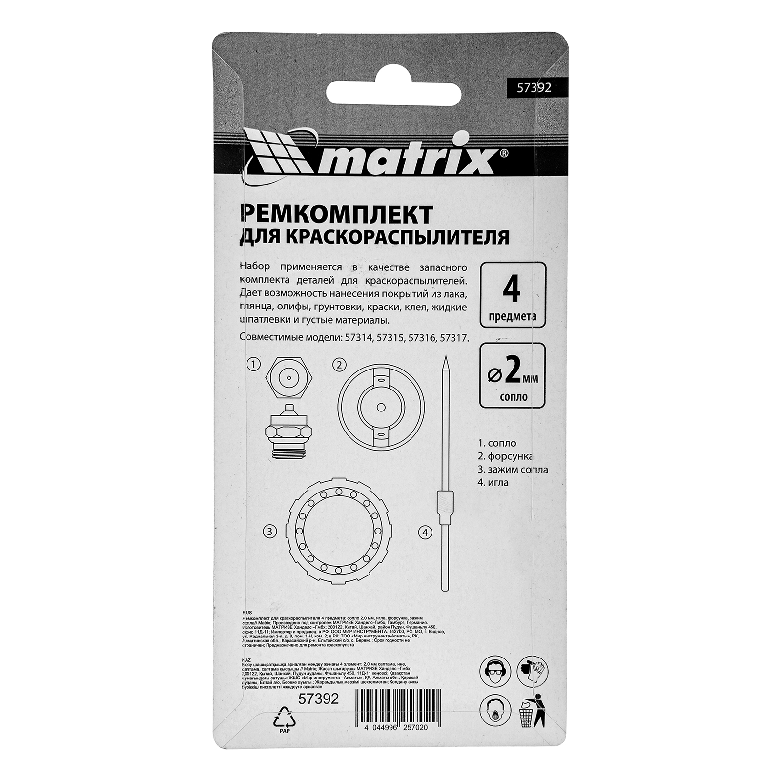 Ремкомплект для краскораспылителя 4 предмета: сопло 2,0 мм, игла, форсунка, зажим сопла Matrix