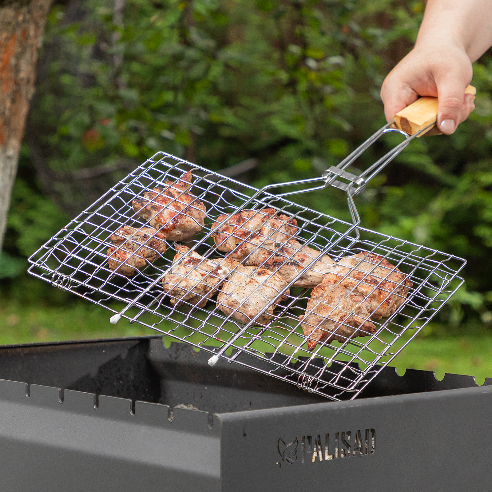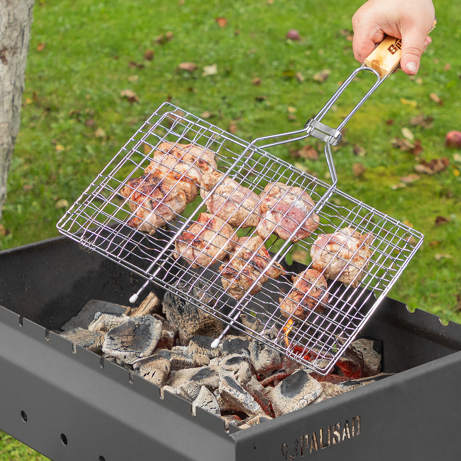 - Решетка имеет увеличенные опорные стержни, благодаря чему она надежно фиксируется на мангале, а рабочая поверхность при этом используется полностью.