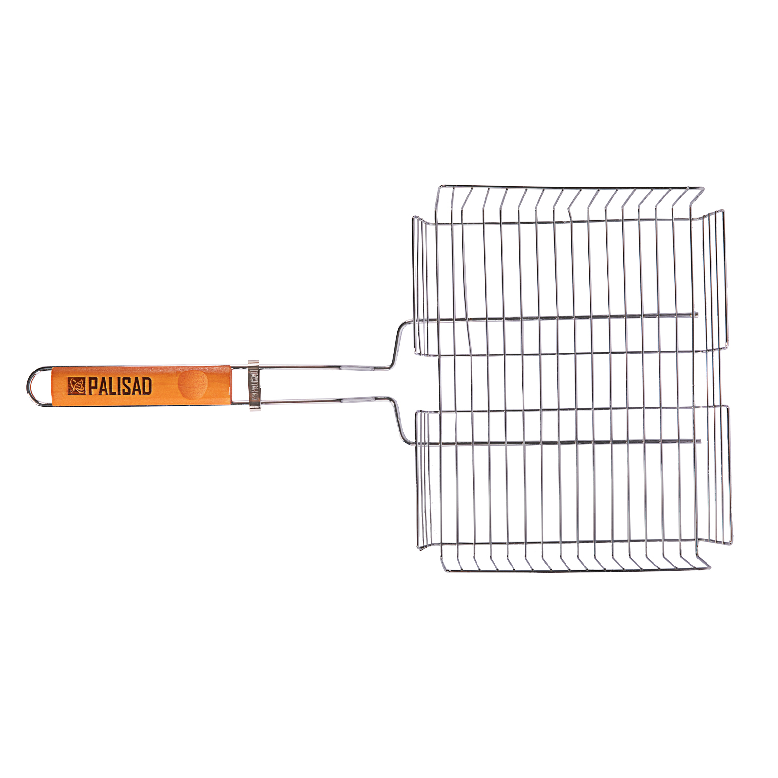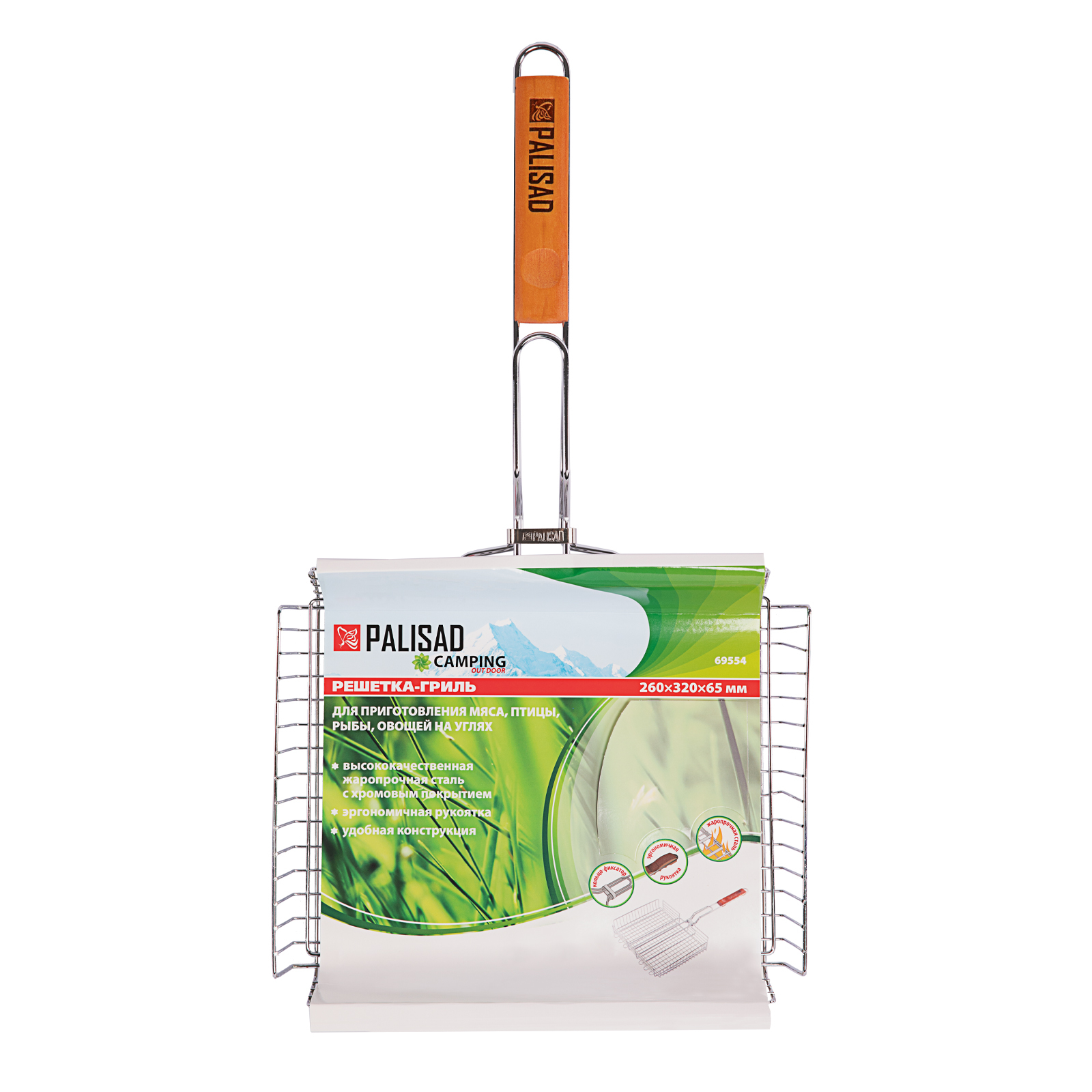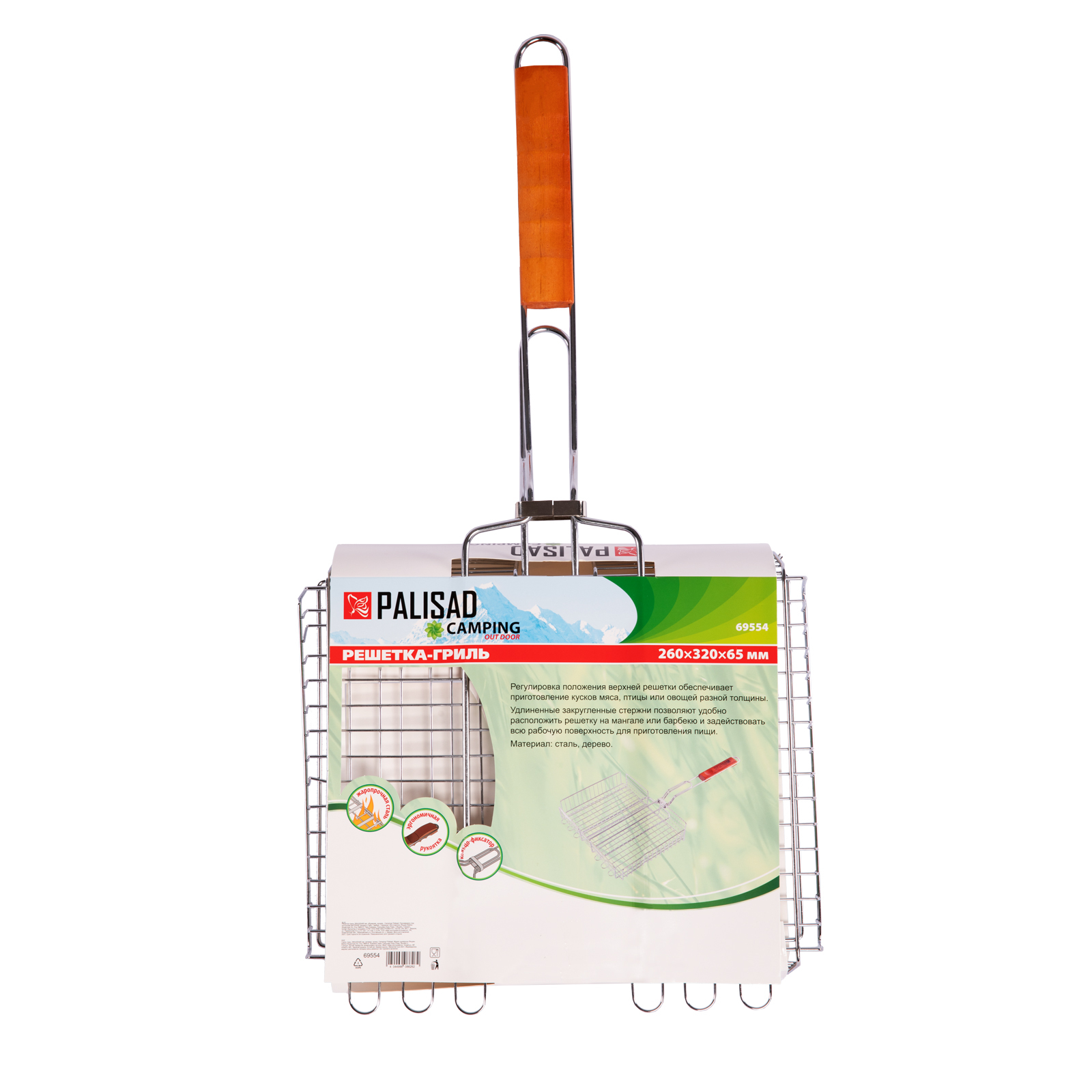 <p>Объемная хромированная решетка гриль Palisad Camping 69554 размером 260 х 320 х 65 мм позволяет легко жарить пищу с двух сторон в мангале. Объемная конструкция решетки с возможностью регулировки высоты позволяет приготовить крупные куски мяса и куриную тушку без потери сочности.</p><h2>Преимущества</h2><ul><li>Залогом надежности и долговечности решетки выступает высококачественная жаропрочная сталь, из которой она выполнена.</li><li>Хромовое покрытие придает решетке износостойкость и устойчивость к коррозии.</li><li>За счет увеличенных опорных стержней решетка надежно фиксируется на мангале, а для жарки используется вся рабочая площадь.</li><li>Для предотвращения случайного раскрытия решетки во время переворачивания решетка оснащена широким кольцом-фиксатором.</li><li>Рукоятка выполнена из древесины, поэтому ее приятно и удобно держать в руках.</li></ul>