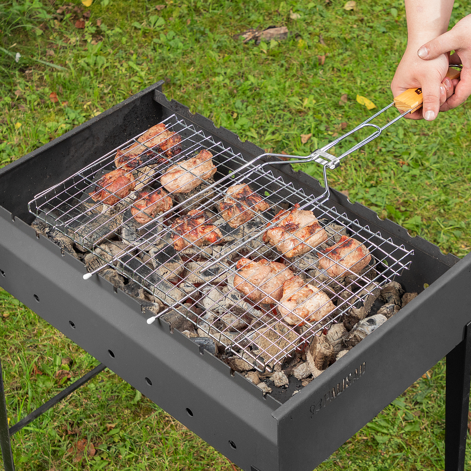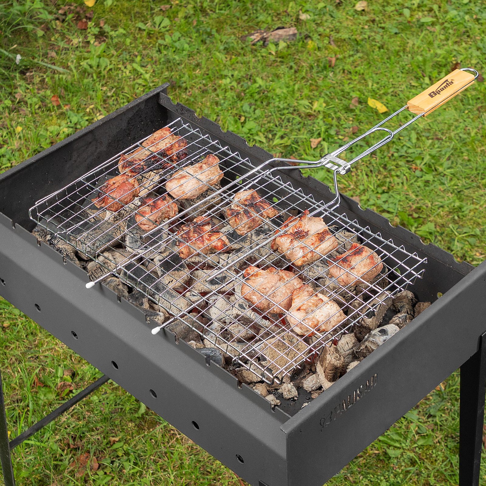 - Решетка имеет увеличенные опорные стержни, благодаря чему она надежно фиксируется на мангале, а рабочая поверхность при этом используется полностью.