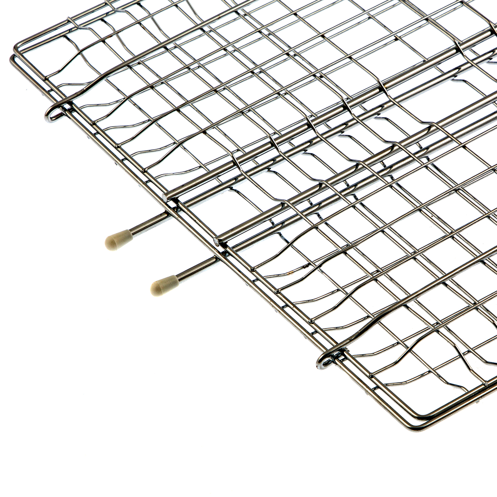- Решетка оборудована увеличенными опорными стержнями, за счет чего прочно фиксируется на мангале, а при готовке ее площадь используется полностью.