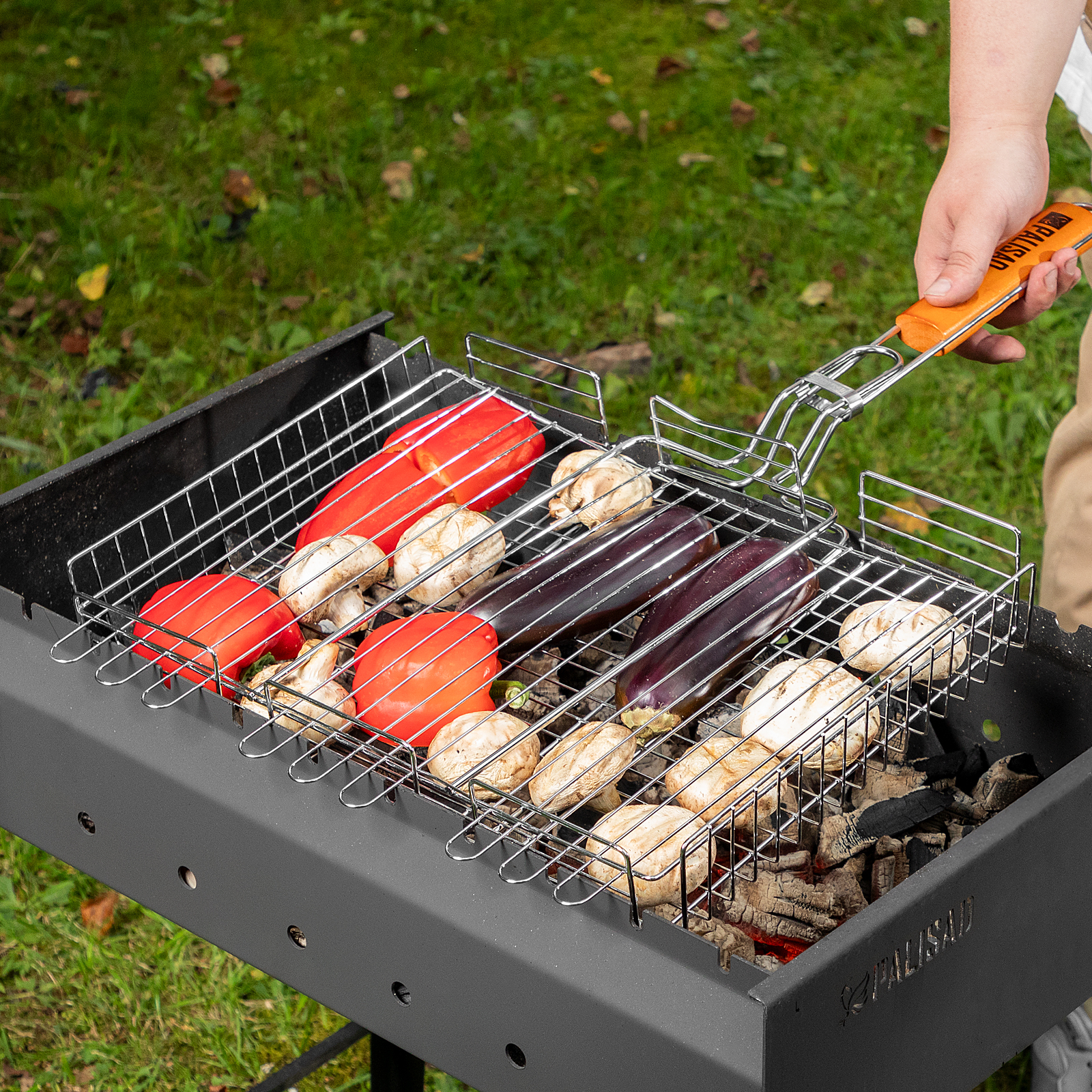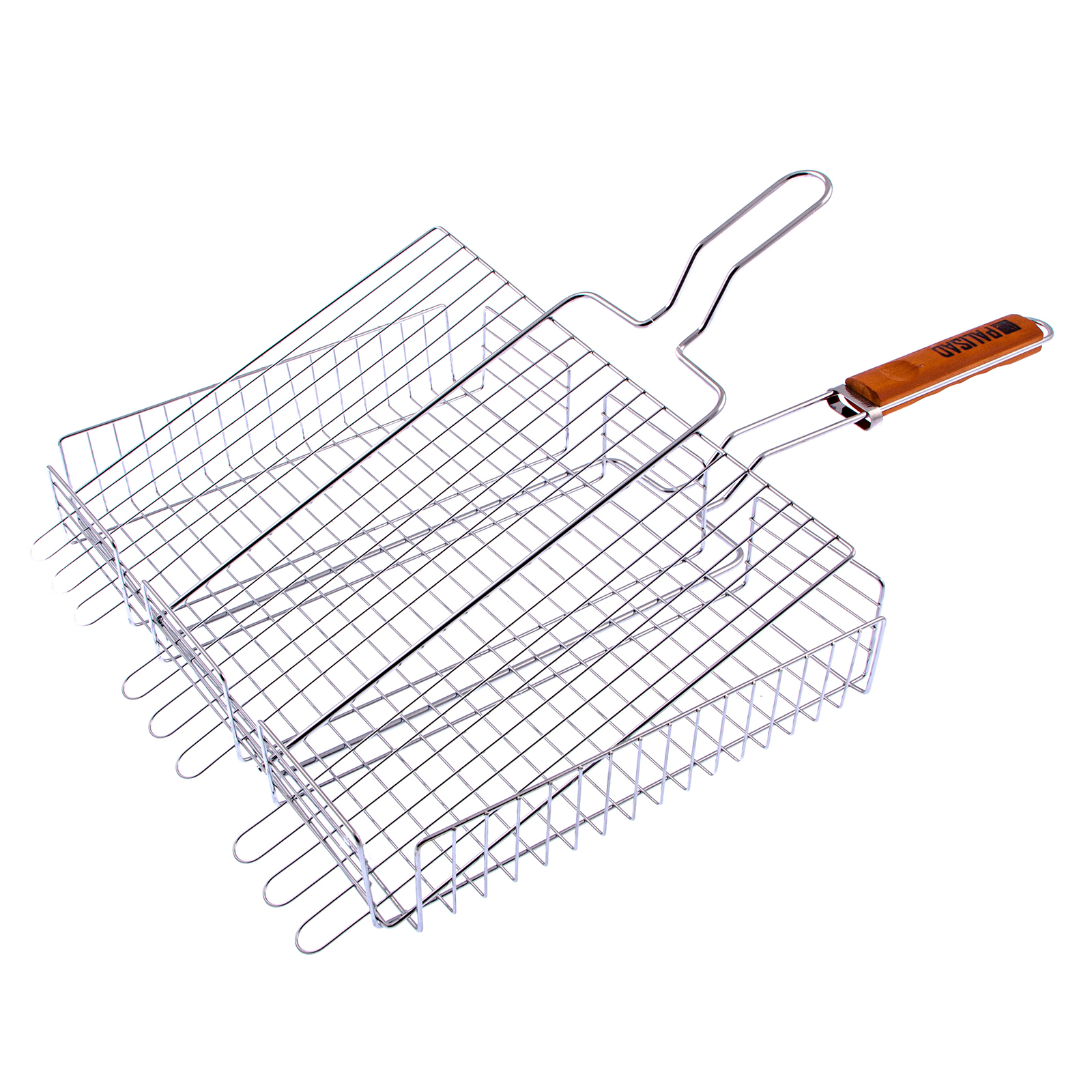 - За счет увеличенных опорных стержней решетка надежно фиксируется на мангале, а для жарки используется вся рабочая площадь.