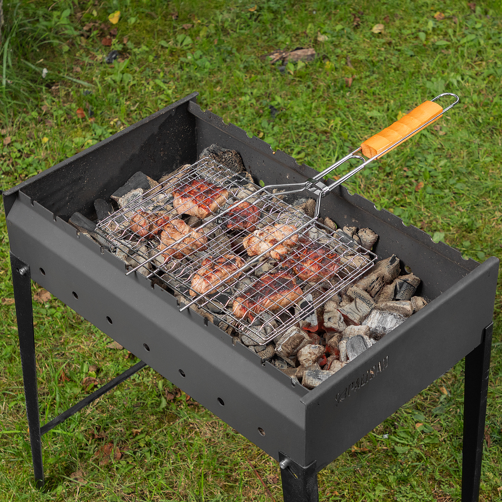 - Решетка оборудована увеличенными опорными стержнями, за счет чего прочно фиксируется на мангале, а при готовке ее площадь используется полностью.