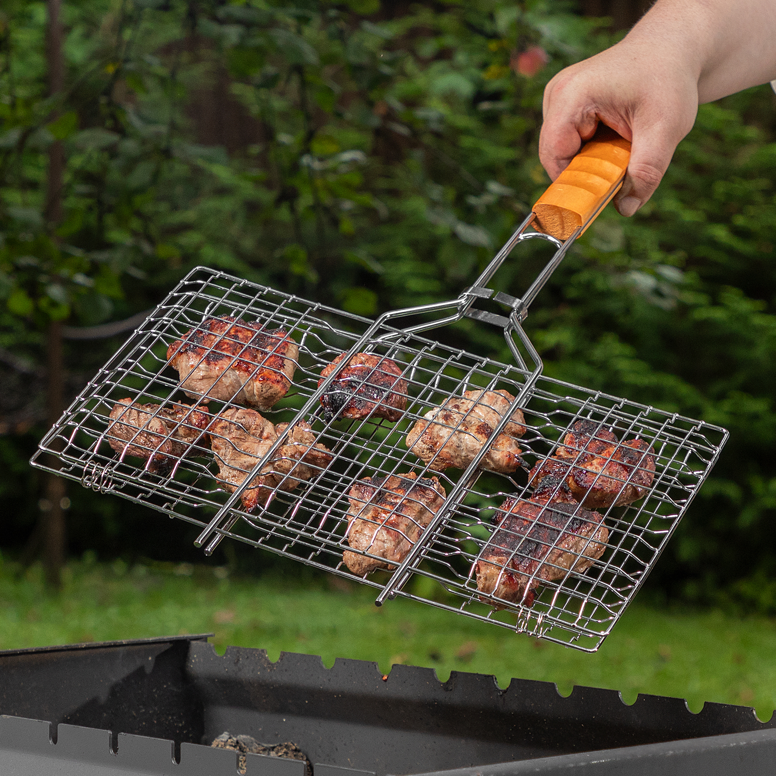 <p>Хромированная решетка гриль Palisad Camping 69557 размером 340 х 220 мм предоставляет возможность приготовления на углях продуктов, которые трудно наколоть на шампур. Она будет полезна любителям отдыха на открытом воздухе для жарки стейков, рыбы, овощей и т.д.</p><h2>Преимущества</h2><ul><li>Гарантией качества и долговечности решетки выступает жаропрочная сталь, из которой она выполнена.</li><li>Хромированная решетка устойчива к коррозии, поэтому на ней не образуется ржавчина.</li><li>Благодаря широкому кольцу-фиксатору части решетки не раскрываются в процессе эксплуатации, поэтому еда не выпадет.</li><li>Деревянная рукоятка оснащена подпальцевыми выемками для удобного захвата.</li><li>Решетка оборудована увеличенными опорными стержнями, за счет чего прочно фиксируется на мангале, а при готовке ее площадь используется полностью.</li></ul>
