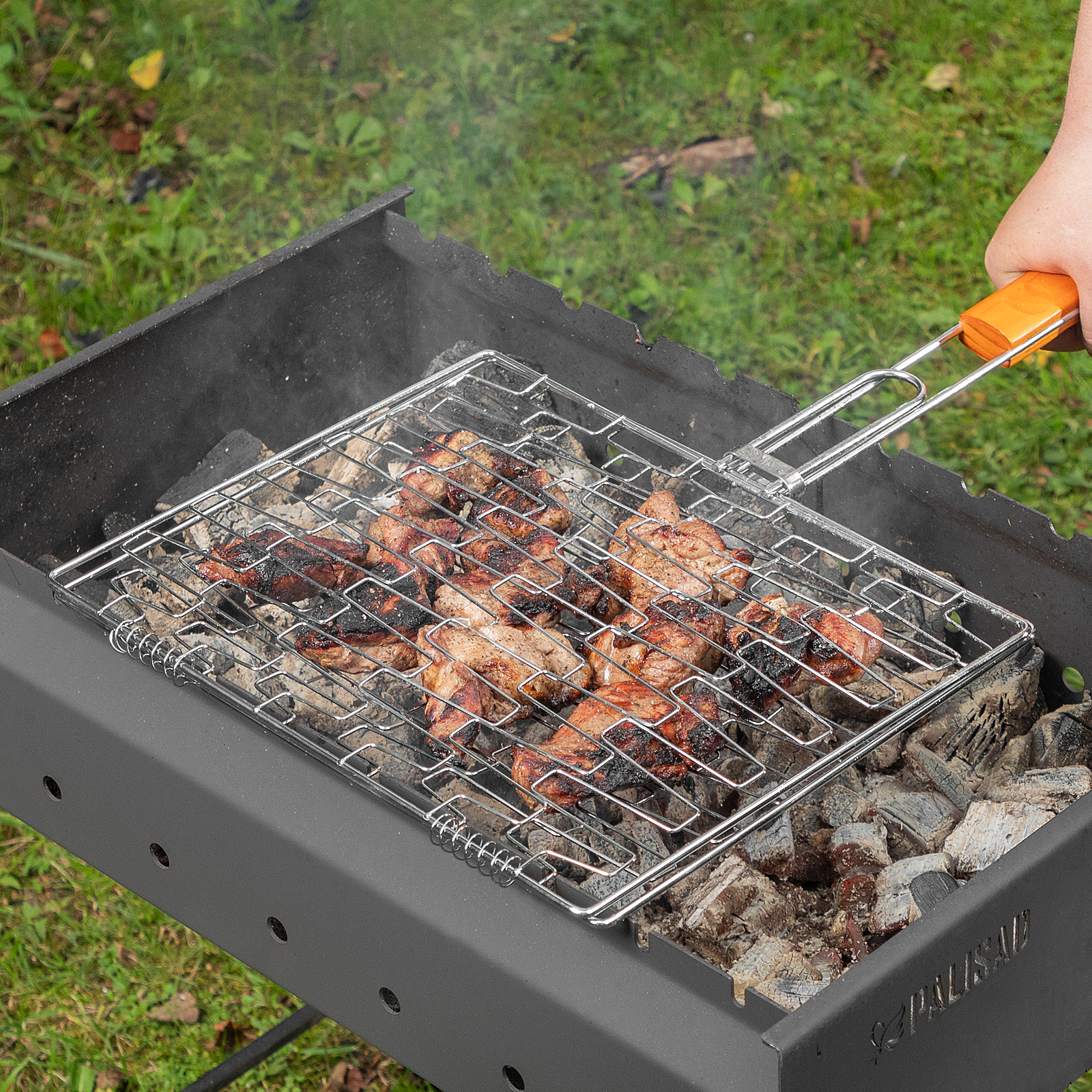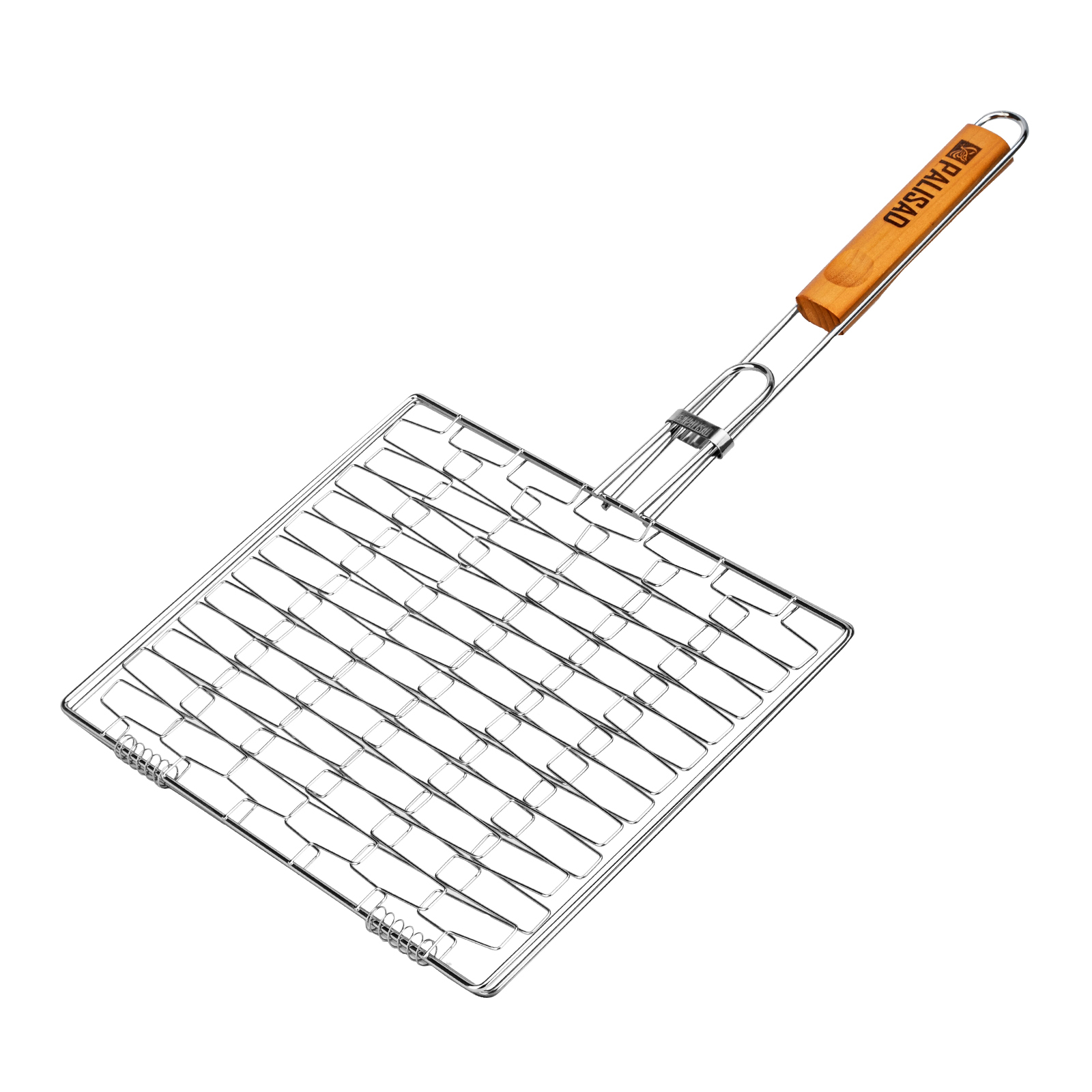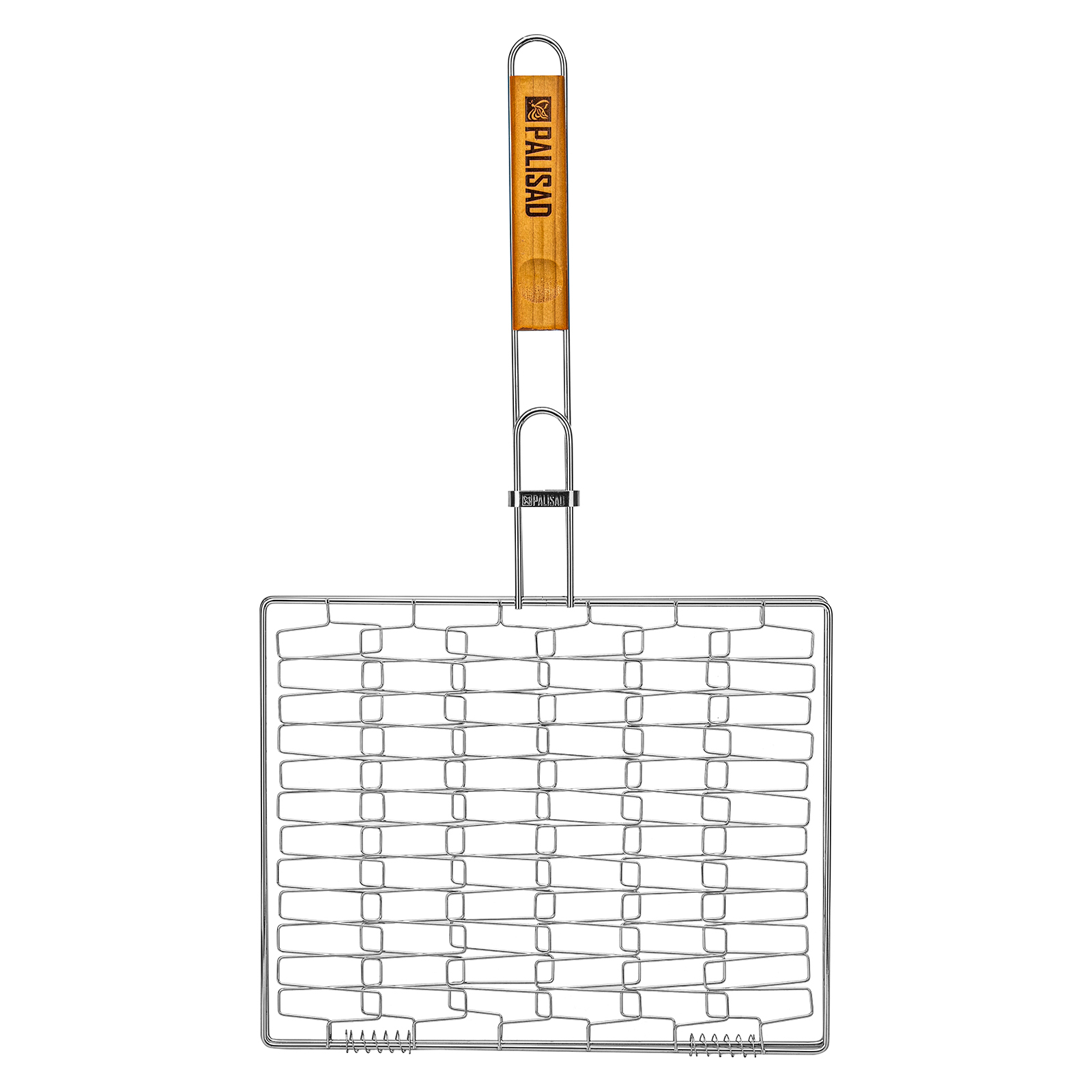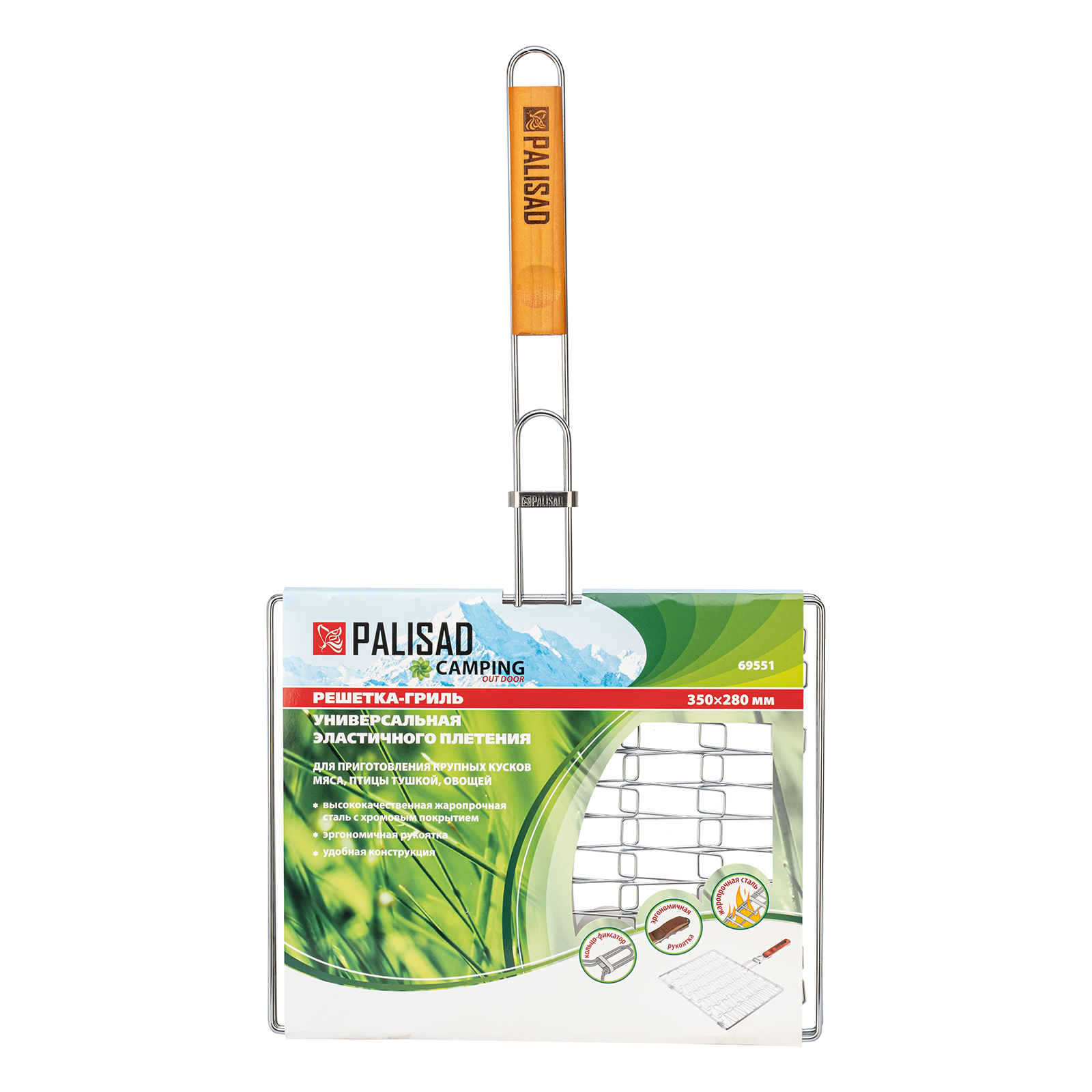 <p>Универсальная хромированная решетка-гриль Palisad Camping 69551 размером 350 х 280 мм за счет эластичного плетения подходит для продуктов любой формы, будь то целая курица или только крылышки. Она рассчитана на интенсивную эксплуатацию, поэтому оптимальна для тех, кто часто готовит еду на углях.</p><h2>Преимущества</h2><ul><li>Решетка прослужит долго, т.к. выполнена из жаропрочной стали высокого качества.</li><li>Хромовое покрытие предохраняет решетку от образования коррозии.</li><li>Удобство эксплуатации и защиту пользователя от ожогов обеспечивает эргономичная рукоятка из древесины.</li><li>Решетка оснащена широким кольцом-фиксатором для исключения риска случайного раскрытия во время переворачивания.</li></ul>