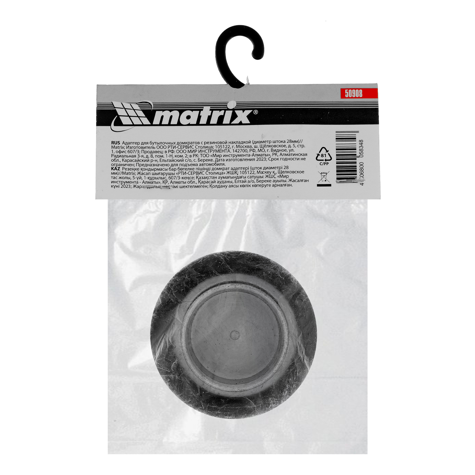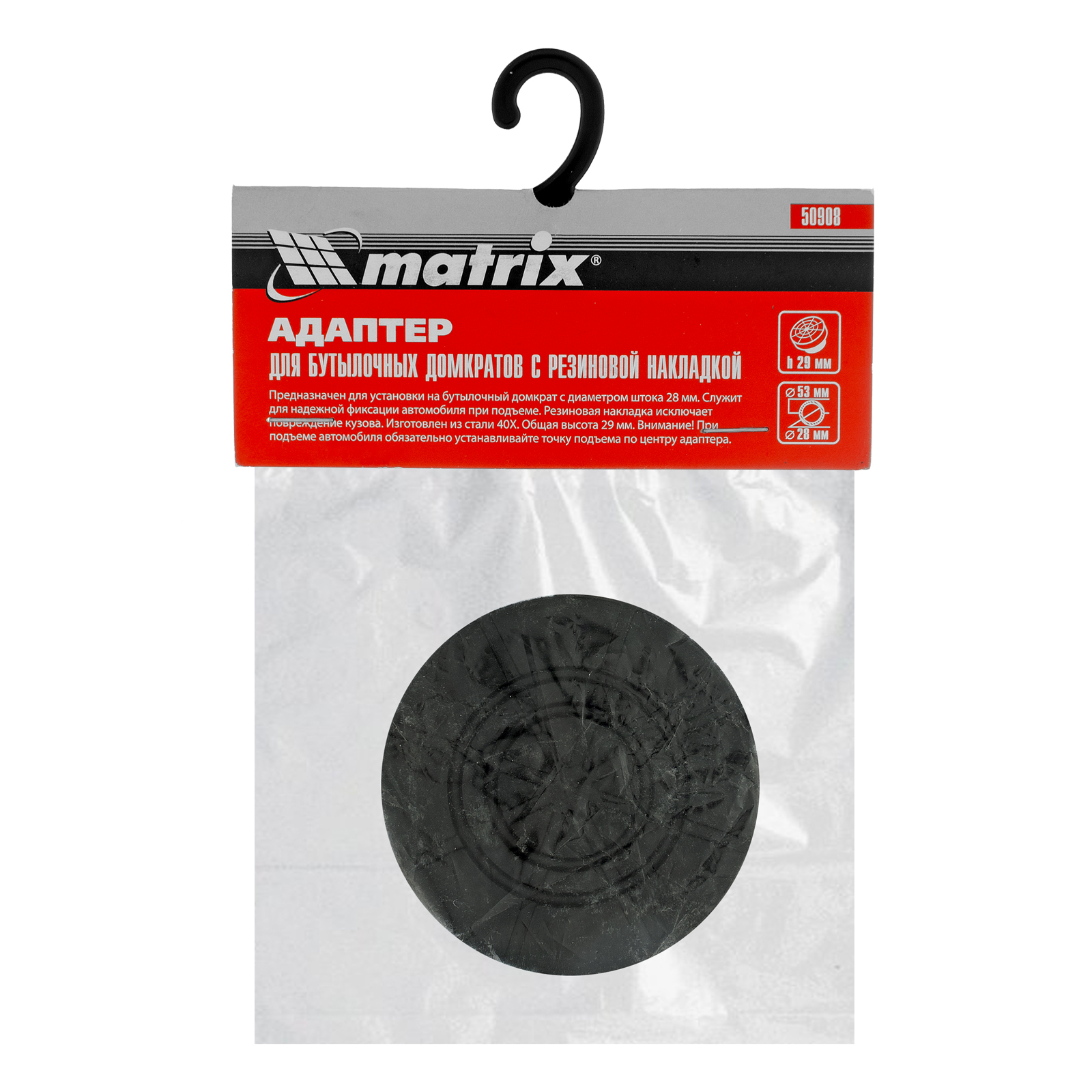 <p>Адаптер для бутылочных домкратов Matrix 50908 с резиновой накладкой устанавливается на шток диаметром 28 мм и защищает кузов автомобиля во время его подъема. Уверенно выдерживает нагрузку в 4 тонны. Опора совместима с домкратами Sparta 50323, 50333, 50342, Matrix 50717, 50752, 50754, Stels 51102, 51145, 51162.</p><h2>Преимущества</h2><ul><li>Прочность — адаптер из стали и резины защищает от повреждений кузов машины и опорную площадку домкрата даже при подъеме максимально возможного веса.</li><li>Увеличенная площадь опоры — диаметр накладки более чем вдвое превышает диаметр штока домкрата, что позволяет равномерно распределить нагрузку и обеспечить устойчивость груза.</li><li>Надежная фиксация — эластичная резина плотно прилегает к поверхности груза, предотвращая его соскальзывание.</li></ul>