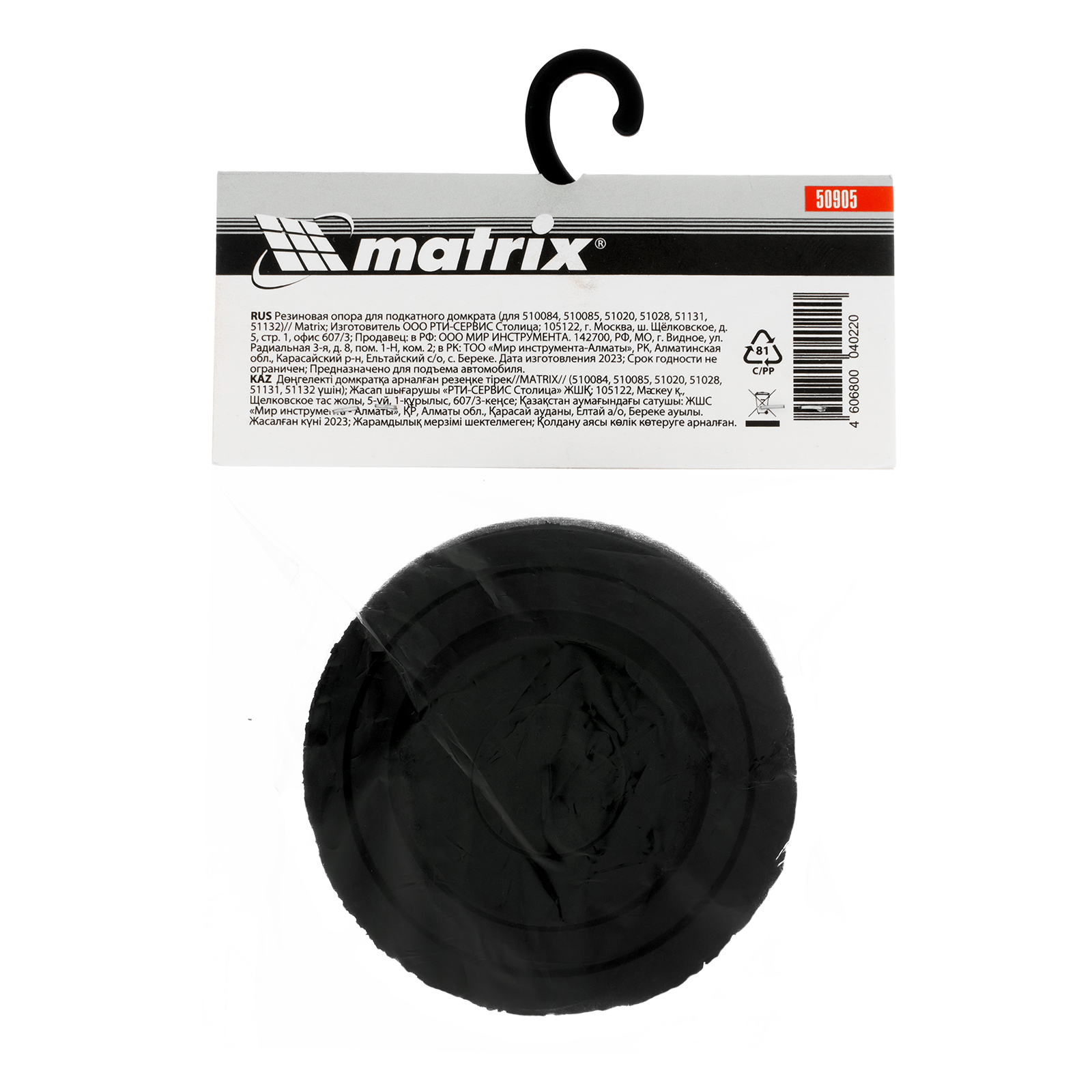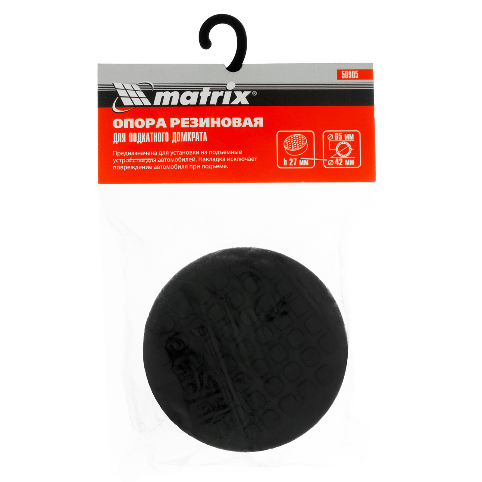 <p>Резиновая опора Matrix 50905 подходит к домкратам 510084, 510085, 51020, 51028, 51131, 51132, 51127, 51152, 51040. Она используется в качестве защиты для верхней части домкрата и кузова автомобиля, позволяет надежно зафиксировать транспортное средство при подъеме без риска появления царапин и вмятин.</p><h2>Преимущества</h2><ul><li>Надежность и прочность — опора выполнена из эластичной резины, установленной на стальной шток.</li><li>Устойчивость к атмосферным воздействиям — опору можно использовать при температуре от -30 до +50 °C.</li><li>Удобная упаковка — ПВХ-пакет с подвесом позволяет с удобством транспортировать и размещать опору на стенде.</li></ul>