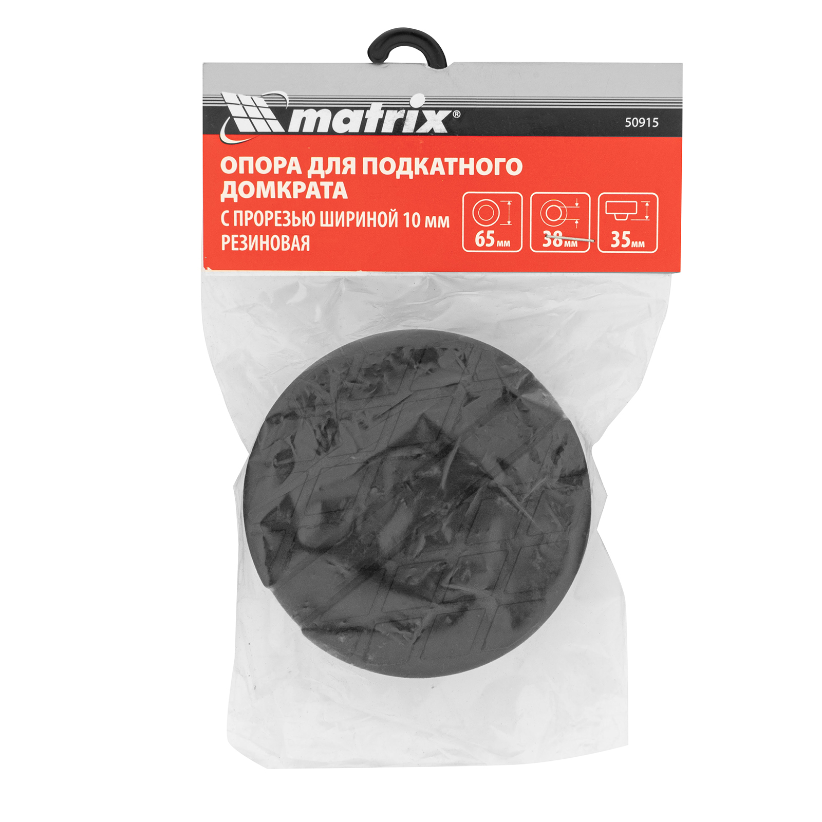 <p>Резиновая опора с прорезью Matrix 50915 диаметром 65 мм предотвращает повреждение кузова автомобиля в месте упора с подкатным домкратом, а также препятствует поломке самого домкрата. Позволяет осуществить качественный ремонт машины в гараже или автосервисе.</p><h2>Преимущества</h2><ul><li>Надежность — накладка из эластичной и прочной резины, установленная на стальной шток, обладает стойкостью к истиранию и нагрузкам.</li><li>Использование в любое время года — допустимый температурный диапазон эксплуатации опоры от -30 до +50 °C.</li><li>Удобная упаковка — ПВХ-пакет обеспечивает удобство транспортировки и возможность размещения товара на стенде.</li></ul>