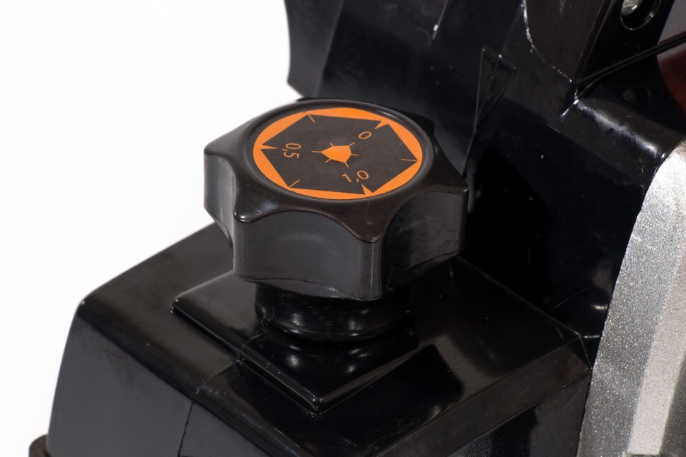 - Эргономичность — рукоятка со сглаженными краями удобно ложится в руку, вентиль для регулировки глубины строгания можно использовать для дополнительного захвата другой рукой.