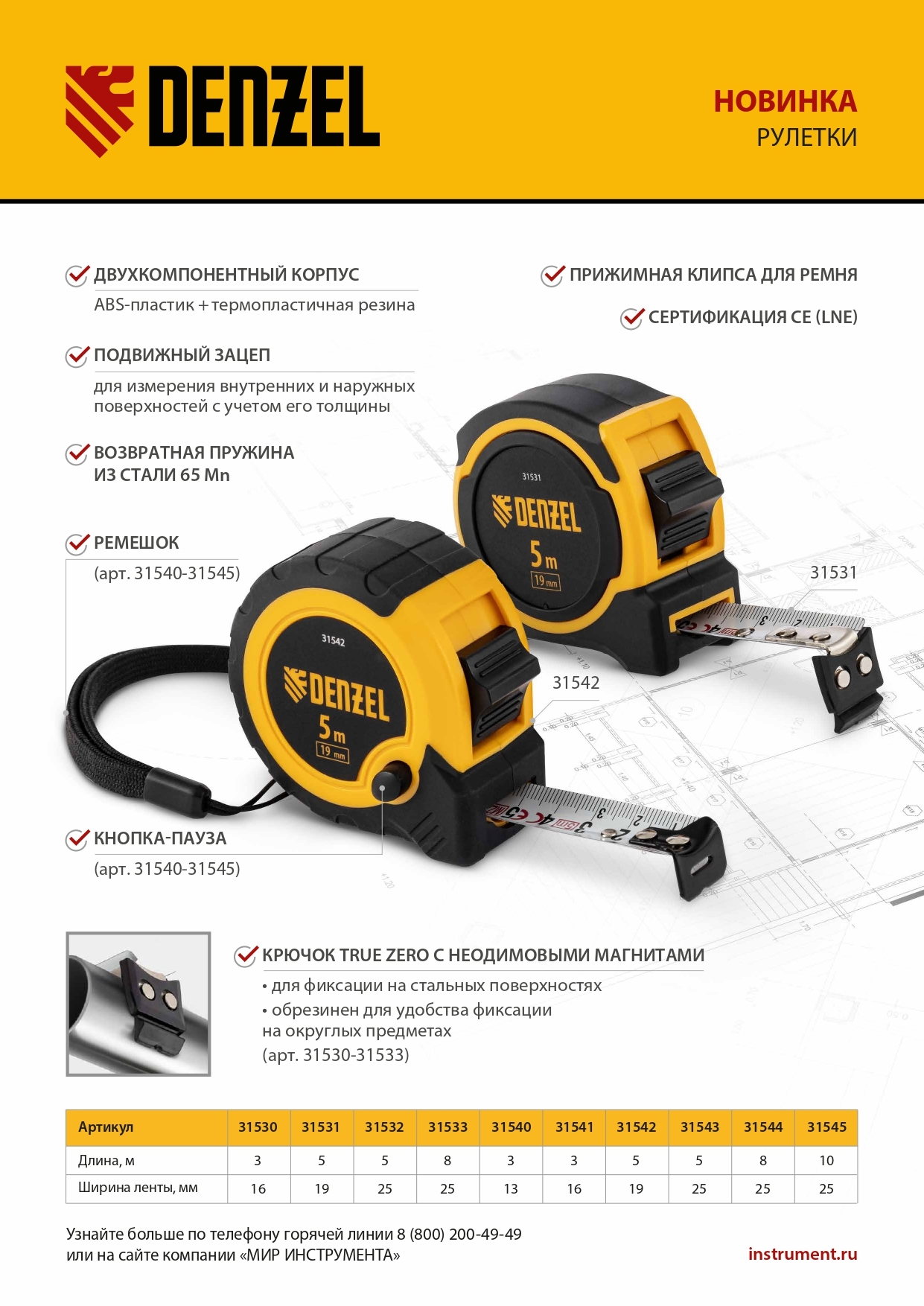 Рулетка Denzel 31540 в двухкомпонентном корпусе, с кнопкой-паузой, с полотном шириной 13 мм и длиной 3 м, используется для измерения расстояний и размеров предметов. Стальная лента с эмалевым покрытием и защитной пластиной в месте крепления зацепа рассчитана на долгий срок службы. Рулетка будет полезна во время строительства и ремонта, а также пригодится в быту.
