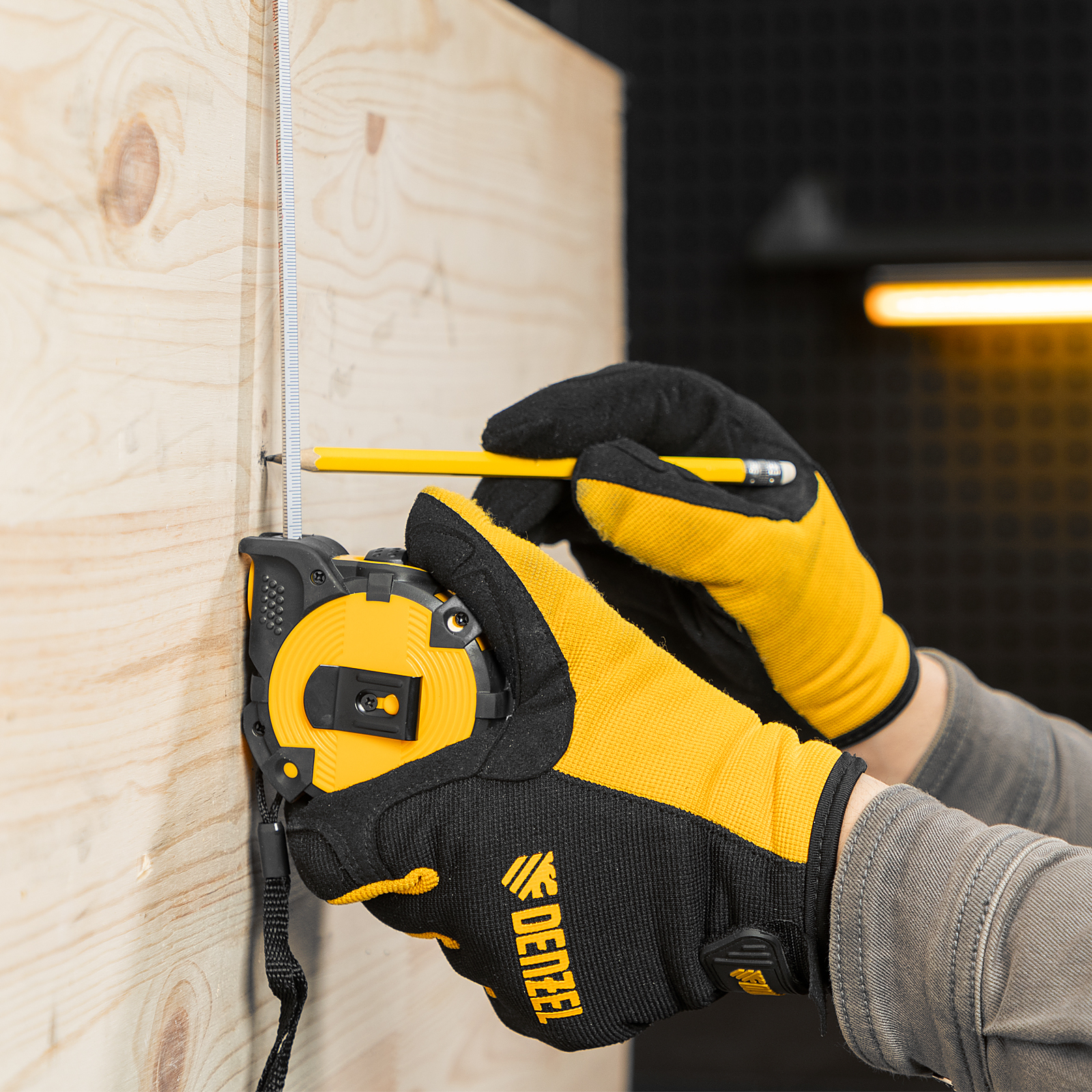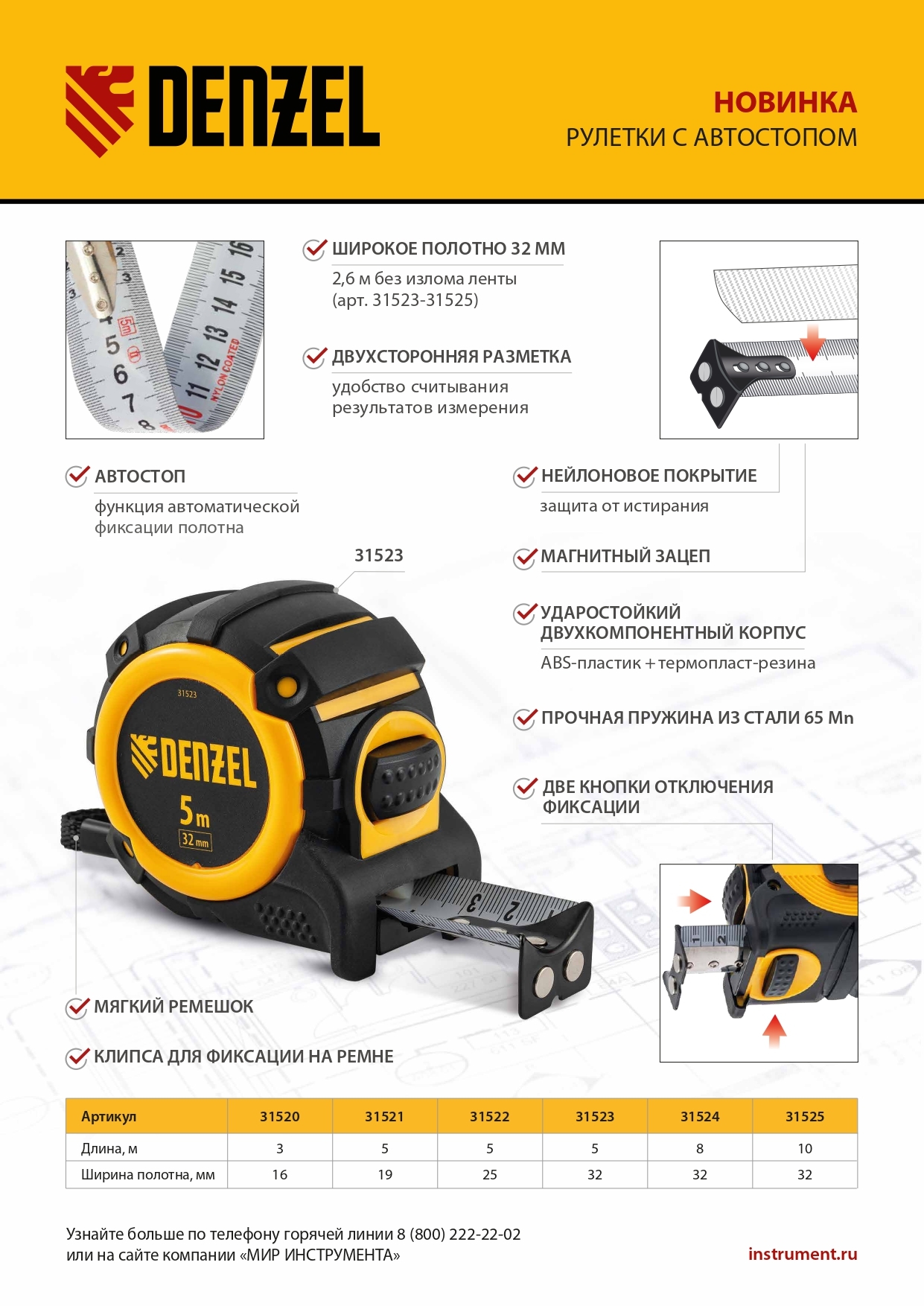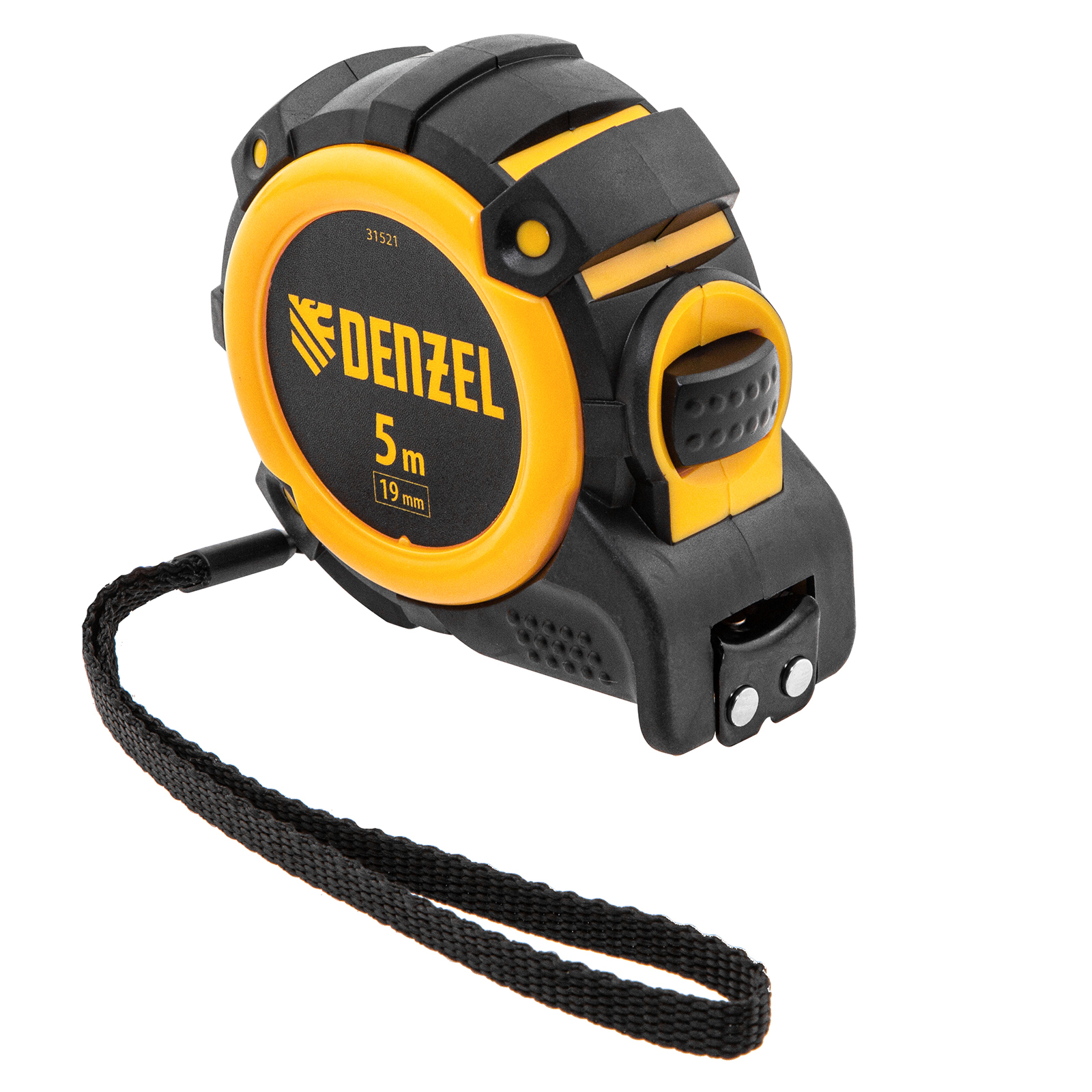Рулетка 5м х 19мм, автоматич. фиксац., нейлон. покрытие, магнит. зацеп, двухстор. разметка Denzel