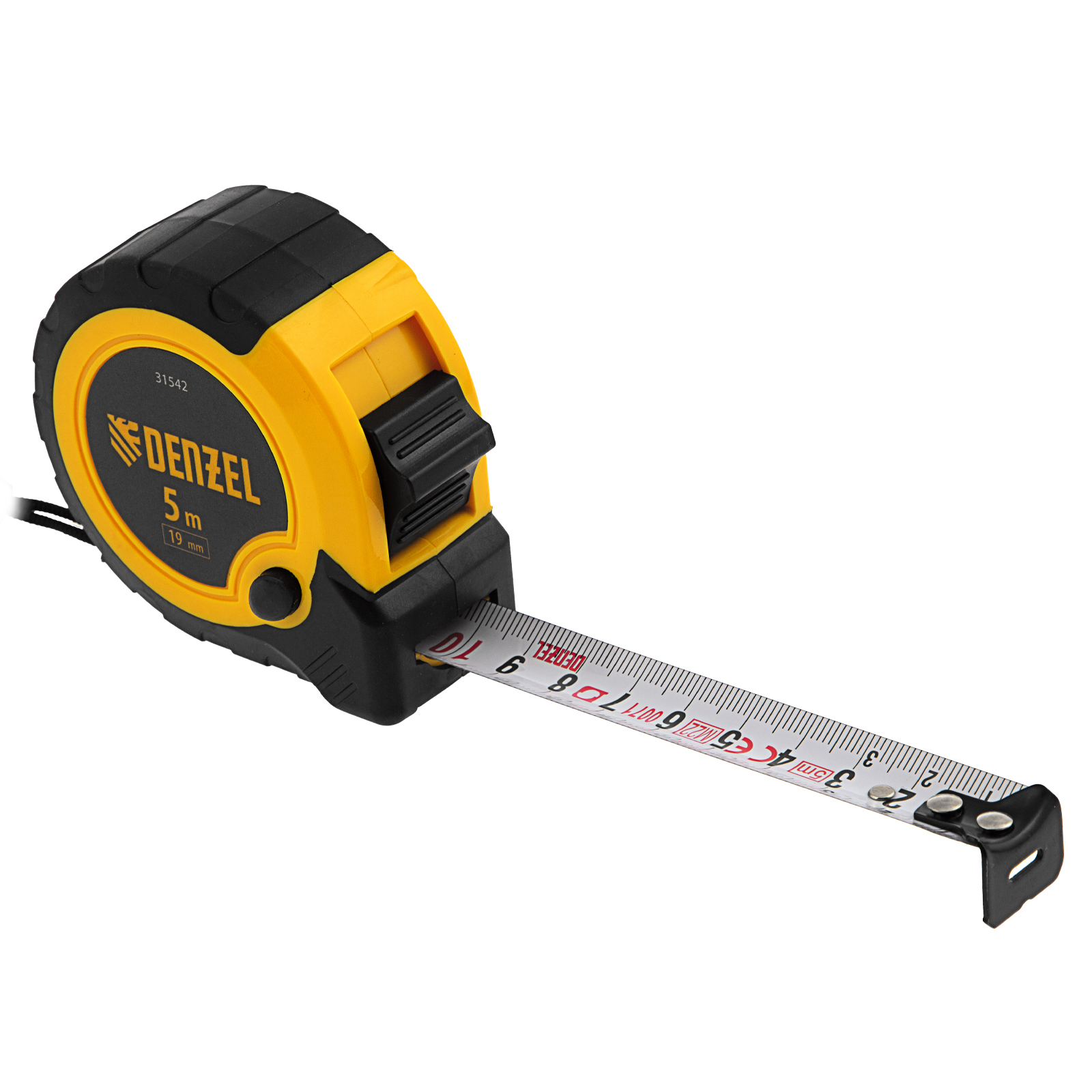Рулетка Denzel 31542 в двухкомпонентном корпусе, с кнопкой-паузой, с полотном шириной 19 мм и длиной 5 м, используется для измерения расстояний и размеров предметов. Стальная лента с эмалевым покрытием и защитной пластиной в месте крепления зацепа рассчитана на долгий срок службы. Рулетка будет полезна во время строительства и ремонта, а также пригодится в быту.