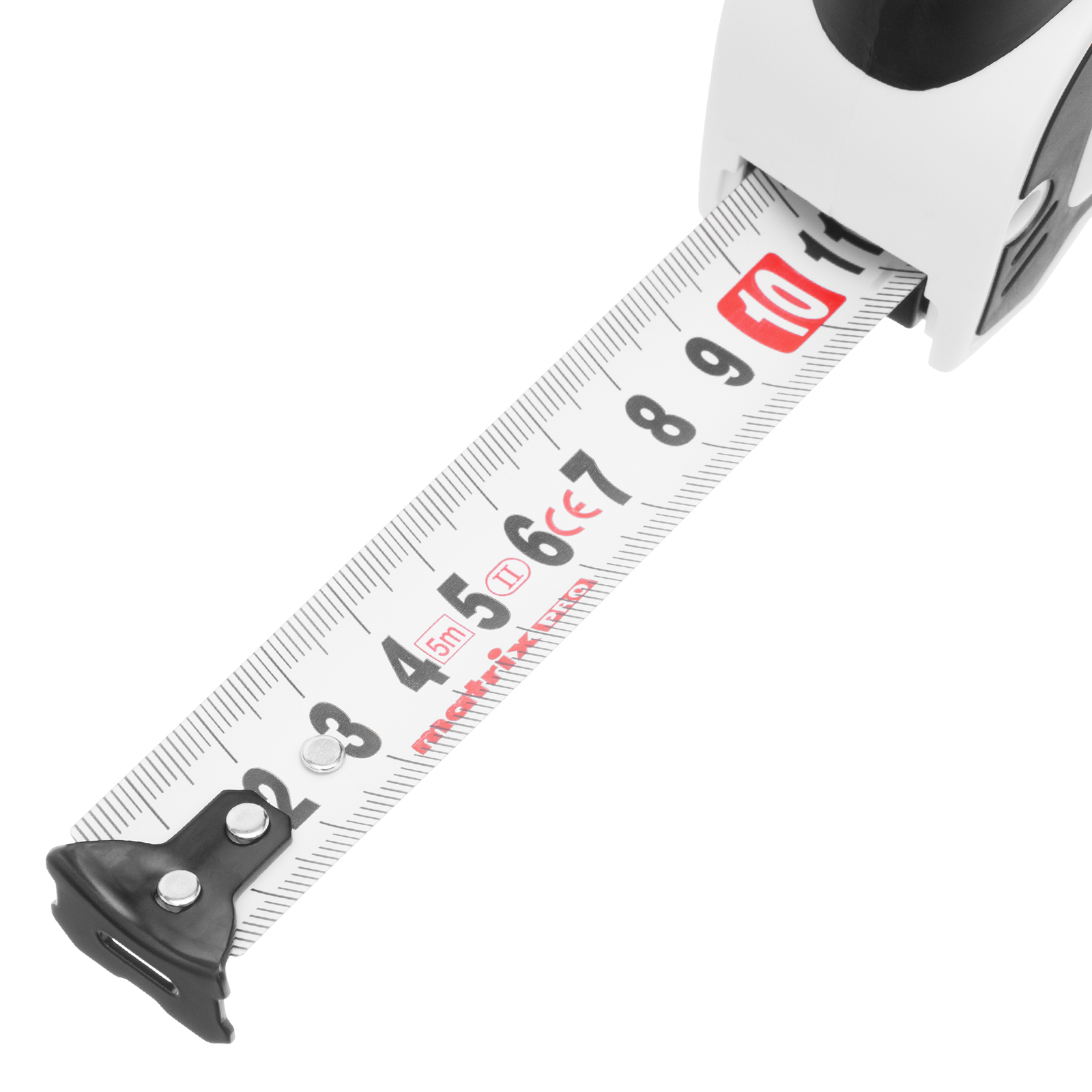 Рулетка Matrix PRO Autostop 32552 с полотном длиной 5 м и шириной 25 мм, в двухкомпонентном корпусе, с автоматической фиксацией ленты, используется для измерения объектов и расстояний. Корпус изготовлен из ударопрочного ABS-пластика, резиновые элементы увеличивают его сопротивляемость механическим нагрузкам. Заклепки надежно фиксируют зацеп на конце измерительного полотна. Рулетка подходит для профессионального и бытового применения.