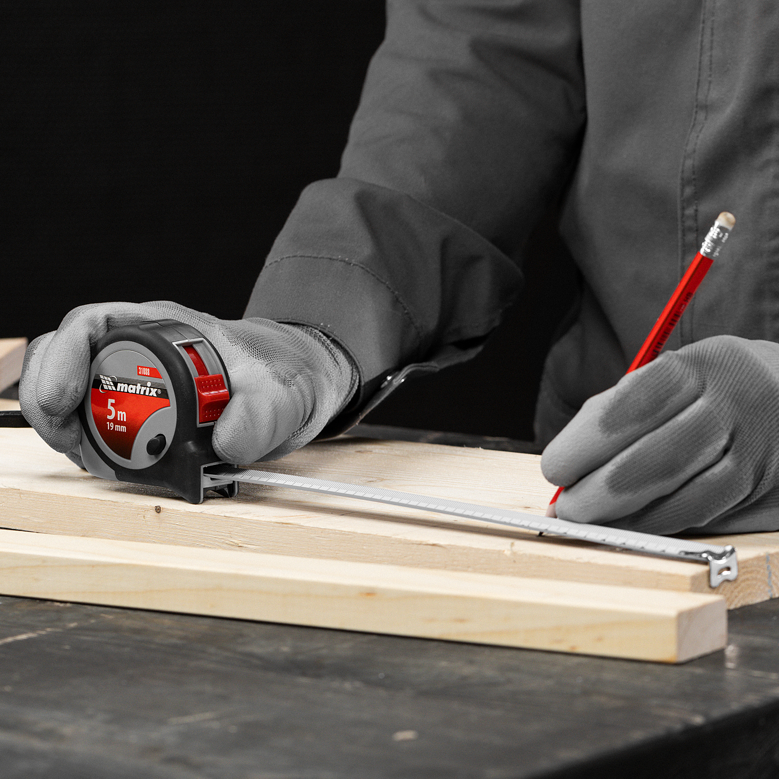 Рулетка Matrix Continuous fixation 31088 с полотном длиной 5 м и шириной 19 мм, в двухкомпонентном корпусе, с плавной фиксацией, — измерительный инструмент с ценой деления 1 мм и классом точности 2. Эргономичный корпус удобно ложится в руку, обеспечивая комфорт во время работы. Зацеп надежно закреплен на конце измерительной ленты при помощи заклепок. Рулетка пригодится в быту, а также будет полезна во время строительства или ремонта.