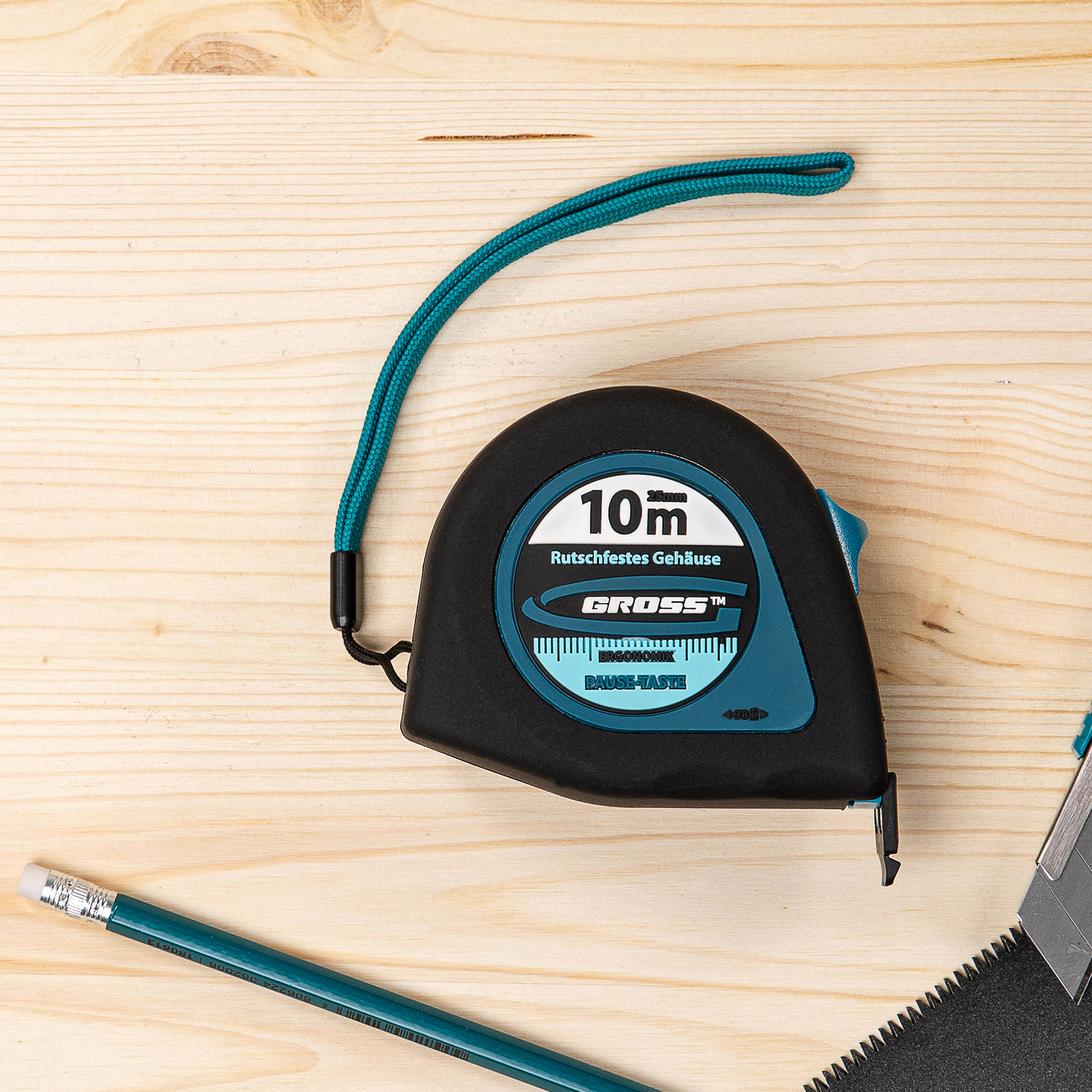 Рулетка Gross «Ergonomisch» 31105 с лентой 10 м х 25 мм и магнитным обрезиненным зацепом пригодится для проведения измерительных работ в хозяйстве и на строительной площадке. Обрезиненный магнитный зацеп надежно фиксируется на металлических поверхностях, а также на круглых и изогнутых предметах, например, трубах. Карманный инструмент удобно брать с собой на выездные работы.