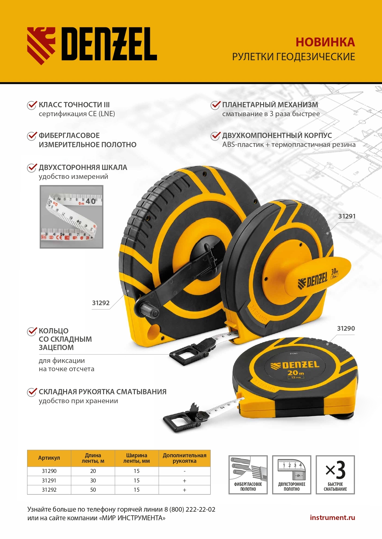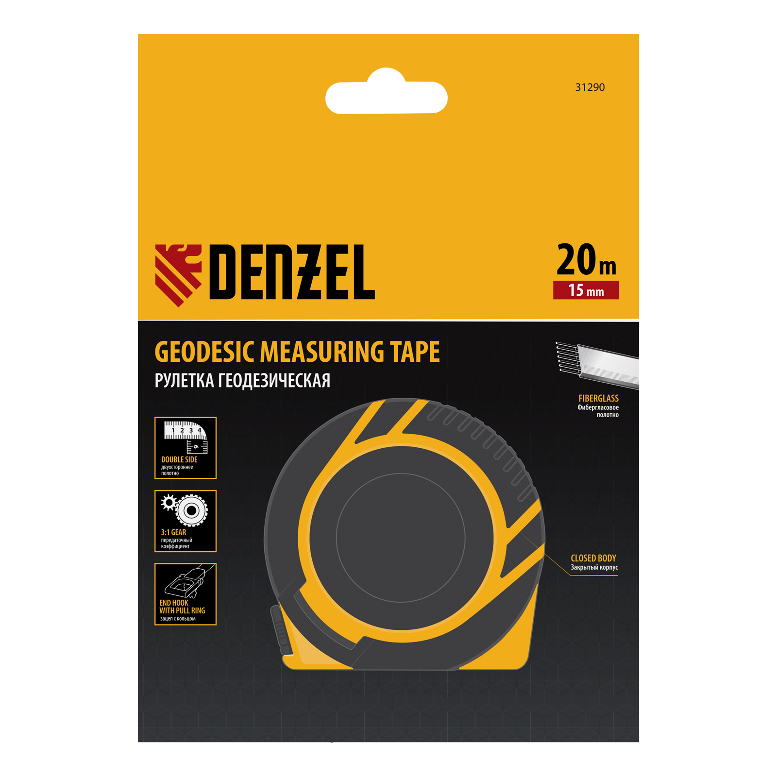 Рулетка геодезическая 20 м х 15 мм, закрытый корпус, фиберглассовая лента Denzel