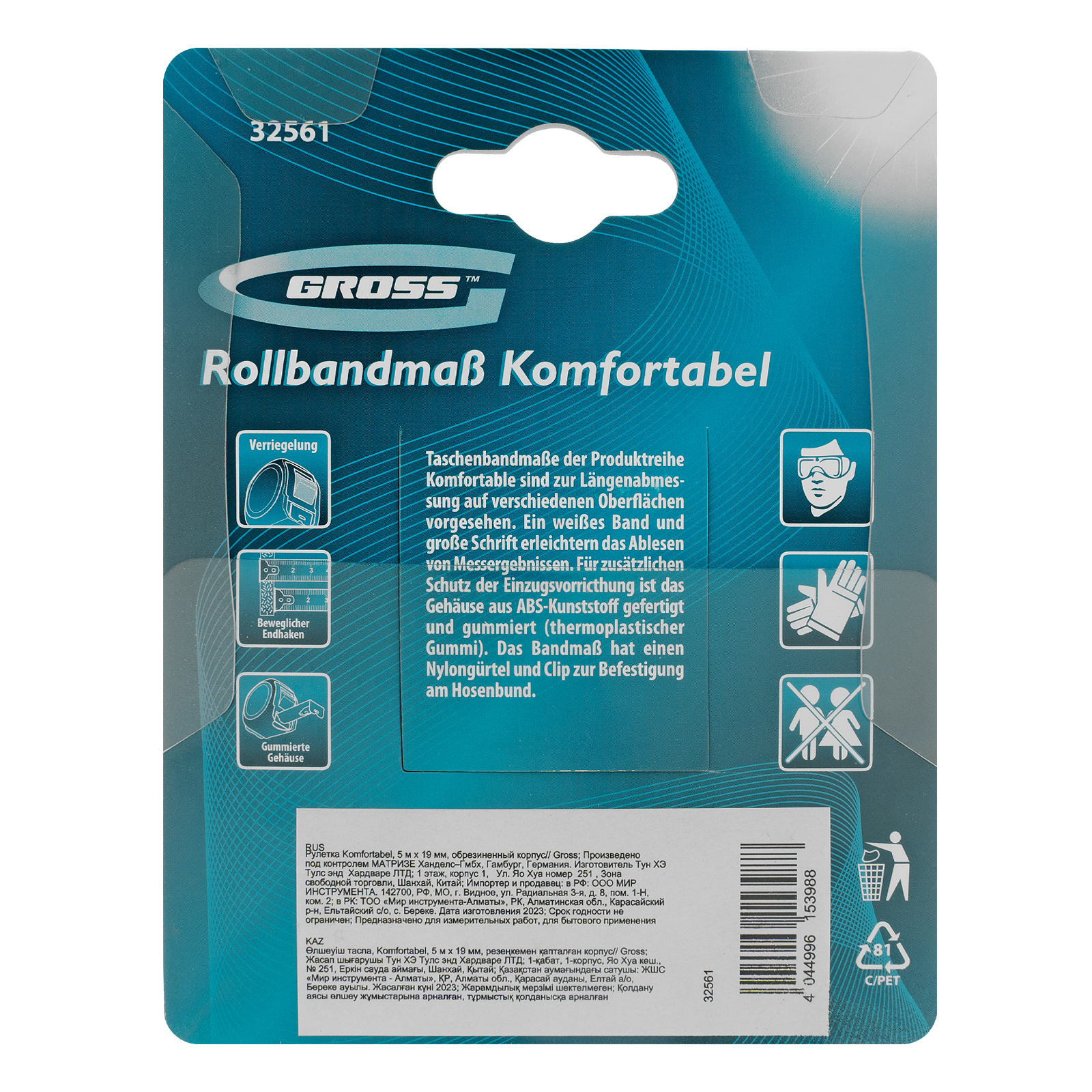 Рулетка Komfortabel 5 м х 19 мм,обрезиненный корпус Gross