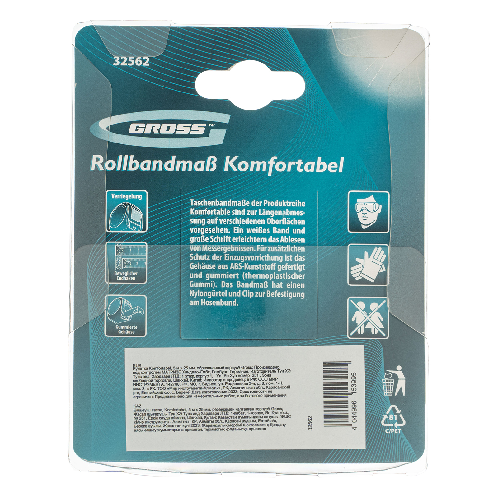 Рулетка Gross «Komfortabel» 32562 в обрезиненном корпусе с лентой длиной 5 м и шириной 25 мм — карманный инструмент для проведения измерительных работ. Позволяет выполнить линейные измерения ровных поверхностей, различных заготовок, материалов, конструкций и т.д.