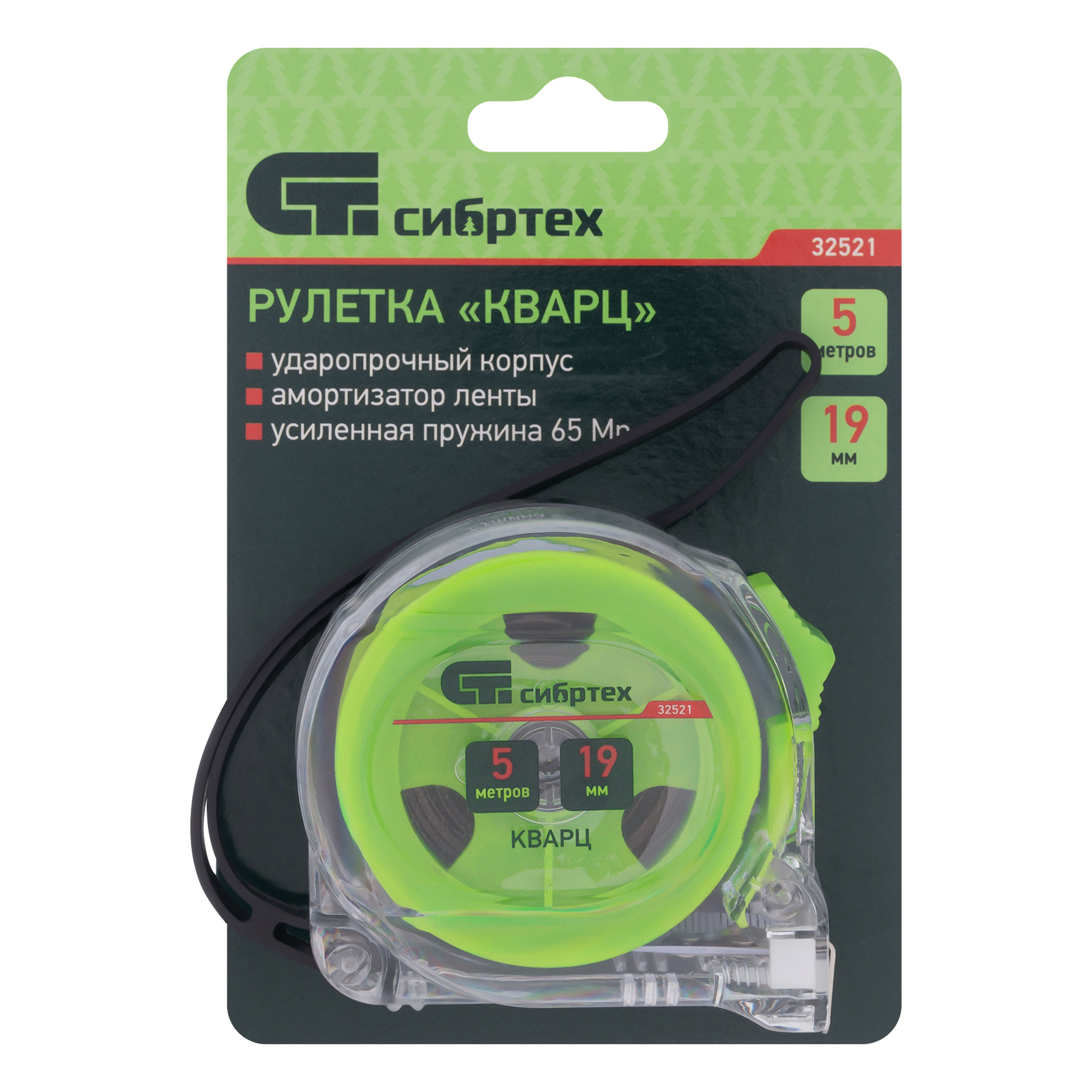 Рулетка Сибртех Кварц 32521 с полотном размером 5 м х 19 мм, в прозрачном корпусе, с амортизатором, будет полезна для измерения длины конструкций, строительных материалов и т.д. Пригодится на строительной площадке, в гараже, мастерской и в быту.