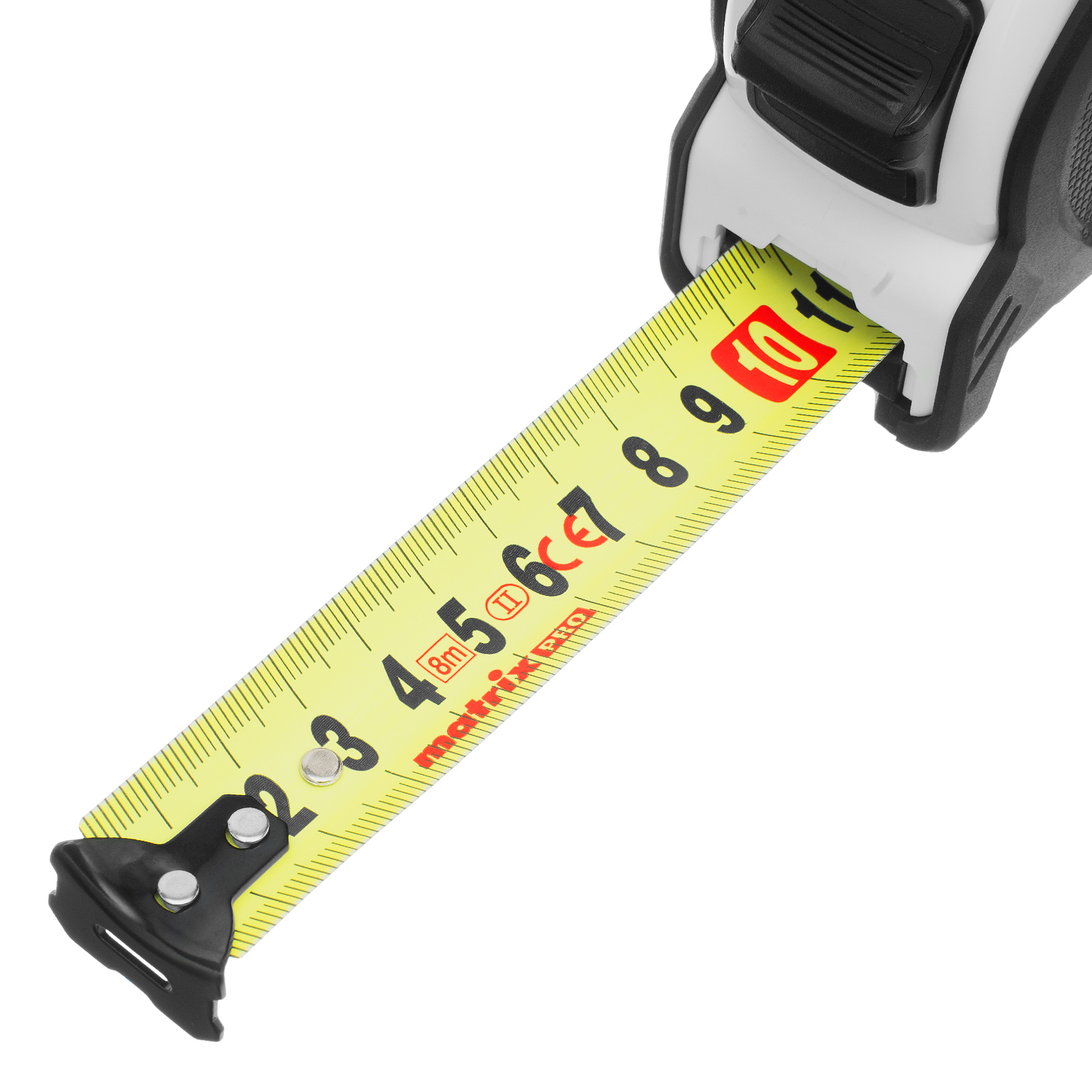 Рулетка Matrix PRO Neon 32593 в обрезиненном корпусе, с 3 механизмами фиксации ленты длиной 8 м и шириной 25 мм, служит для определения расстояний и размеров различных предметов. Крупные цифры на матовом желто-зеленом полотне хорошо видны, что облегчает считывание результатов. Измерительное полотно можно зафиксировать на нужной отметке при помощи стопора или одной из двух кнопок-пауз — это удобно при проведении большого количества замеров. Рулетка предназначена для выполнения профессиональных и бытовых измерительных работ.
