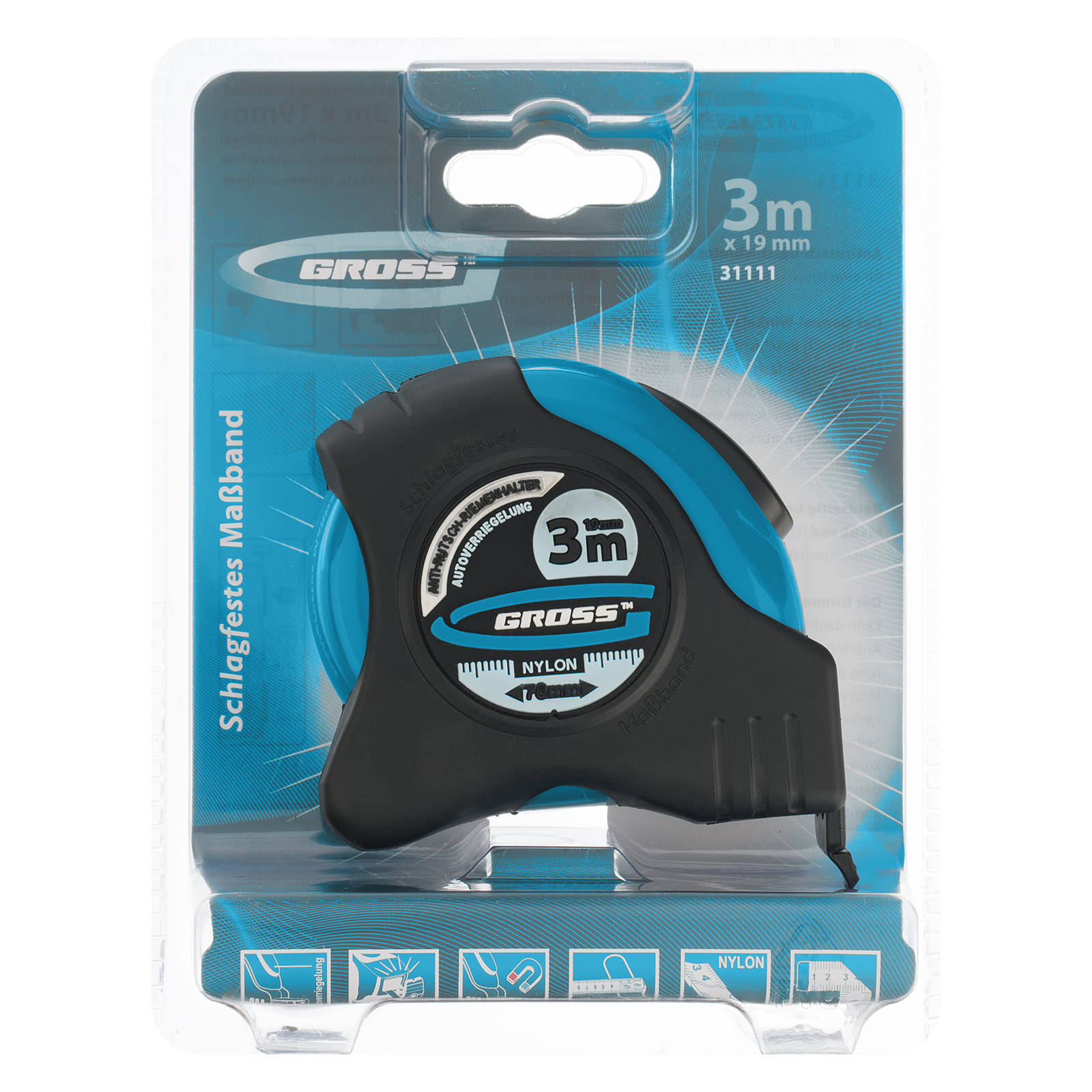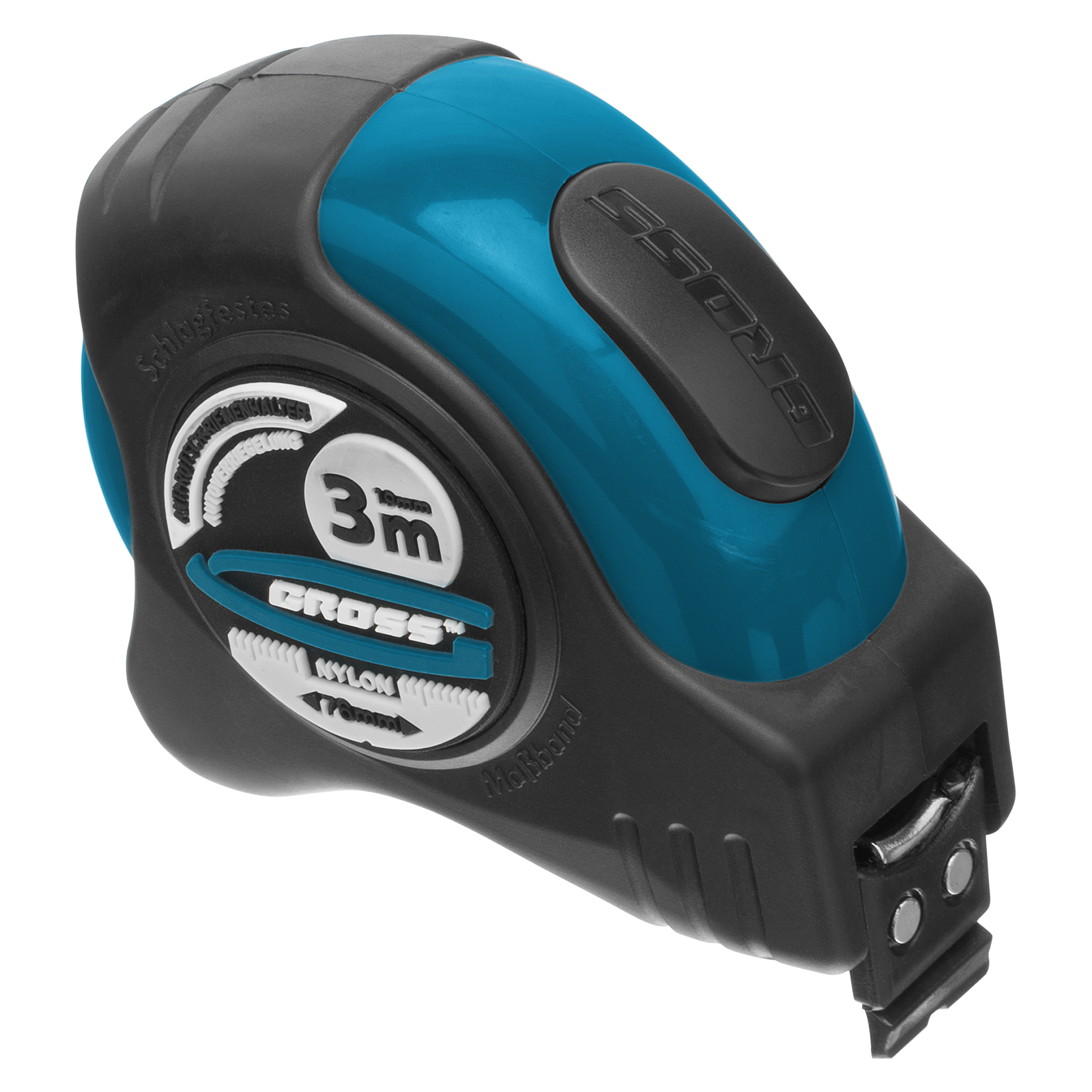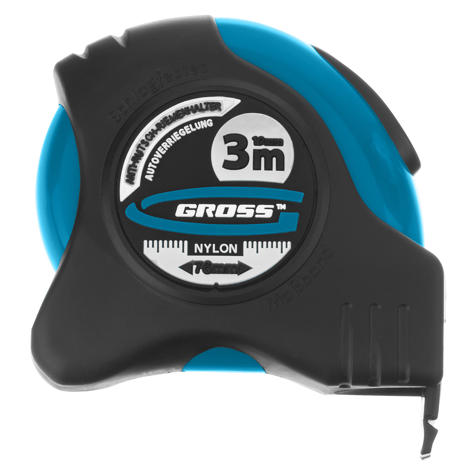 Рулетка "Schlagfest",3 м x 19 мм,магнитный обрезиненный зацеп,двусторонняя шкала,Нейлоновое покрытие,автоматическая фиксация Gross