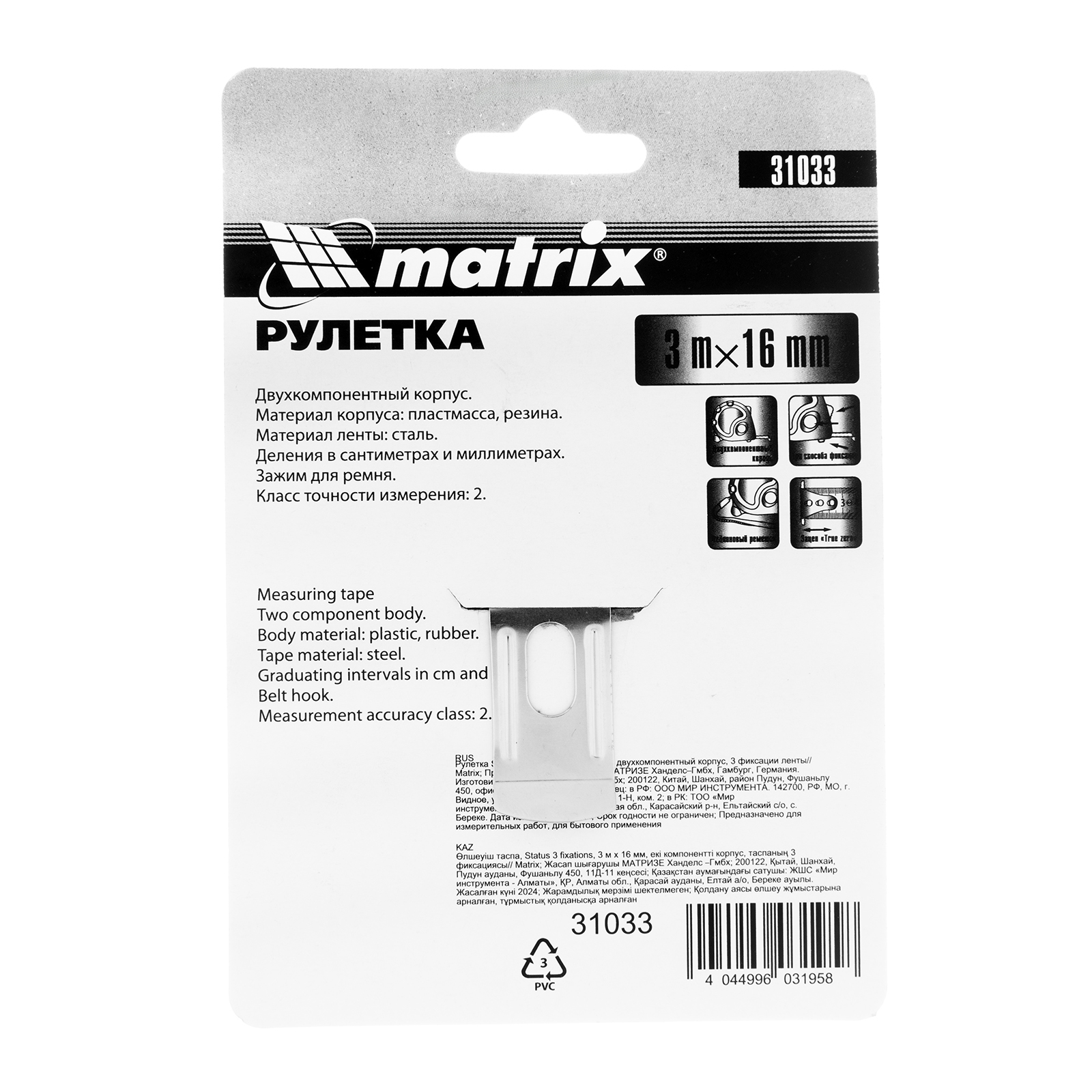 Рулетка Status 3 fixations,3 м х 16 мм,двухкомпонентный корпус,3 фиксации ленты Matrix