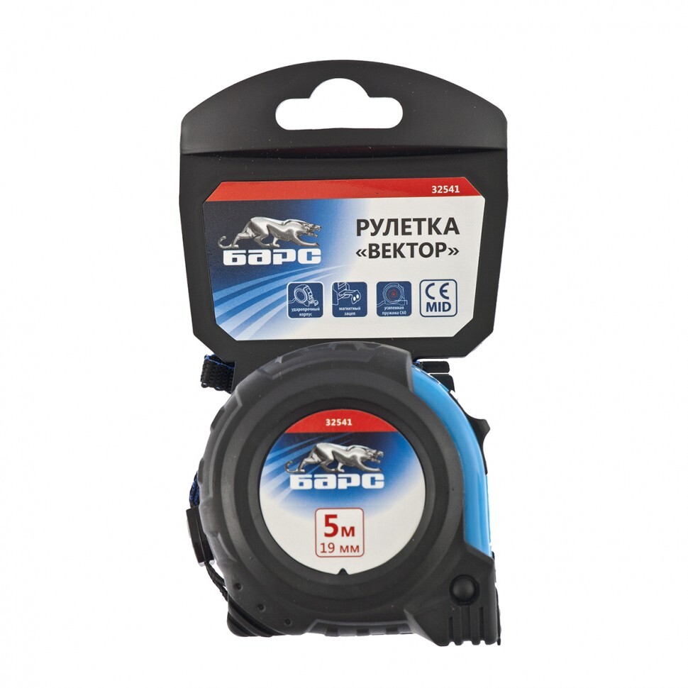 Рулетка Вектор 5 м х 19 мм,утолщенное полотно,магнитный зацеп,обрезиненный корпус Барс